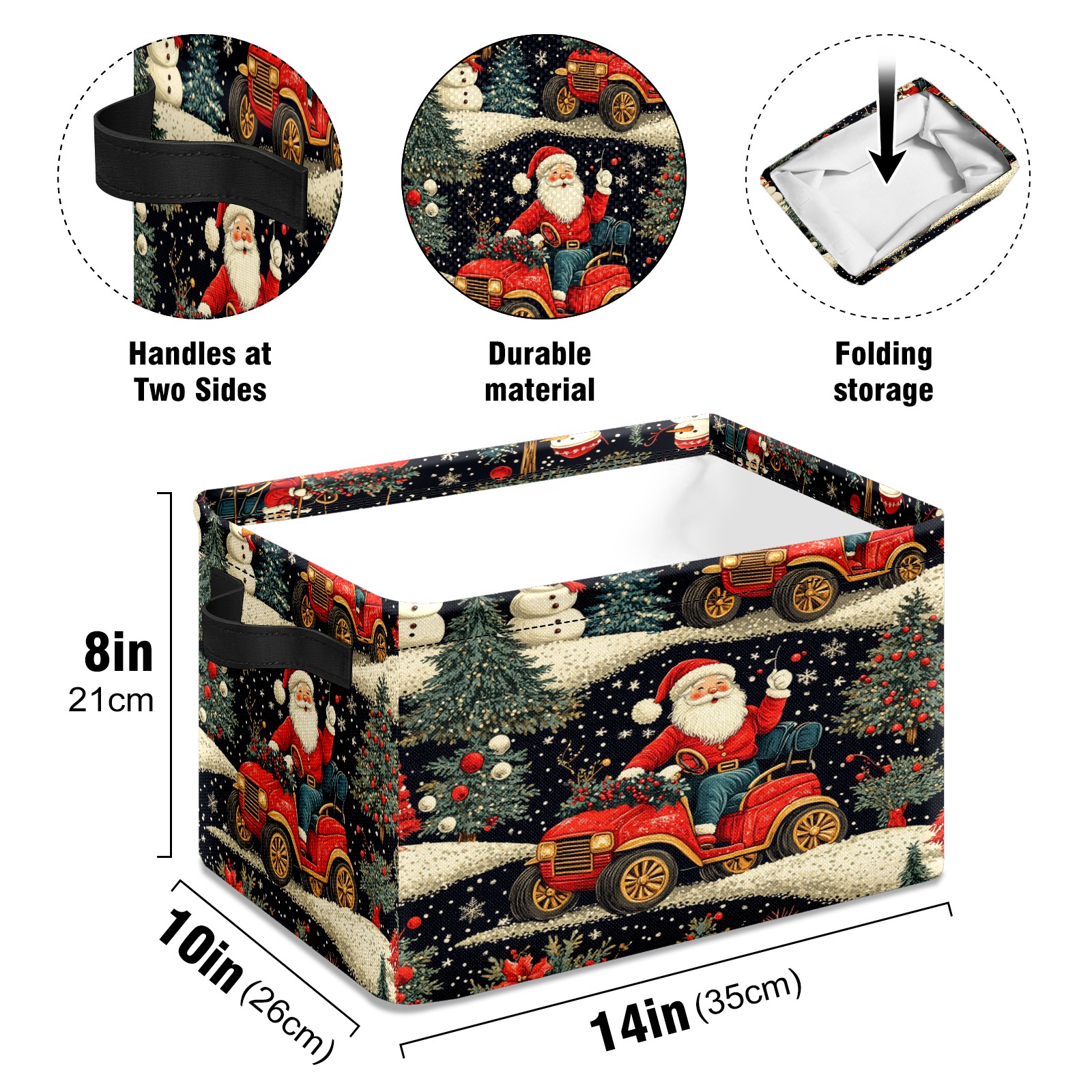 <p>This storage basket can be used for a variety of purposes, including bedroom organization baskets, laundry storage boxes, toy storage boxes, bathroom towel cube storage boxes, toilet storage containers, book and magazine storage boxes, holiday decoration storage cubes, living room storage, etc. The spacious size of 10×14×8 inches gives it ample storage capacity. This Christmas-themed storage basket is a great household item that combines practicality with a festive atmosphere! Made of easy-to-clean Oxford cloth, daily dirt can be cleaned by gently wiping with mild soapy water. With a sturdy metal frame and hard bottom support, it ensures a crisp shape when stored, but also needs to avoid machine washing to extend its service life. It is lightweight and flat after folding, taking up no space</p>