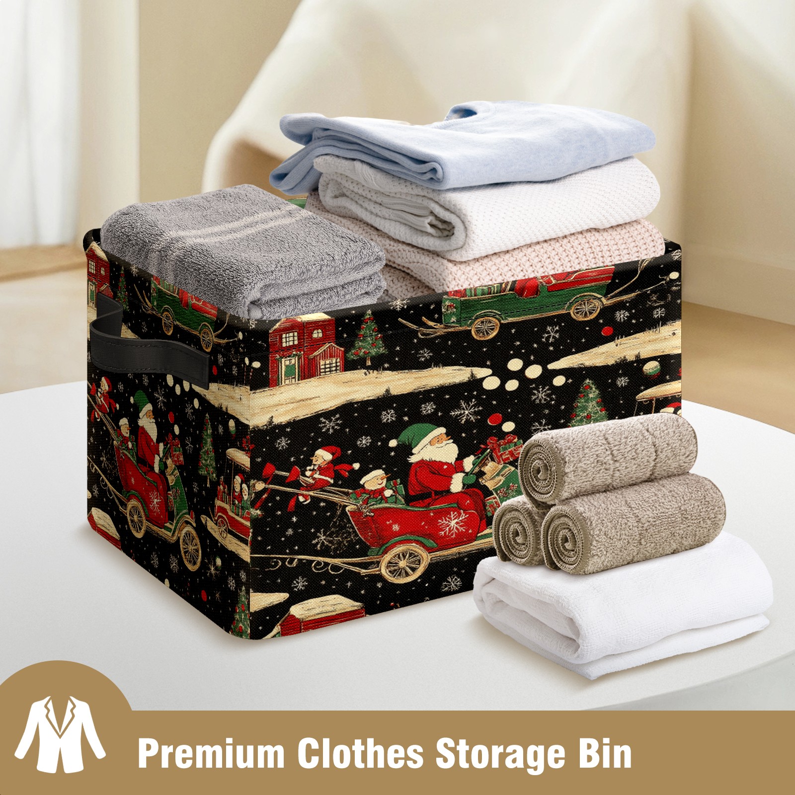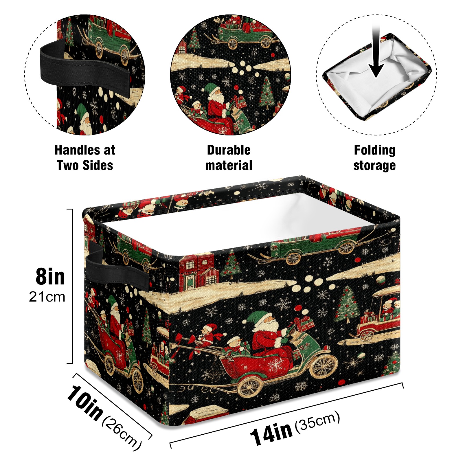 <p>This storage basket can be used for a variety of purposes, including bedroom organization baskets, laundry storage boxes, toy storage boxes, bathroom towel cube storage boxes, toilet storage containers, book and magazine storage boxes, holiday decoration storage cubes, living room storage, etc. The spacious size of 10×14×8 inches gives it ample storage capacity. This Christmas-themed storage basket is a great household item that combines practicality with a festive atmosphere! Made of easy-to-clean Oxford cloth, daily dirt can be cleaned by gently wiping with mild soapy water. With a sturdy metal frame and hard bottom support, it ensures a crisp shape when stored, but also needs to avoid machine washing to extend its service life. It is lightweight and flat after folding, taking up no space</p>