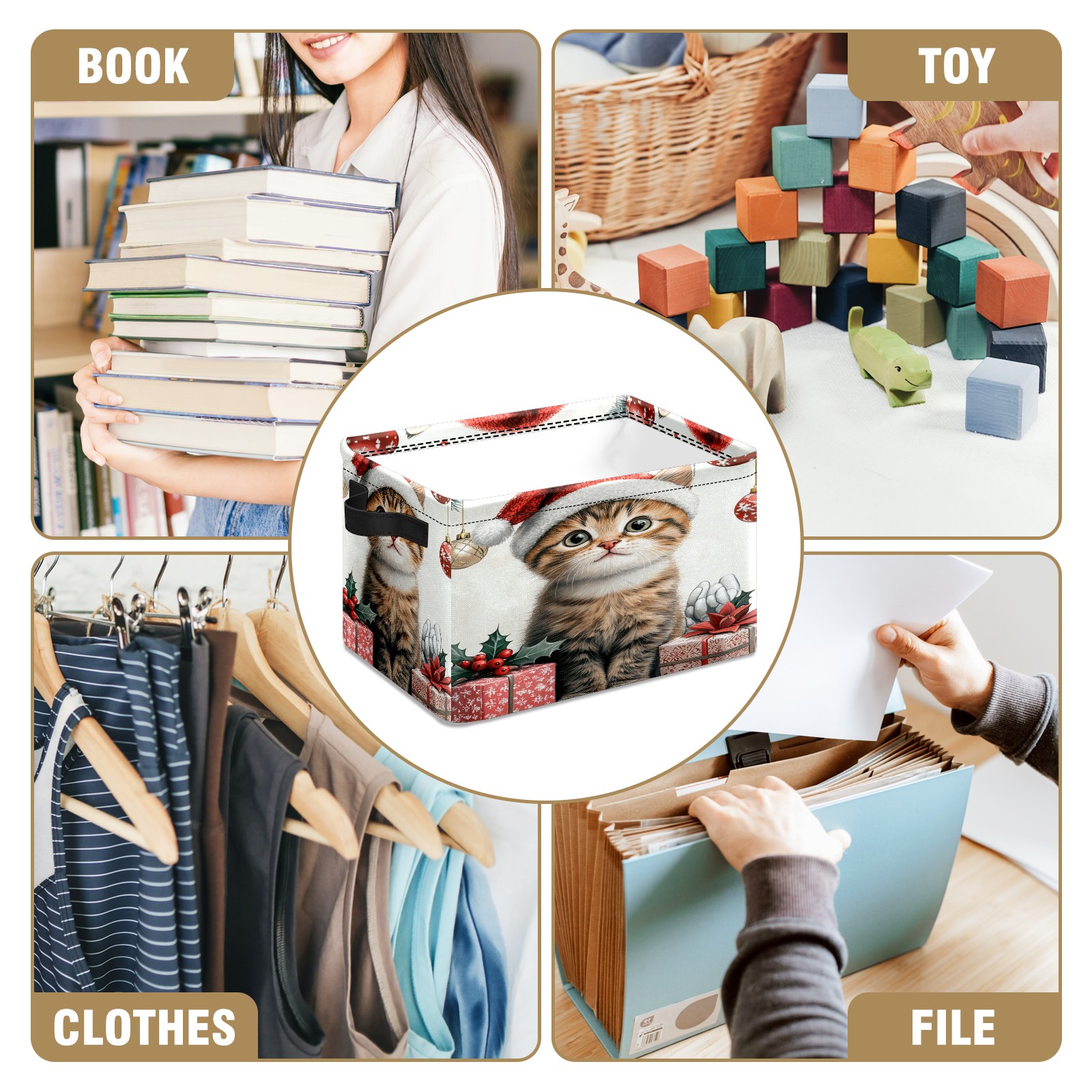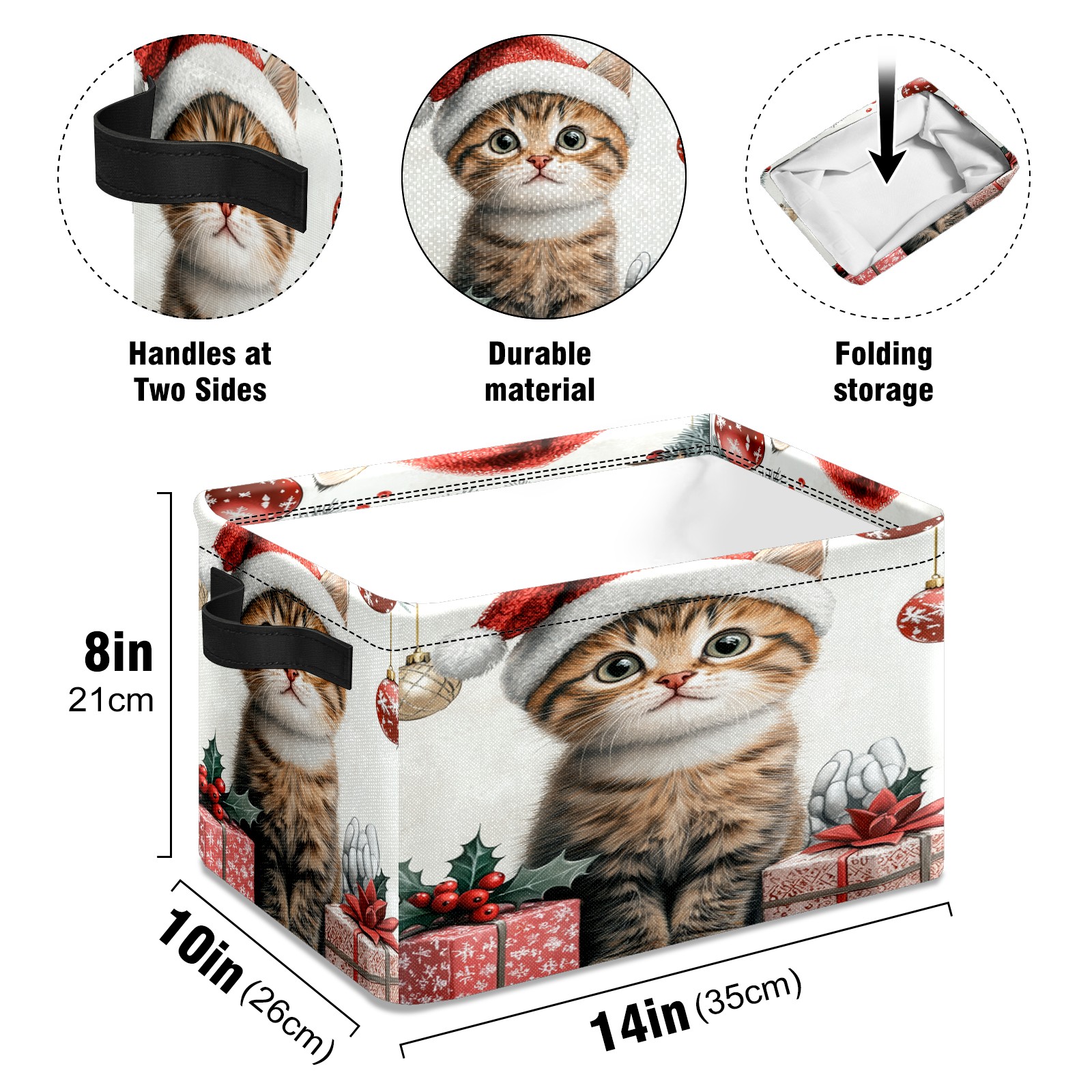 <p>This storage basket can be used for a variety of purposes, including bedroom organization baskets, laundry storage boxes, toy storage boxes, bathroom towel cube storage boxes, toilet storage containers, book and magazine storage boxes, holiday decoration storage cubes, living room storage, etc. The spacious size of 10×14×8 inches gives it ample storage capacity. This Christmas-themed storage basket is a great household item that combines practicality with a festive atmosphere! Made of easy-to-clean Oxford cloth, daily dirt can be cleaned by gently wiping with mild soapy water. With a sturdy metal frame and hard bottom support, it ensures a crisp shape when stored, but also needs to avoid machine washing to extend its service life. It is lightweight and flat after folding, taking up no space</p>