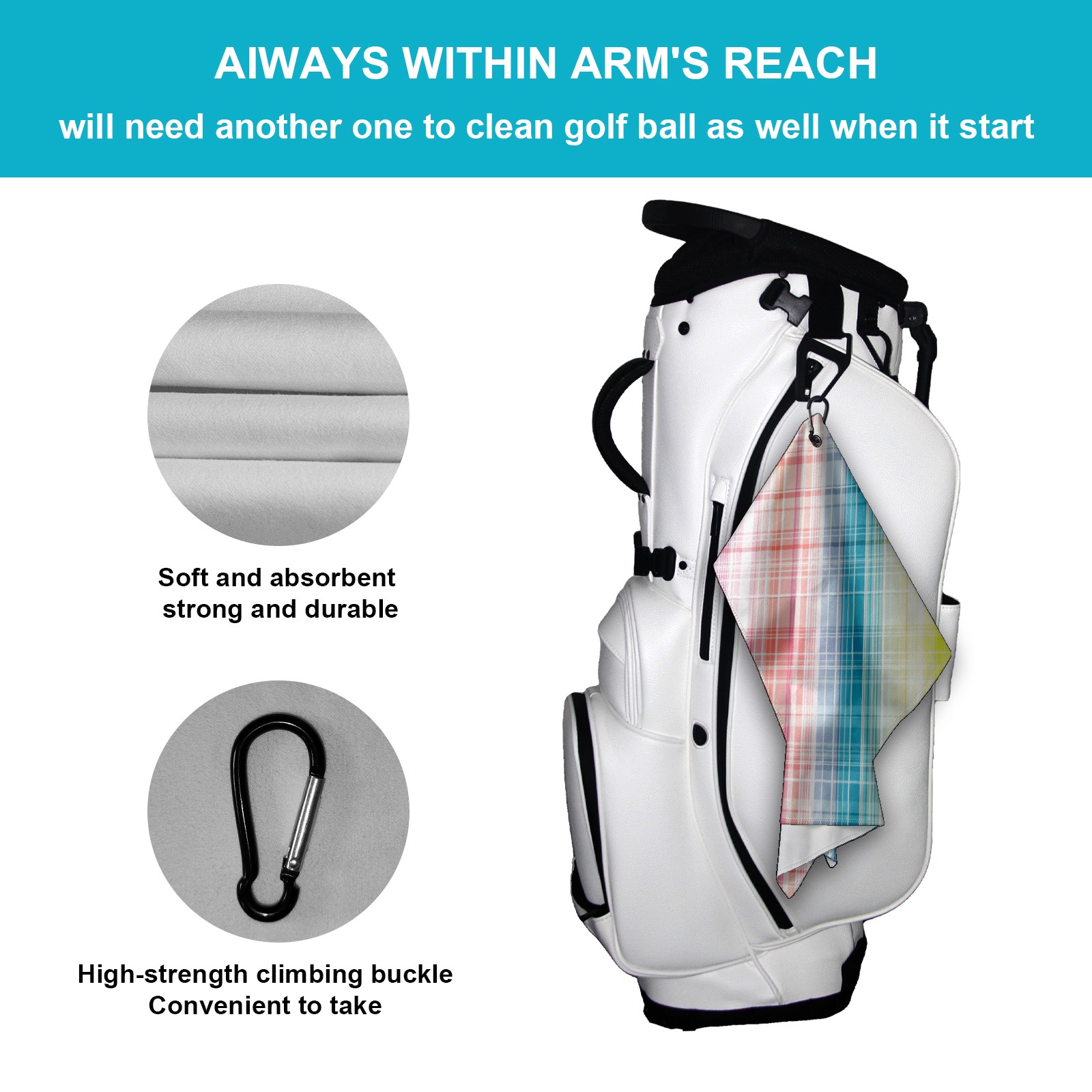 • <p>Designed to care for clubs and balls, this high performance golf towel is a compact and portable 15.7 in x 23.6 in size that cleans precisely without taking up space in your bag.&nbsp;</p> <p>The polyester material creates a dense cleaning network that absorbs dust and grass clippings and removes divot stains in a single wipe.&nbsp;</p> <p>Durable, absorbent fabric stays fluffy through multiple washes and dries quickly when hung, eliminating damp odors. The buckle clip design attaches to the side of the bag for easy access and natural air drying while walking, keeping the towel dry and efficient at all times.&nbsp;</p> <p>Whether it's wiping the ball before teeing off or cleaning the club face on the green side, it's a practical aid for golfers who want to keep their equipment looking fresh and new.</p>