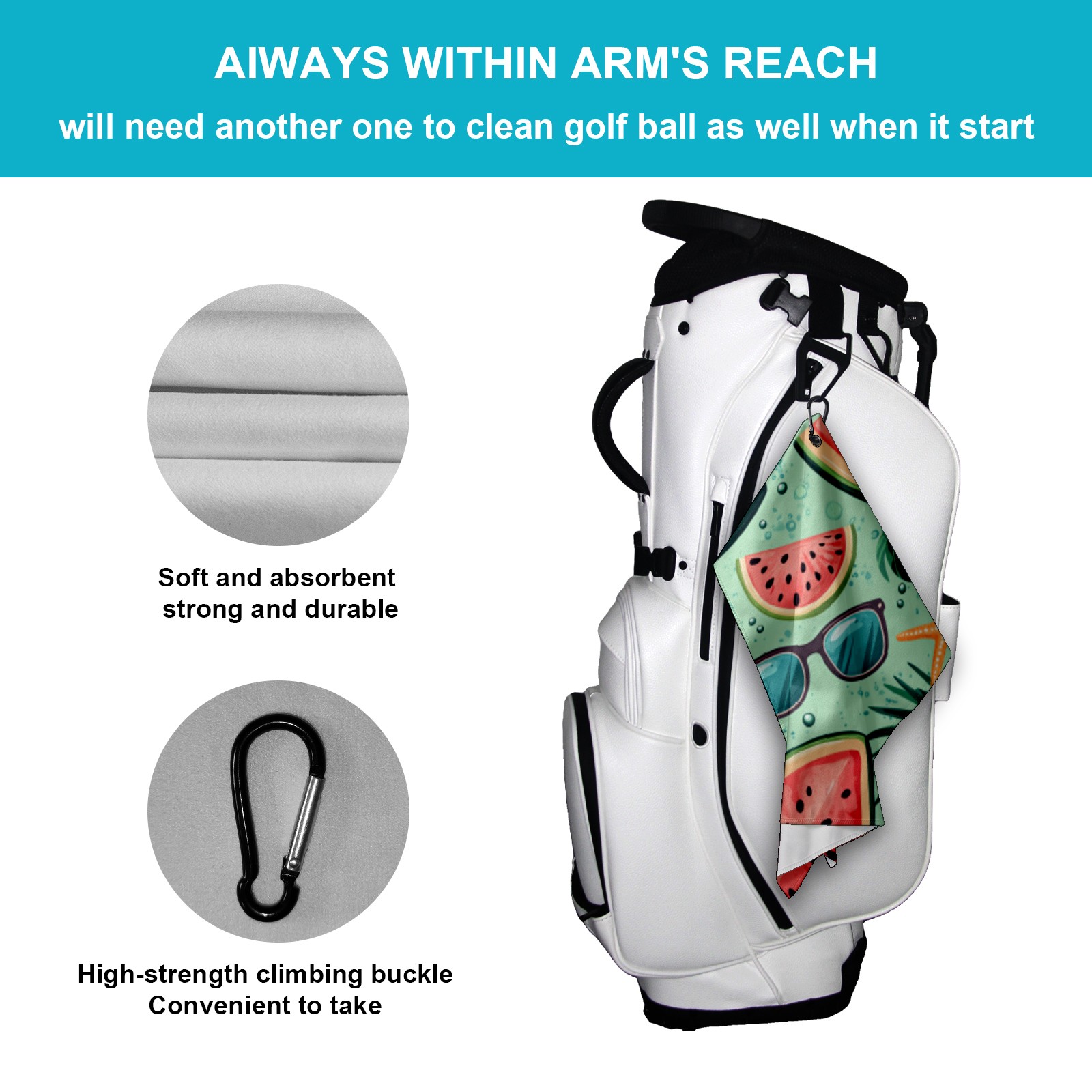 • <p>Designed to care for clubs and balls, this high performance golf towel is a compact and portable 15.7 in x 23.6 in size that cleans precisely without taking up space in your bag.&nbsp;</p> <p>The polyester material creates a dense cleaning network that absorbs dust and grass clippings and removes divot stains in a single wipe.&nbsp;</p> <p>Durable, absorbent fabric stays fluffy through multiple washes and dries quickly when hung, eliminating damp odors. The buckle clip design attaches to the side of the bag for easy access and natural air drying while walking, keeping the towel dry and efficient at all times.&nbsp;</p> <p>Whether it's wiping the ball before teeing off or cleaning the club face on the green side, it's a practical aid for golfers who want to keep their equipment looking fresh and new.</p>