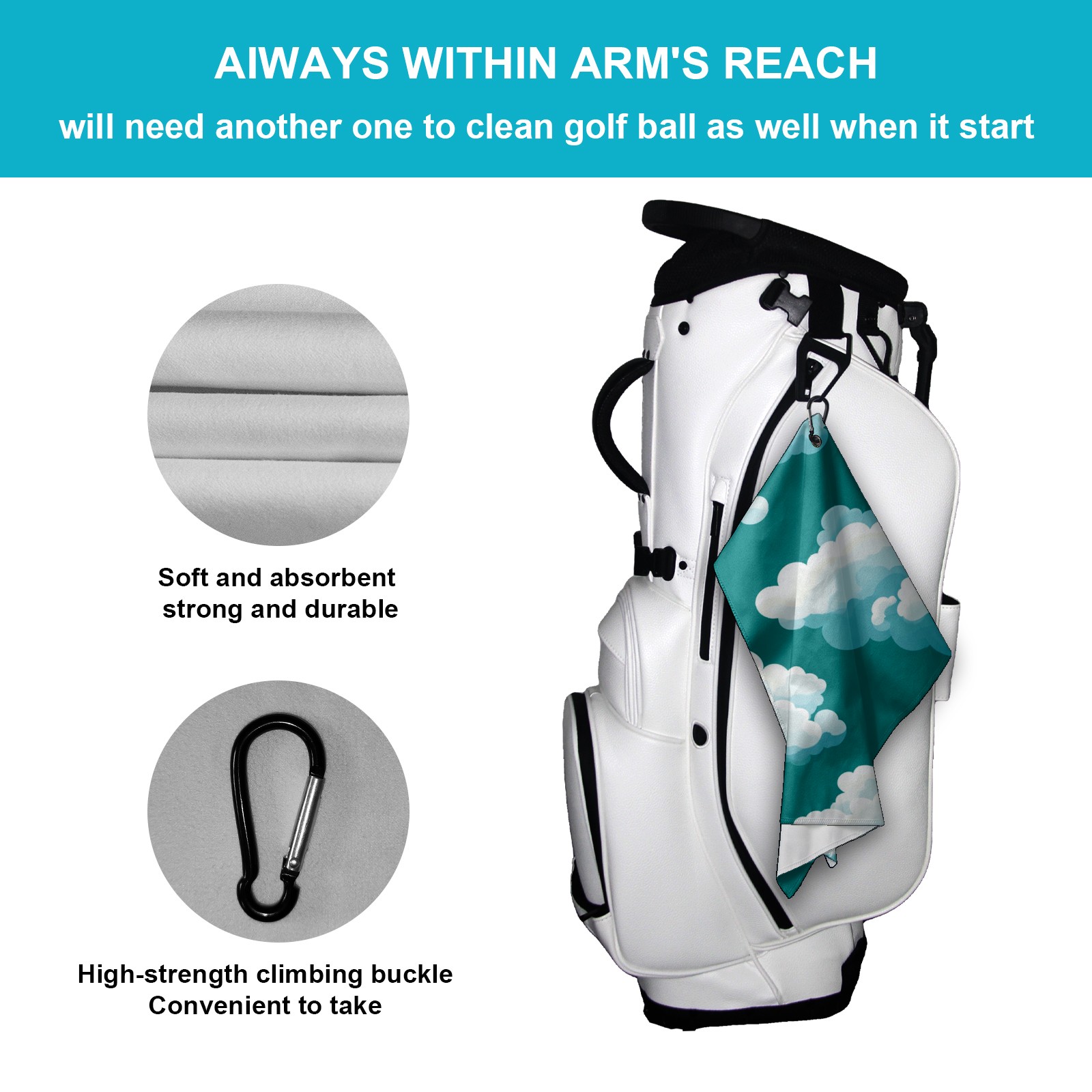 • <p>Designed to care for clubs and balls, this high performance golf towel is a compact and portable 15.7 in x 23.6 in size that cleans precisely without taking up space in your bag.&nbsp;</p> <p>The polyester material creates a dense cleaning network that absorbs dust and grass clippings and removes divot stains in a single wipe.&nbsp;</p> <p>Durable, absorbent fabric stays fluffy through multiple washes and dries quickly when hung, eliminating damp odors. The buckle clip design attaches to the side of the bag for easy access and natural air drying while walking, keeping the towel dry and efficient at all times.&nbsp;</p> <p>Whether it's wiping the ball before teeing off or cleaning the club face on the green side, it's a practical aid for golfers who want to keep their equipment looking fresh and new.</p>