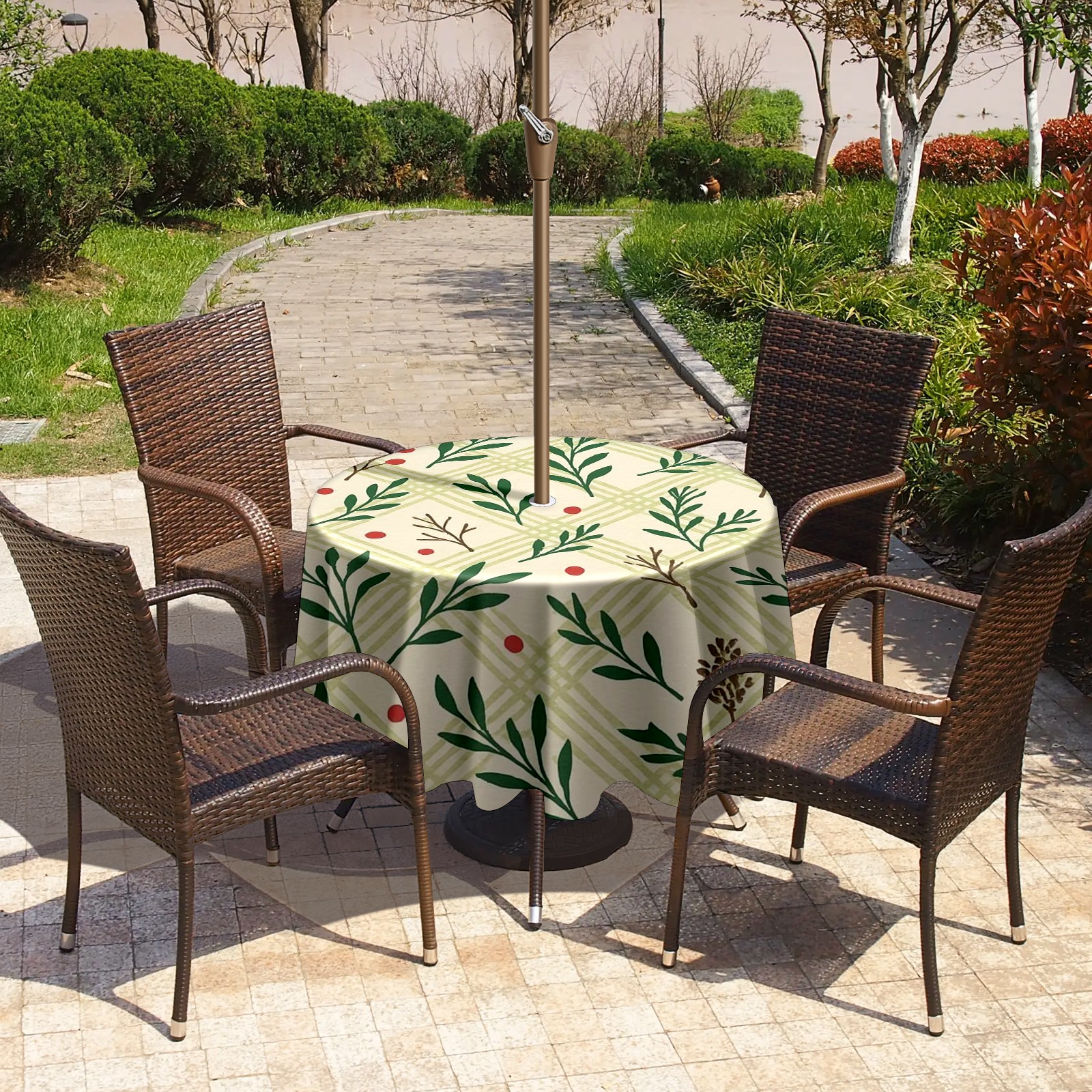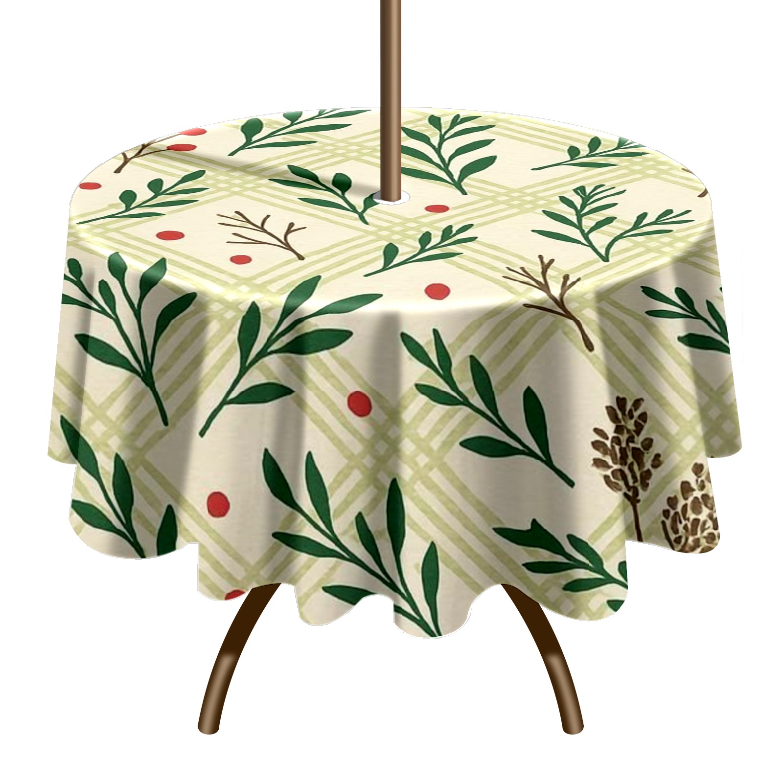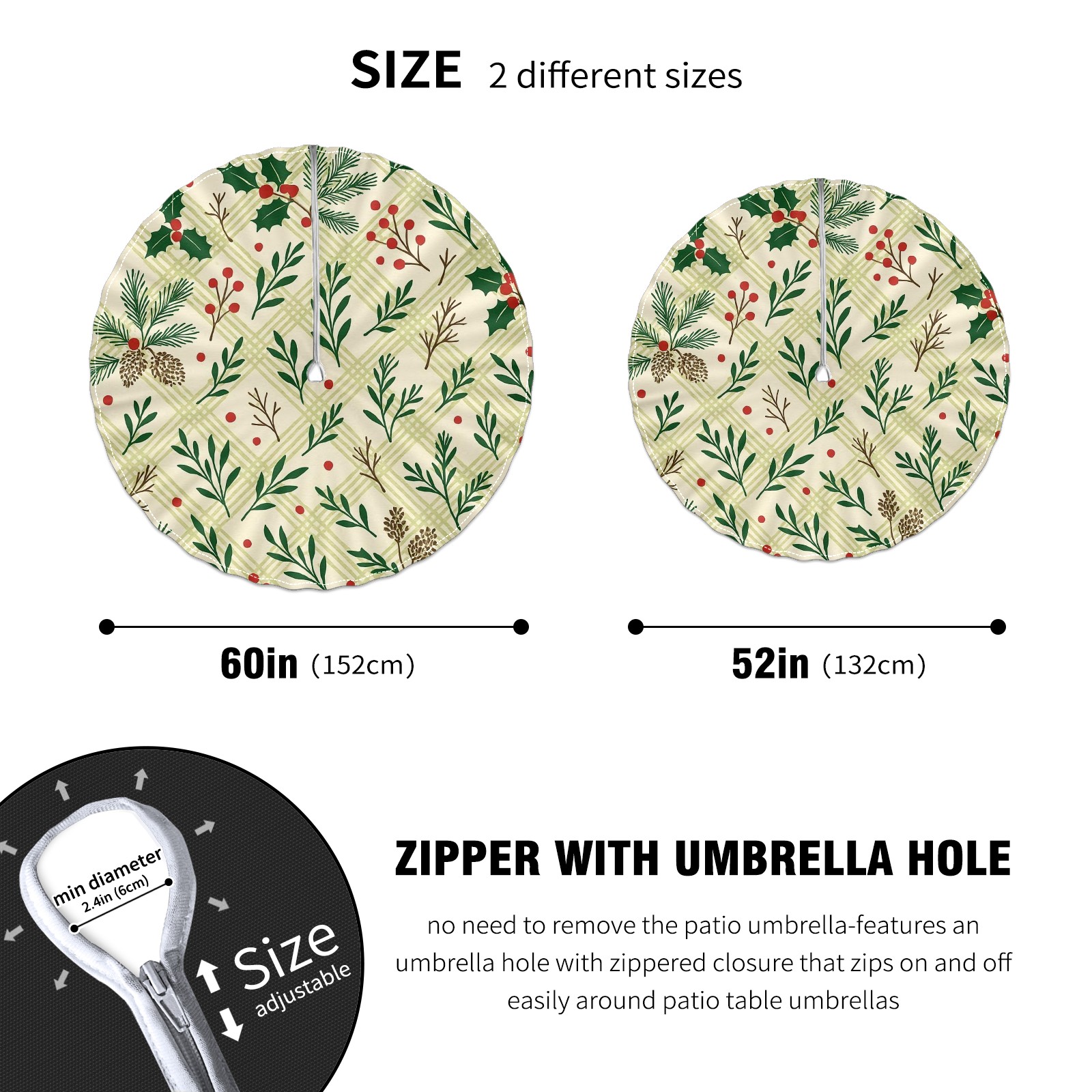 Round Tablecloth Holly Leaf Green Floral with Umbrella Hole & Zipper, All-Weather Waterproof Outdoor Patio Cover, 60 Inch Fits 4-6 Seater, Easy Installation, Holly Leaf Green Floral