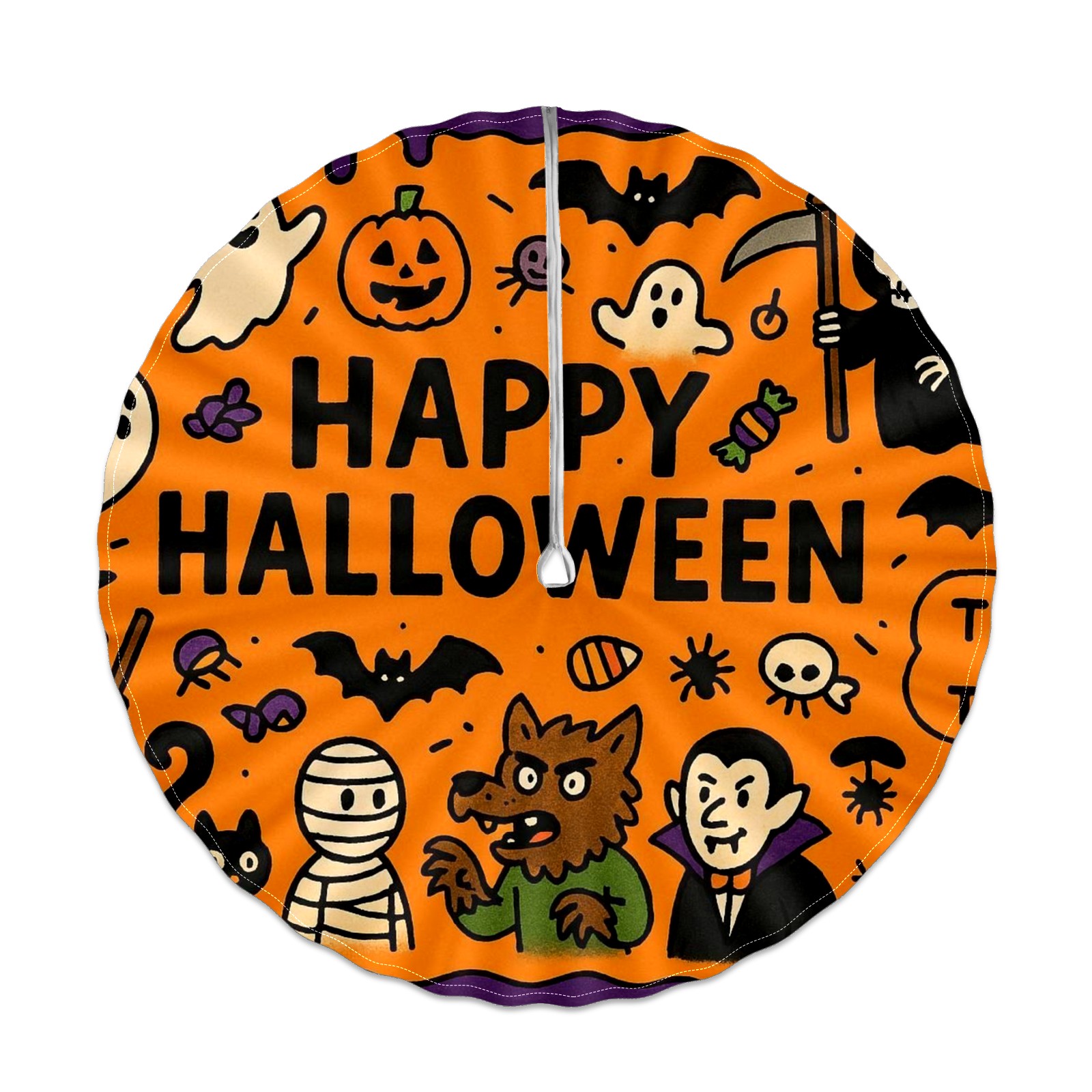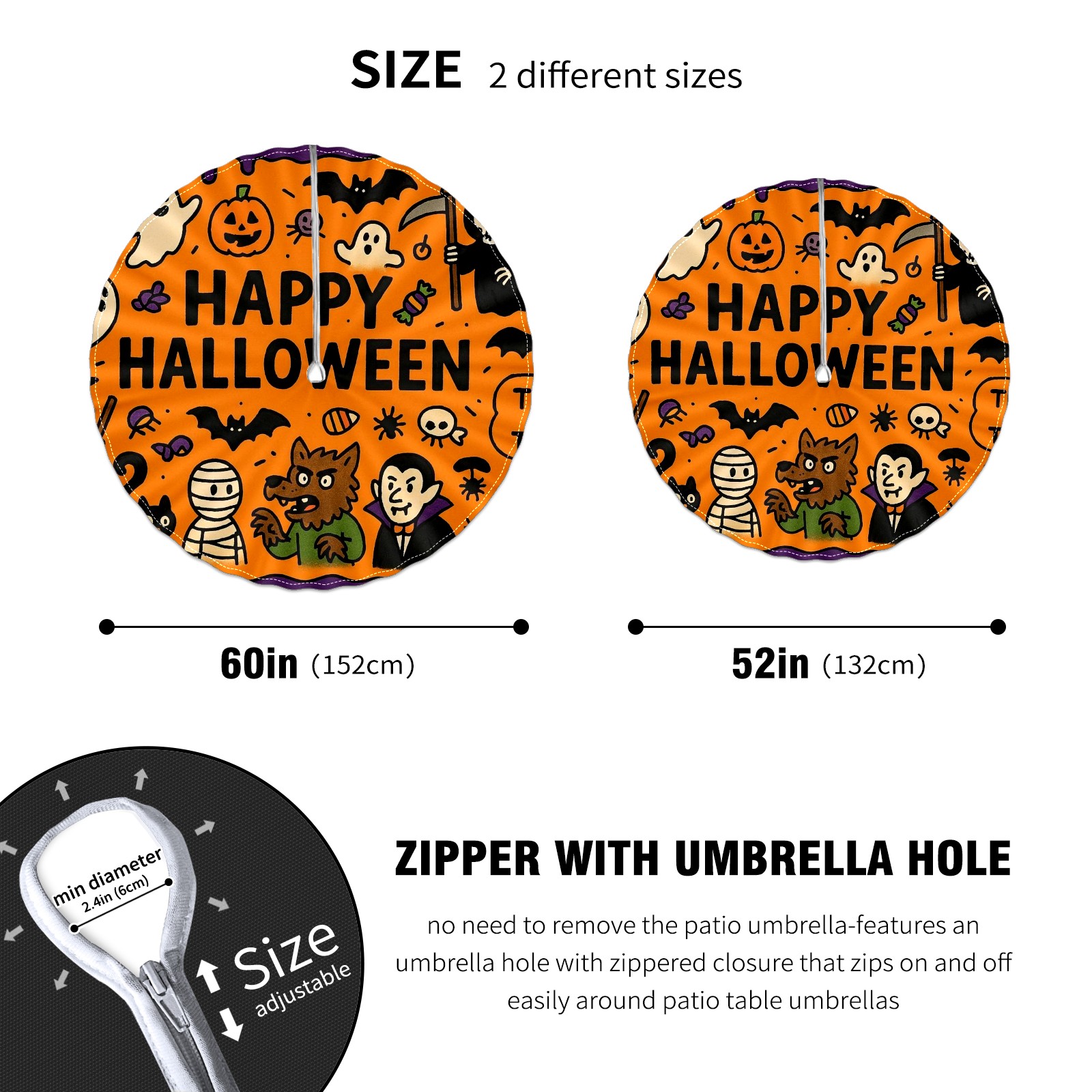 Round Tablecloth Halloween Elements OrangeBlack Floral with Umbrella Hole & Zipper, All-Weather Waterproof Outdoor Patio Cover, 60 Inch Fits 4-6 Seater, Easy Installation, Halloween Elements OrangeBlack Floral