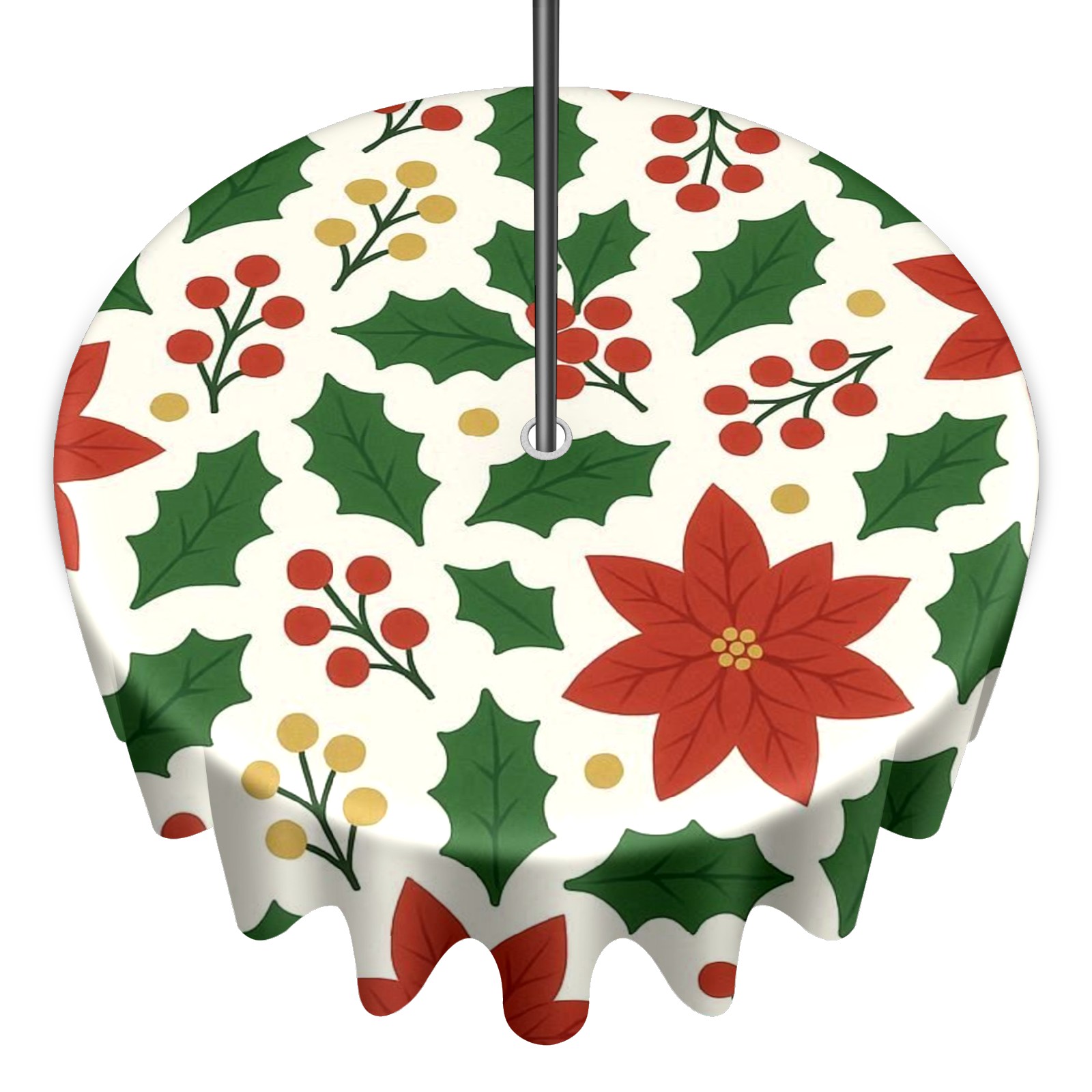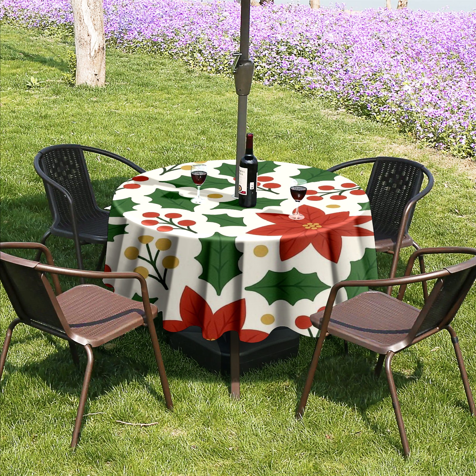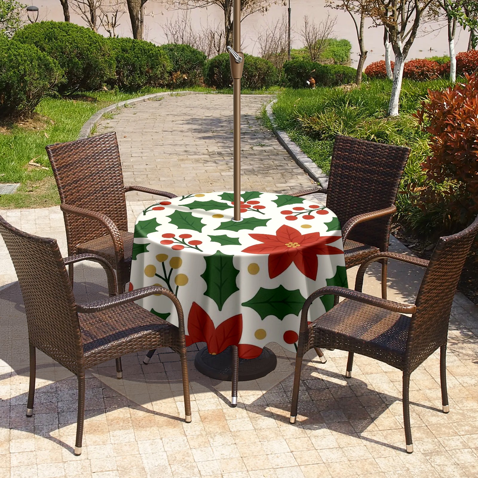 Round Tablecloth Poinsettia Red Green Floral with Umbrella Hole & Zipper, All-Weather Waterproof Outdoor Patio Cover, 60 Inch Fits 4-6 Seater, Easy Installation, Poinsettia Red Green Floral