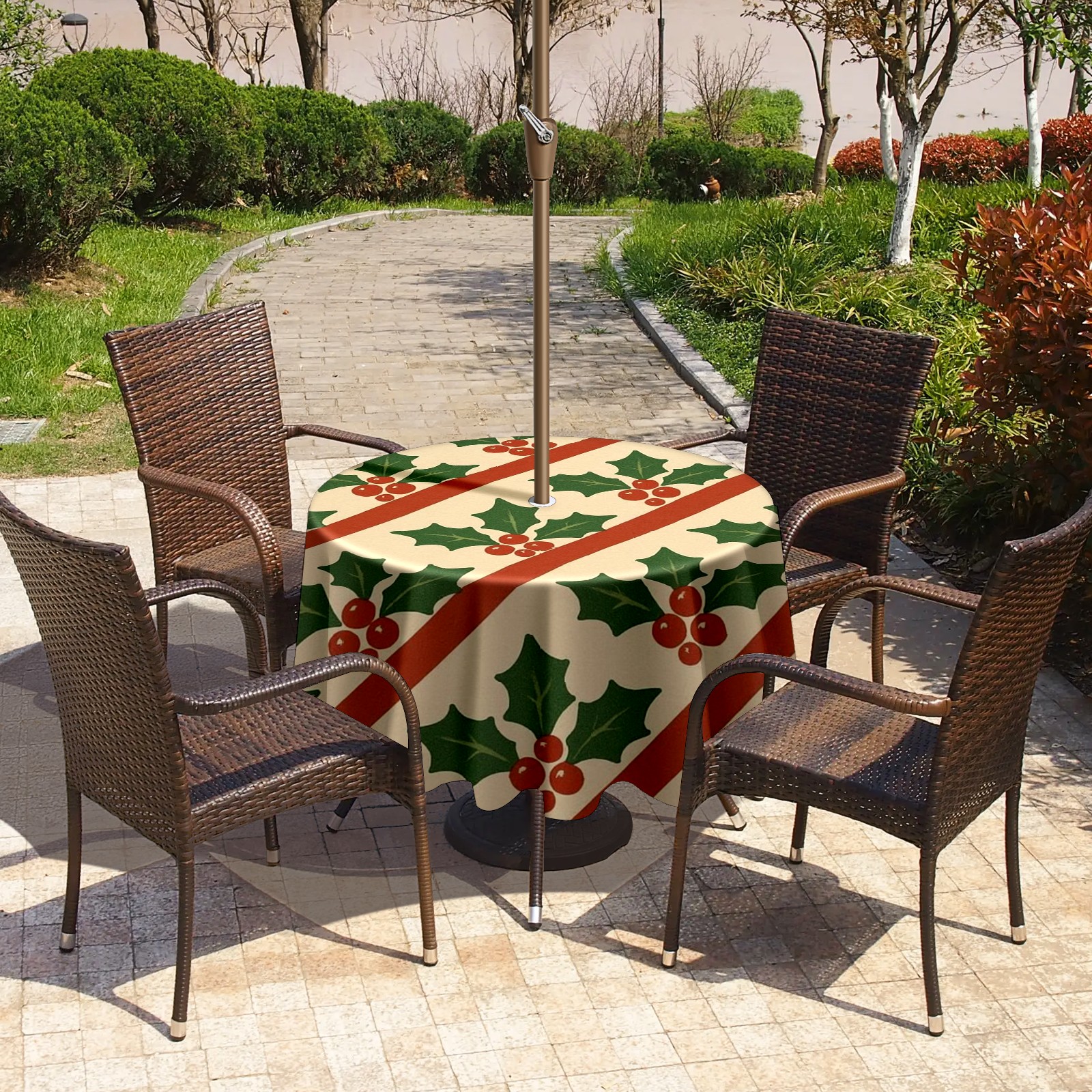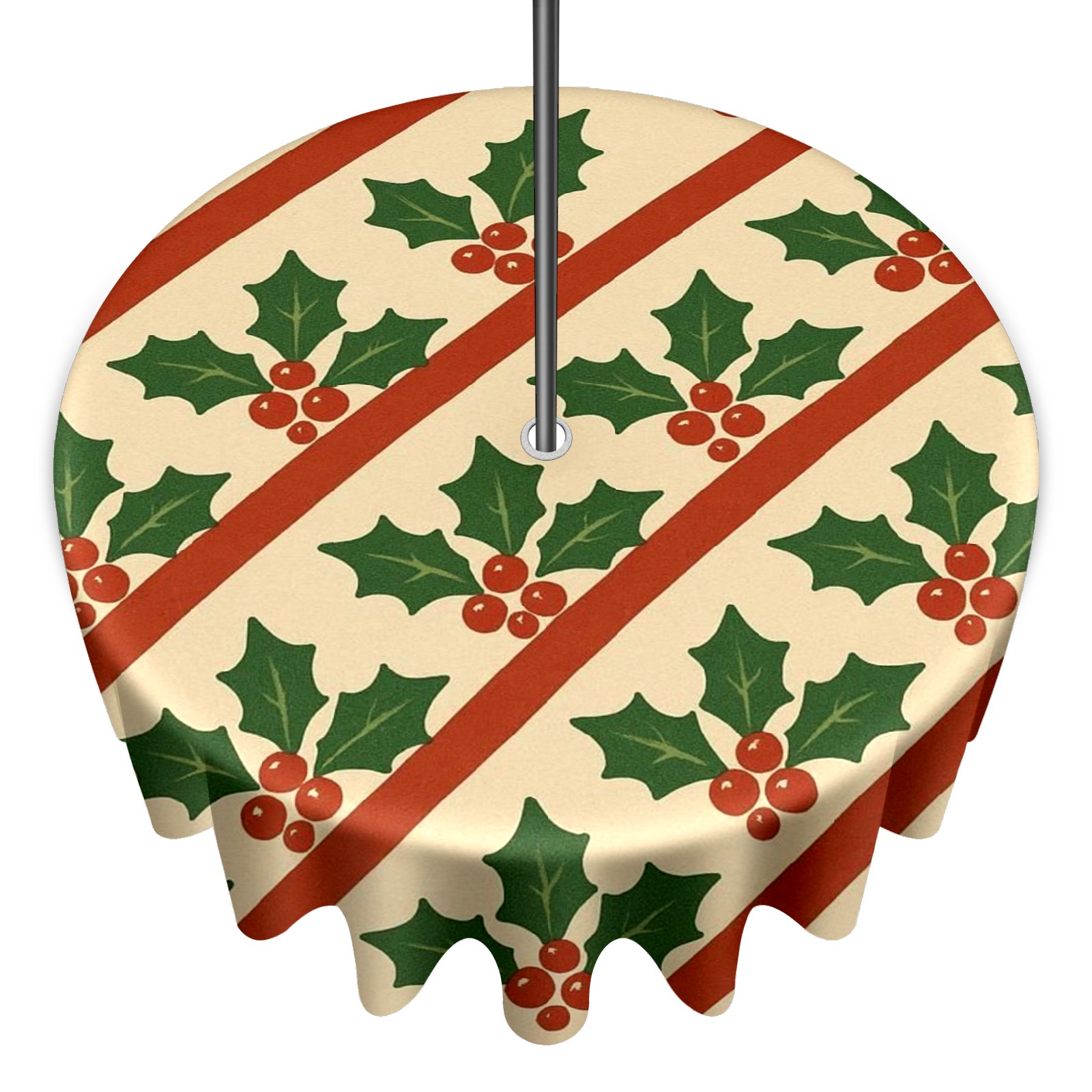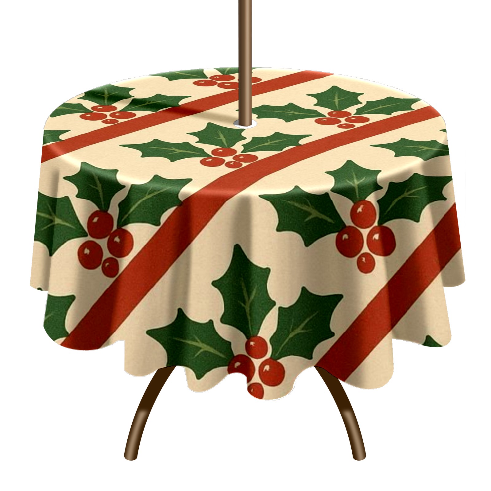 Round Tablecloth Holly Leaf Beige Red Green Striped with Umbrella Hole & Zipper, All-Weather Waterproof Outdoor Patio Cover, 60 Inch Fits 4-6 Seater, Easy Installation, Holly Leaf Beige Red Green Striped