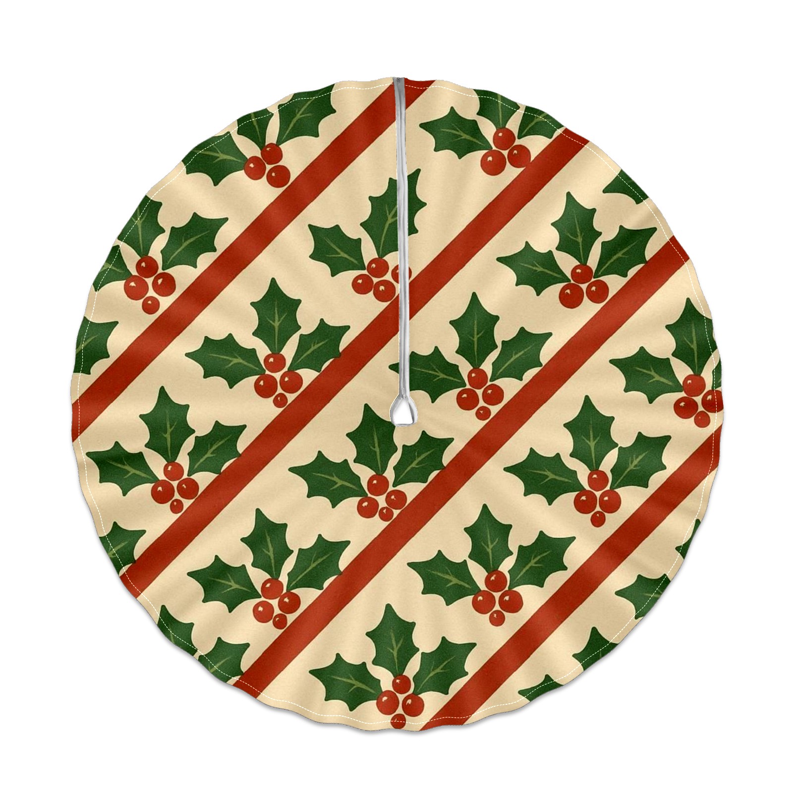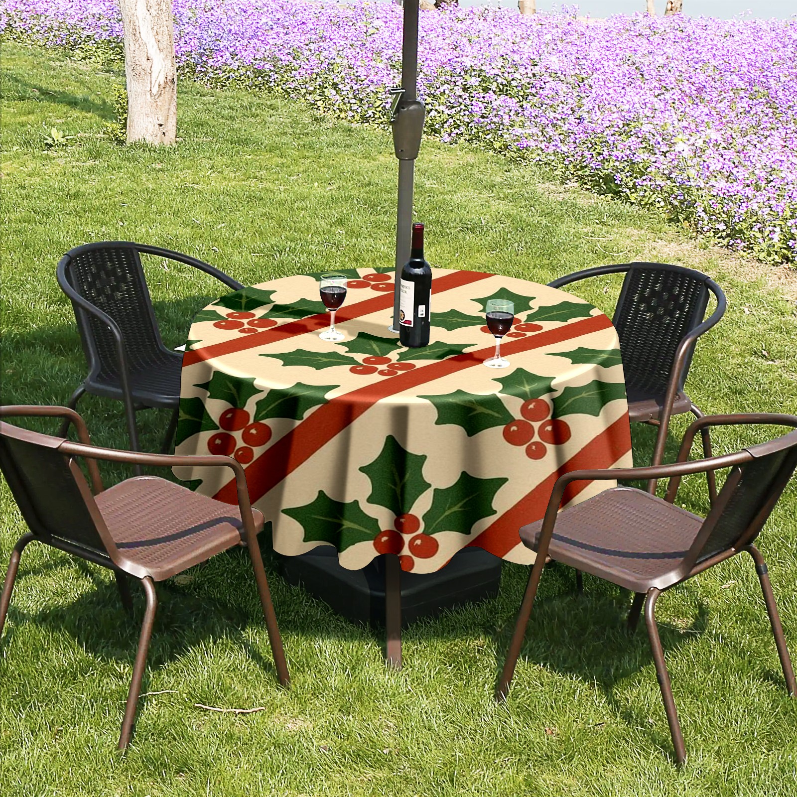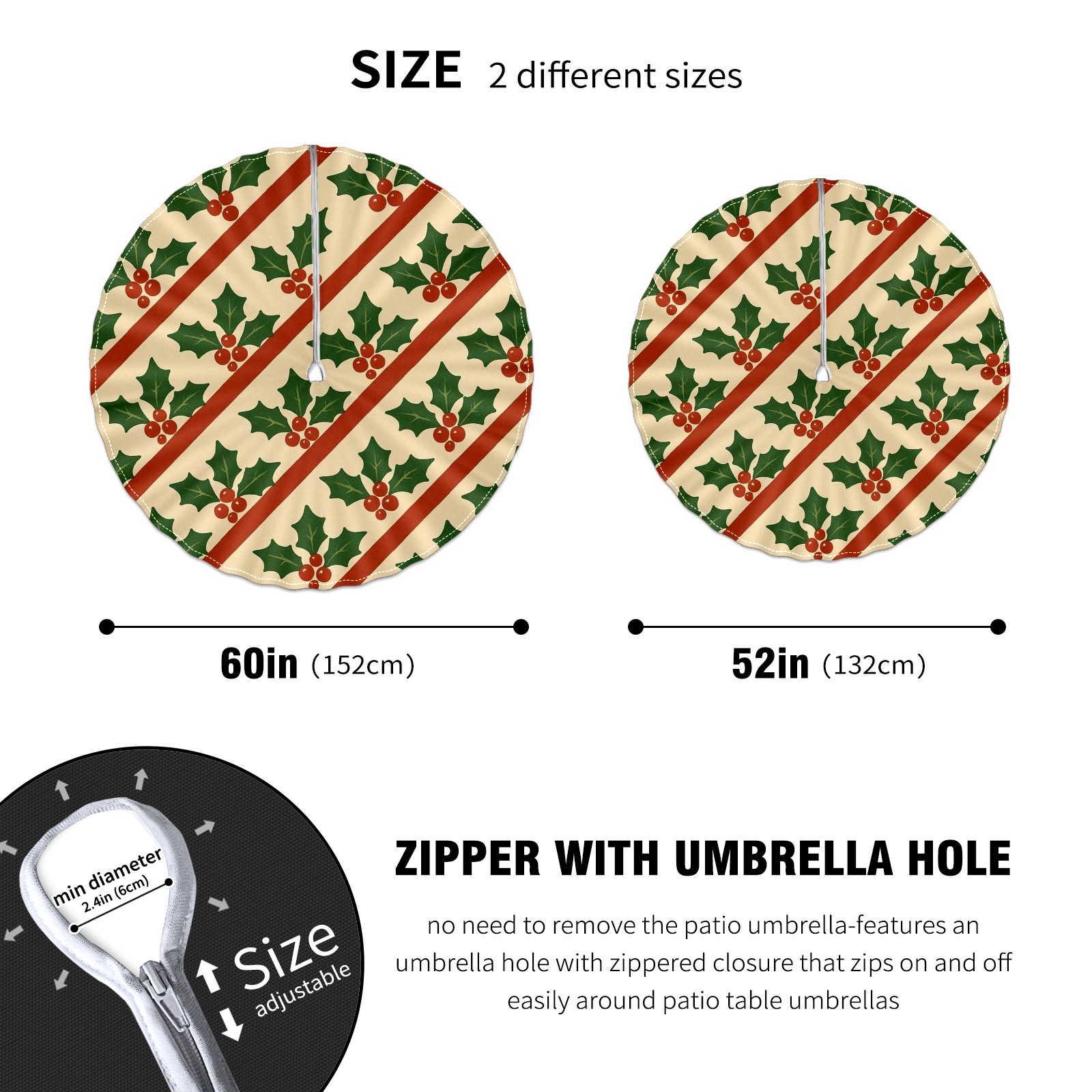 Round Tablecloth Holly Leaf Beige Red Green Striped with Umbrella Hole & Zipper, All-Weather Waterproof Outdoor Patio Cover, 60 Inch Fits 4-6 Seater, Easy Installation, Holly Leaf Beige Red Green Striped