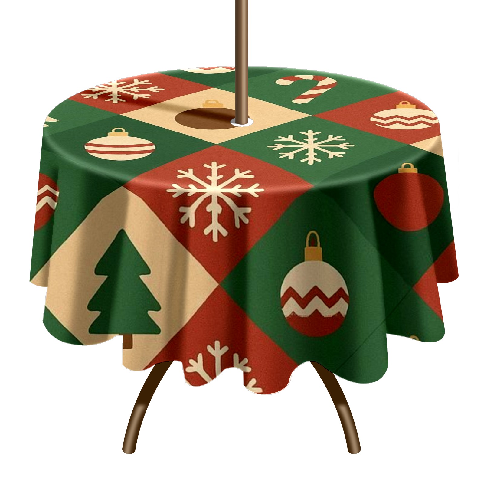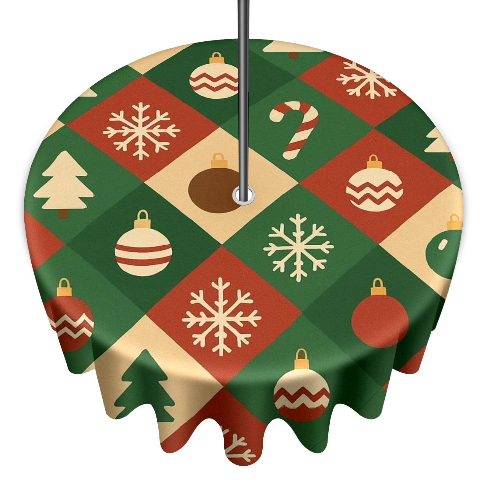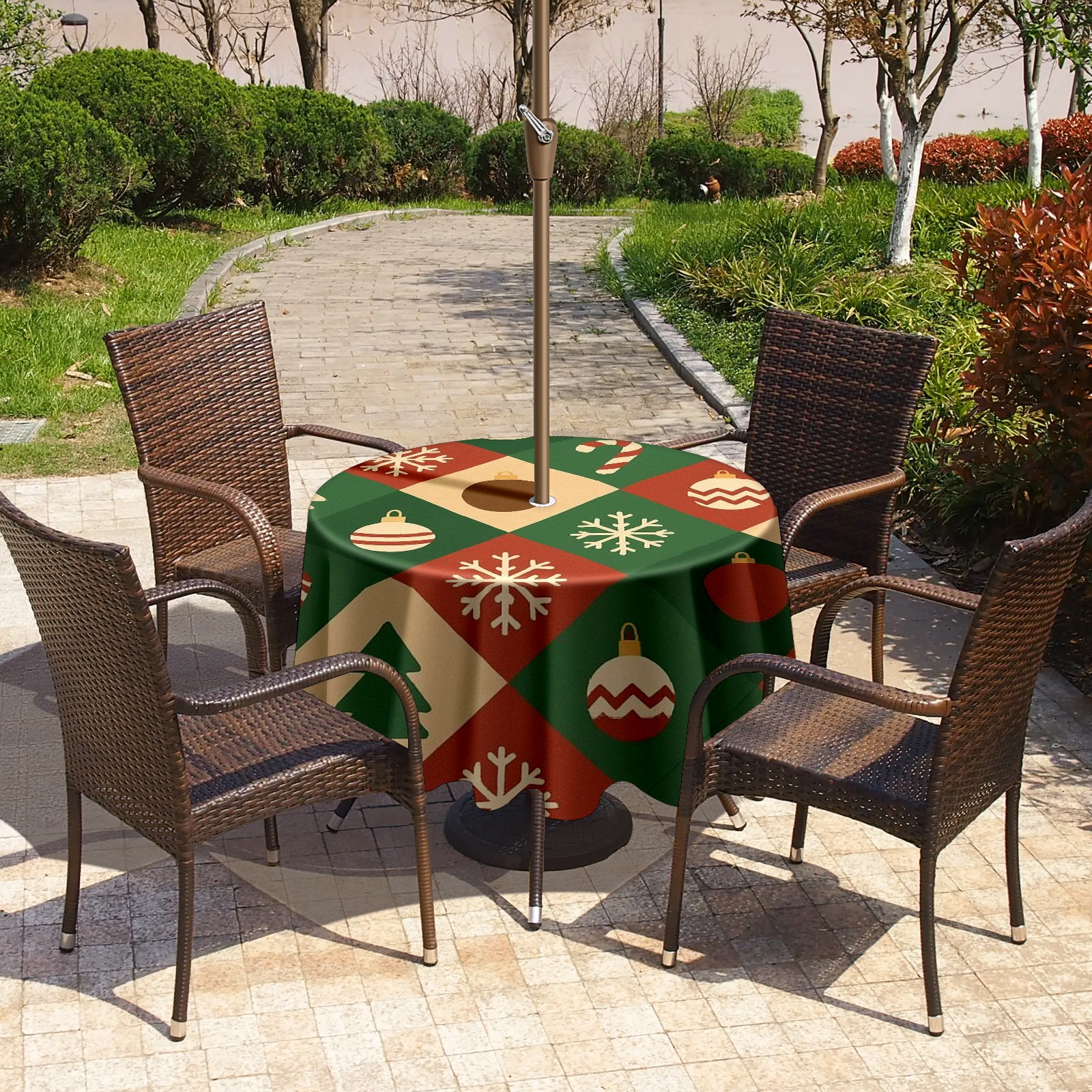Round Tablecloth Christmas Diamond Red Green Patchwork with Umbrella Hole & Zipper, All-Weather Waterproof Outdoor Patio Cover, 60 Inch Fits 4-6 Seater, Easy Installation, Christmas Diamond Red Green Patchwork