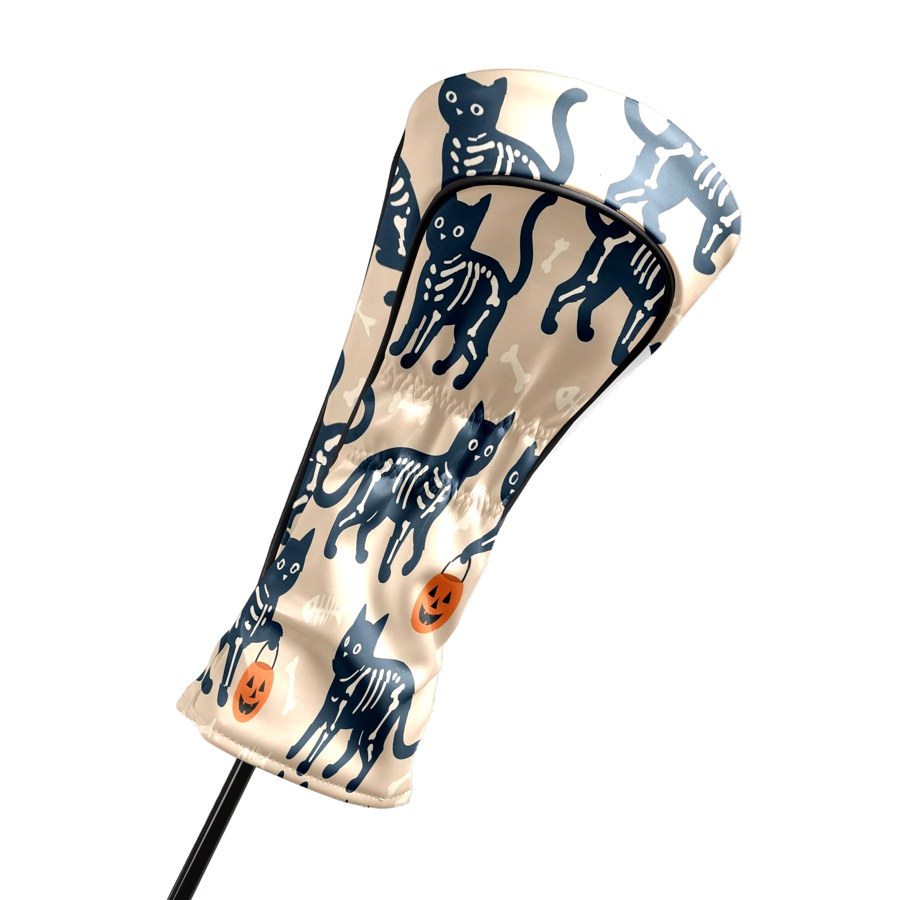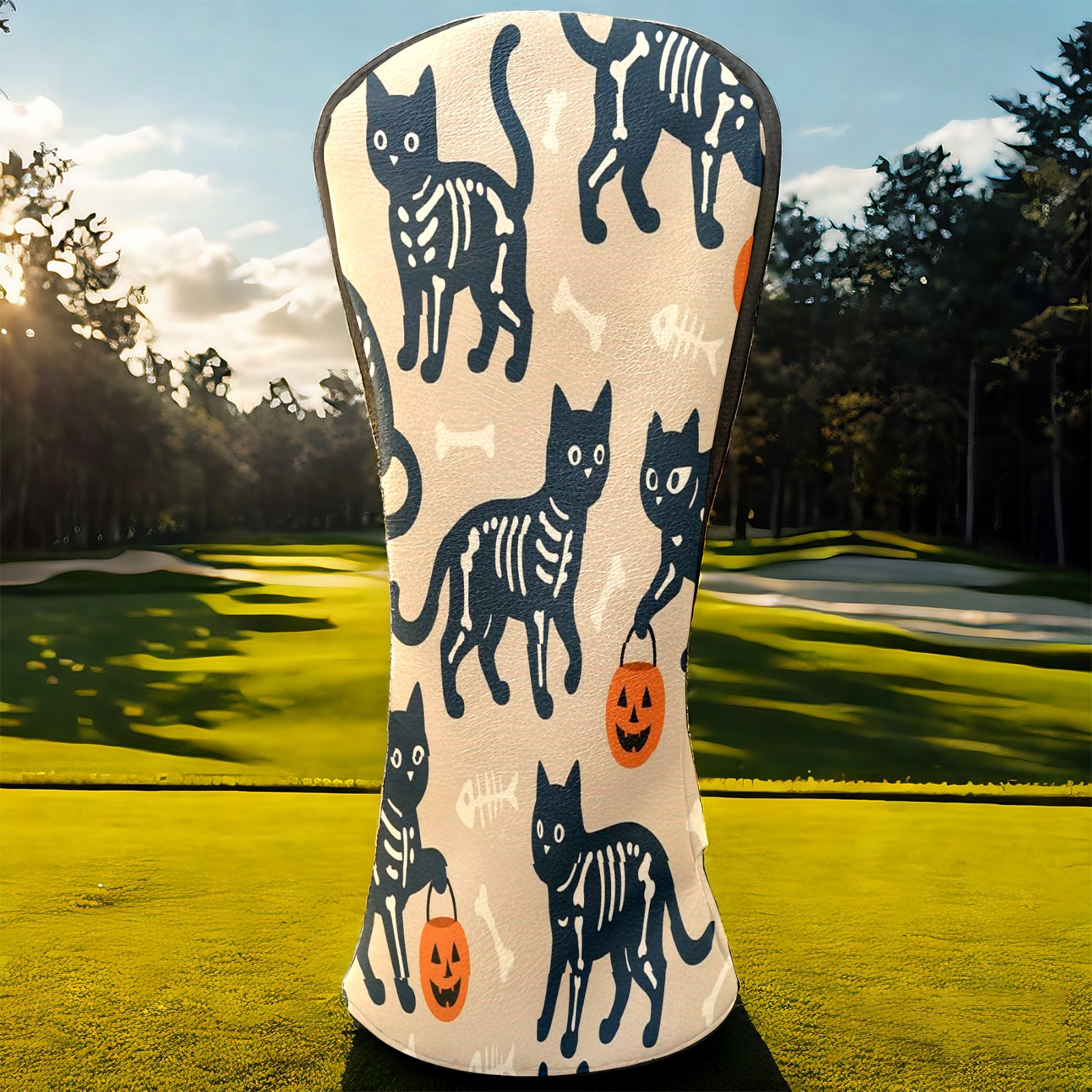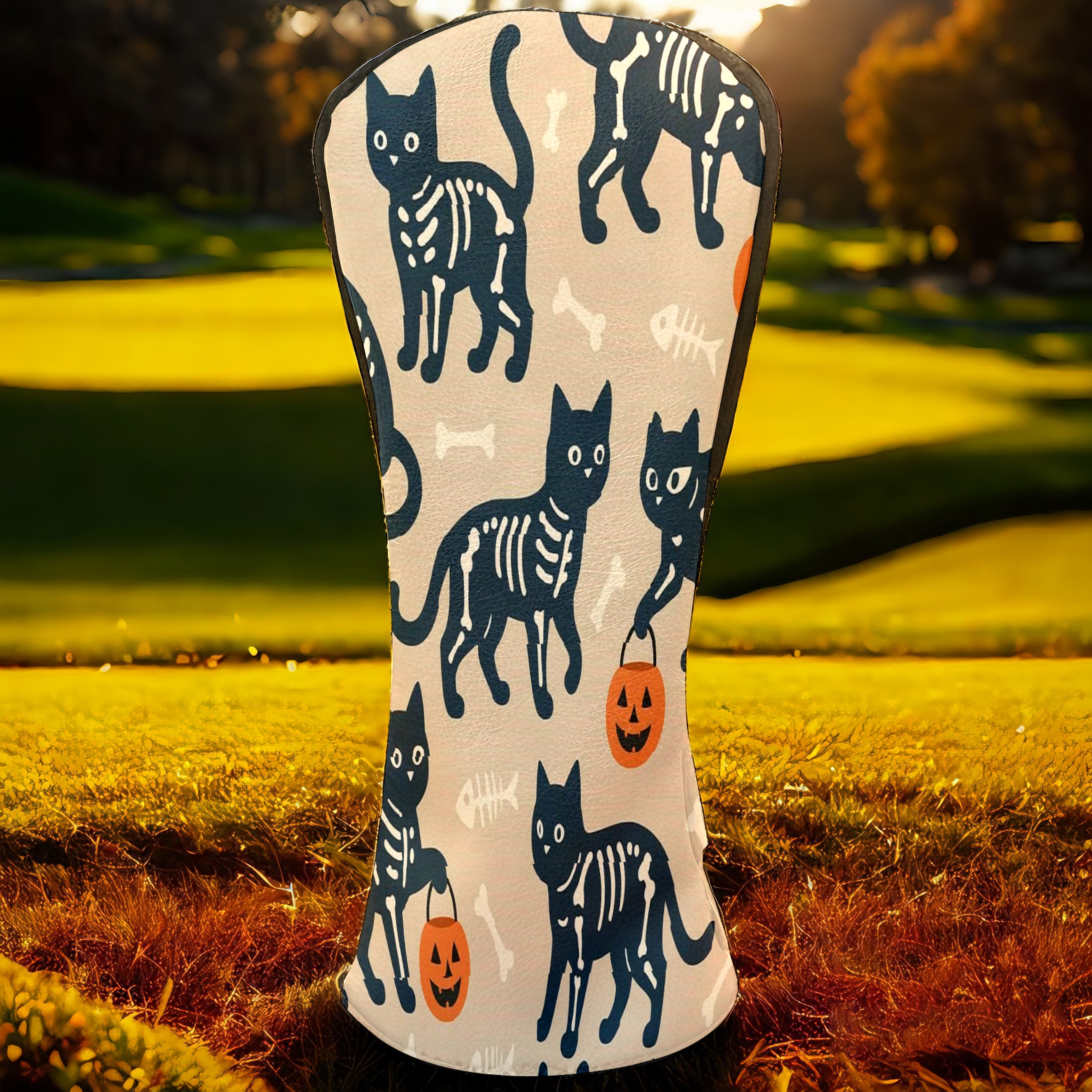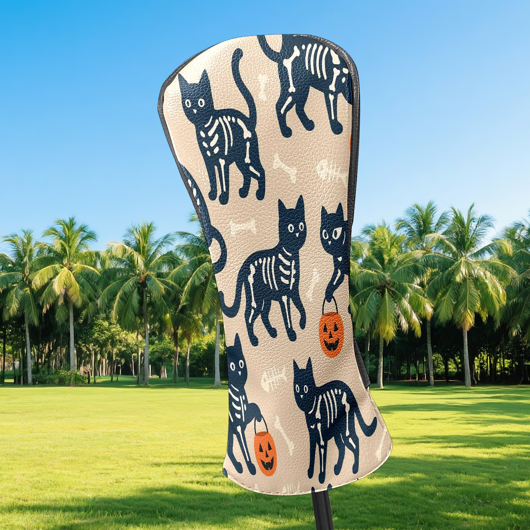 Golf Club Head Covers Halloween SkeletonCat BrownBlack Floral Design for Driver & Hybrid, Waterproof PU Leather with Plush Velvet Lining, Scratch Protection & Secure Fit, Ideal Golf Gift for Men Women