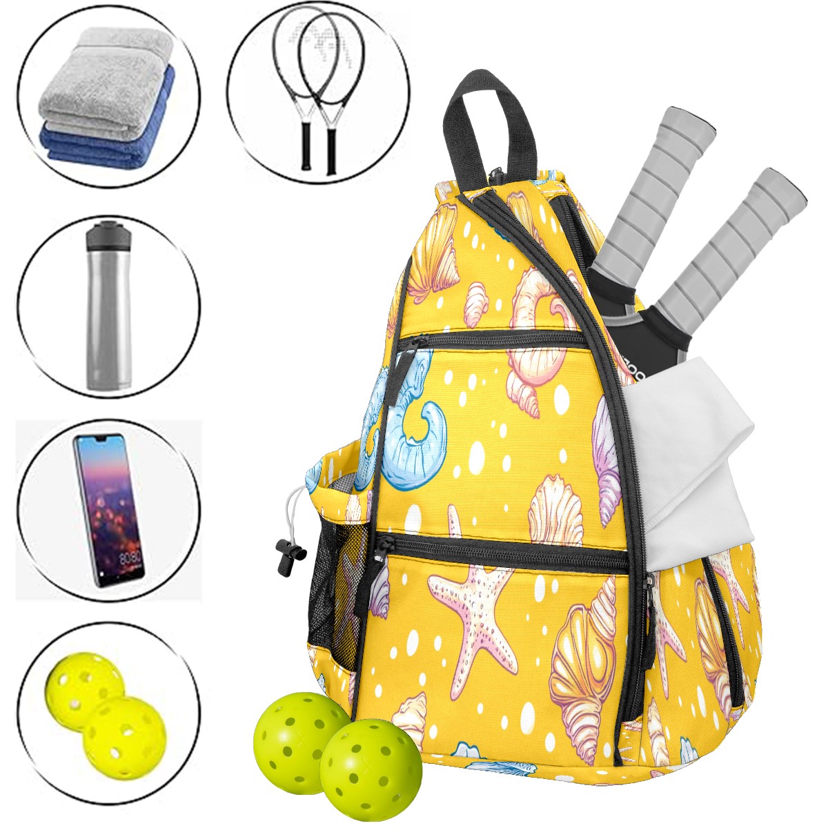 Unisex Pickleball Bag, Waterproof and Large Capacity, with Water Bottle Holder and Adjustable Shoulder Strap,Pickleball Bag Equipment and Gift Yellow Shells Starfish Ocean Pattern