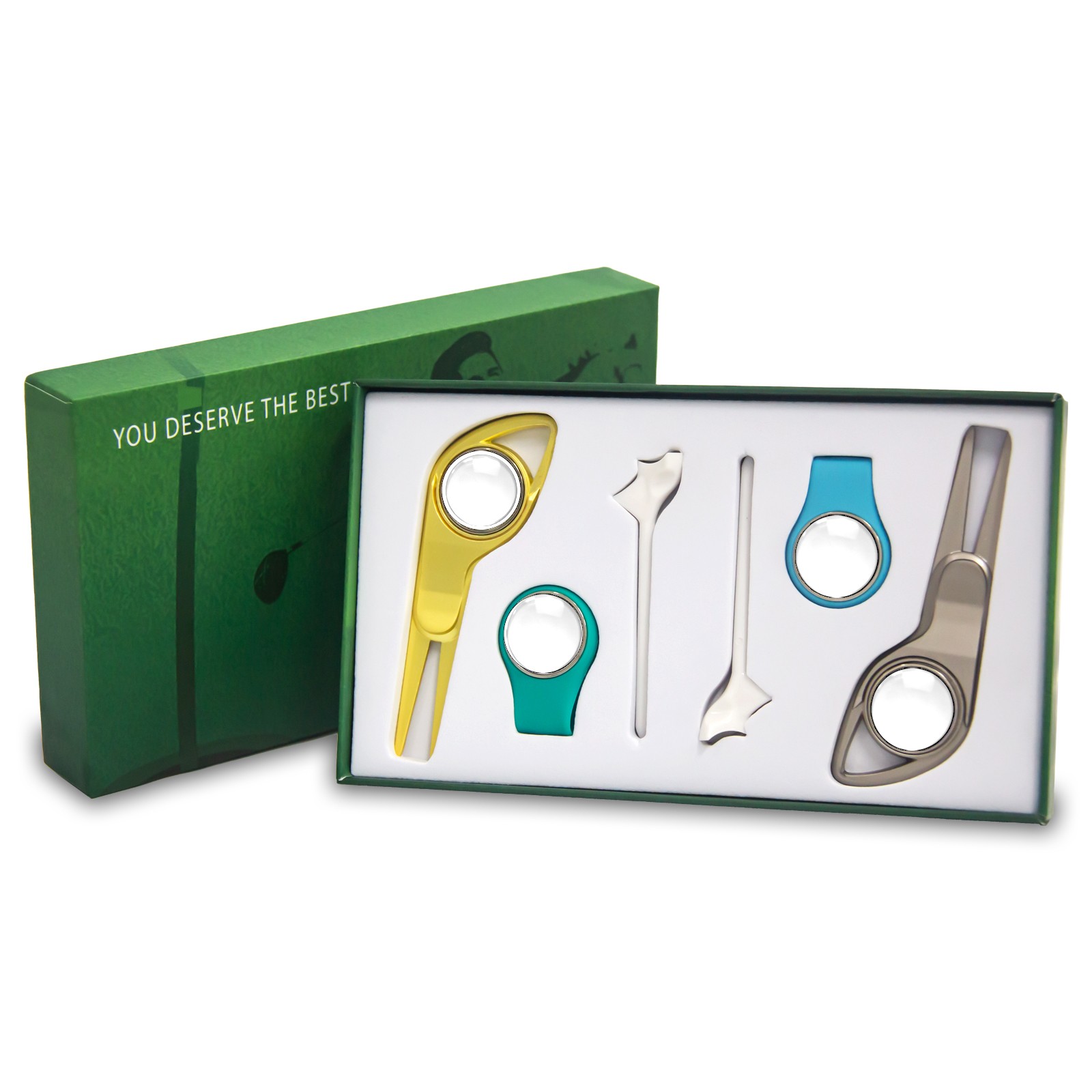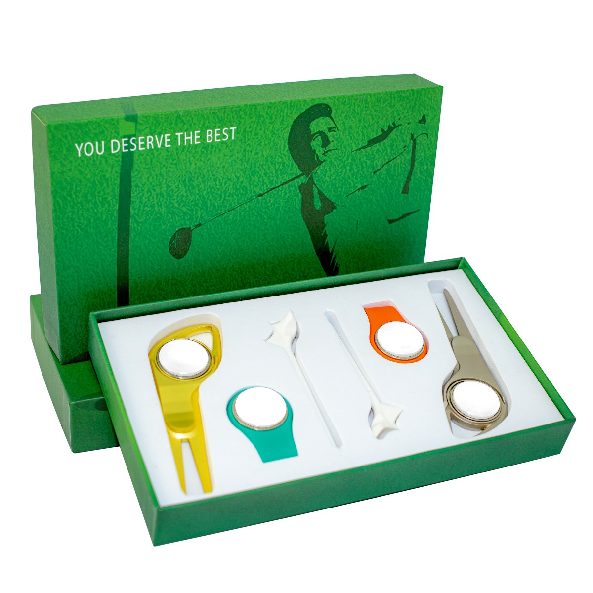 • <p>This golf gift box is suitable for all occasions such as birthdays, anniversaries, retirements, Christmas, Father's Day, etc., conveying sincere feelings with golf elements. The gift box contains 2 green forks, 2 hat clips, 2 sets of ball studs, and 4 magnetic glass markers, meeting the diverse needs of golf and making it a great partner for swinging. Support personalized customization of glass labels, which can add names, dates, or patterns to create exclusive commemorative meanings. Reinforced paper box packaging has a high-quality texture and is resistant to pressure and deformation. Exquisite size, easy to carry and store, enjoy golf fun anytime, anywhere.</p>