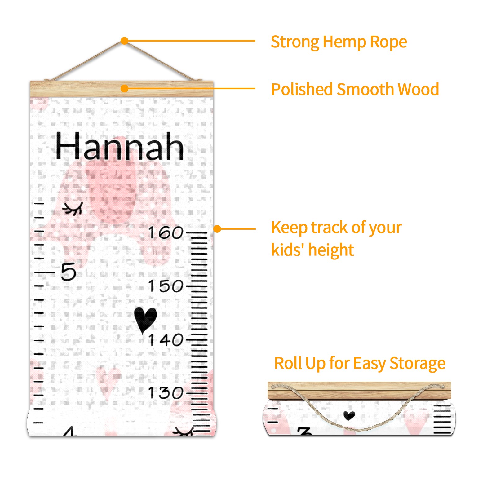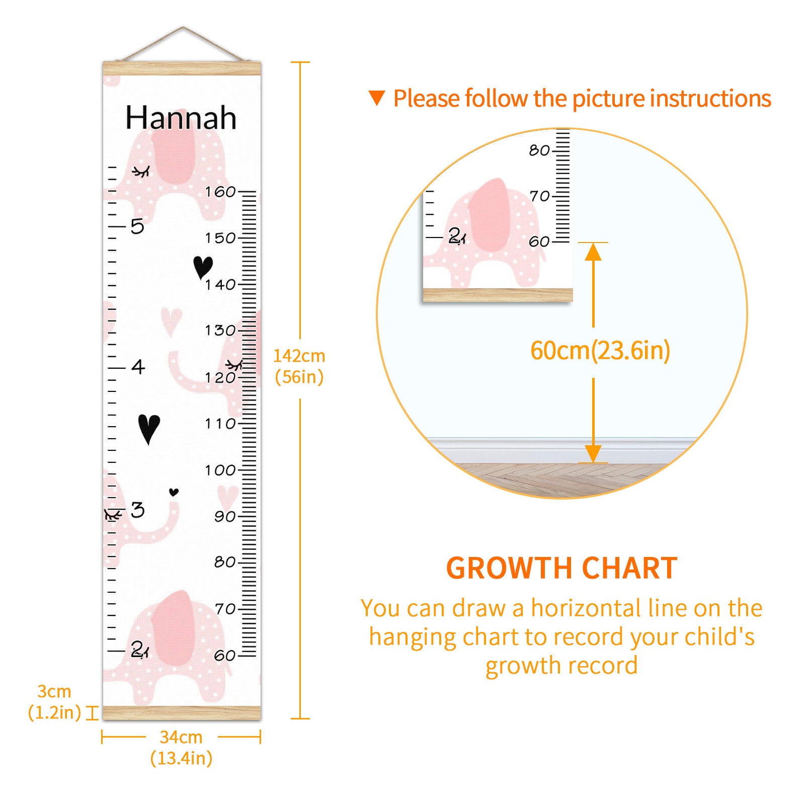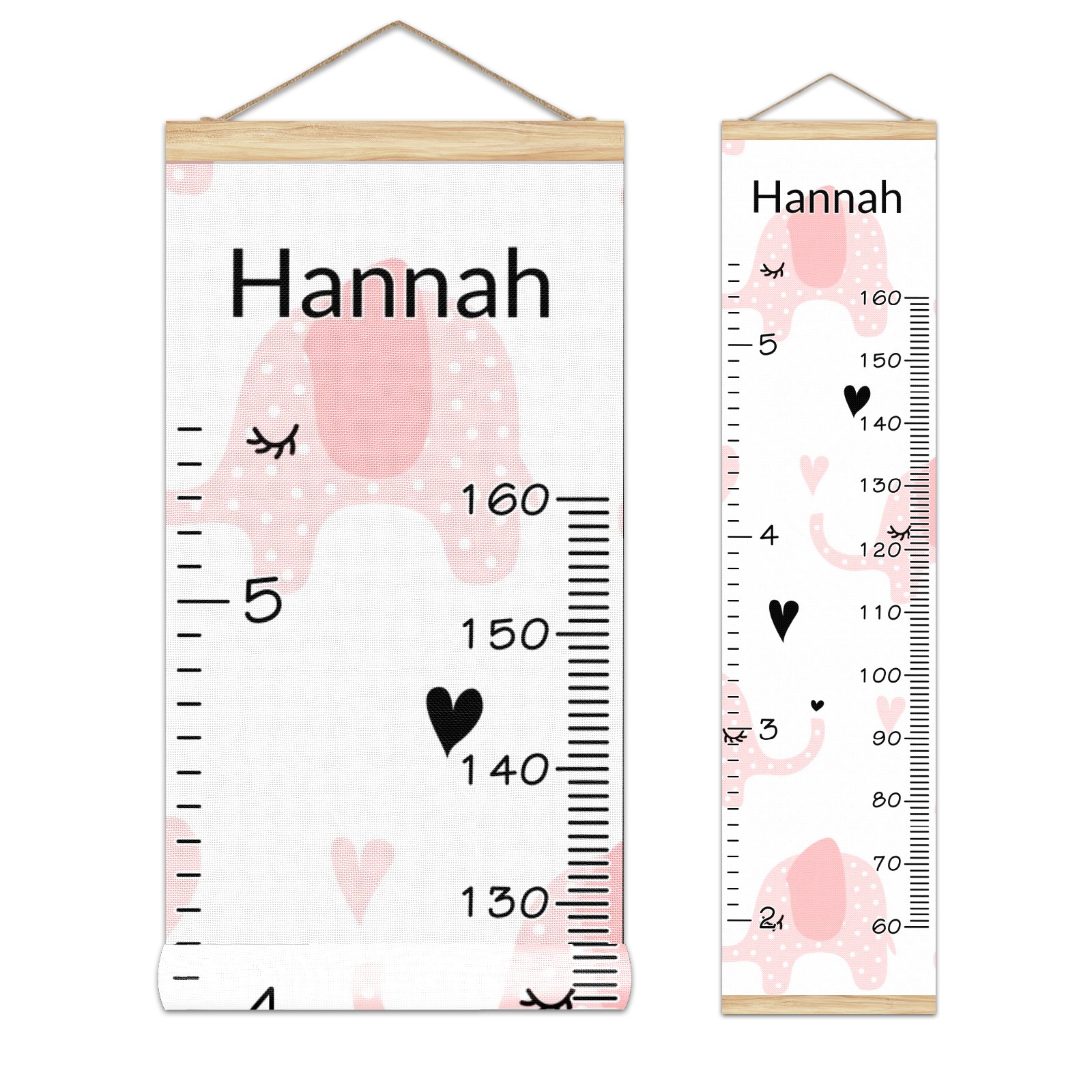 Personalized Kids Name Growth Chart Ruler for Wall Wood Frame Canvas Height Measure Chart 13.4x56 in Hanging Growth Chart Pink Elephant11.3 Boys Girls Room Decor