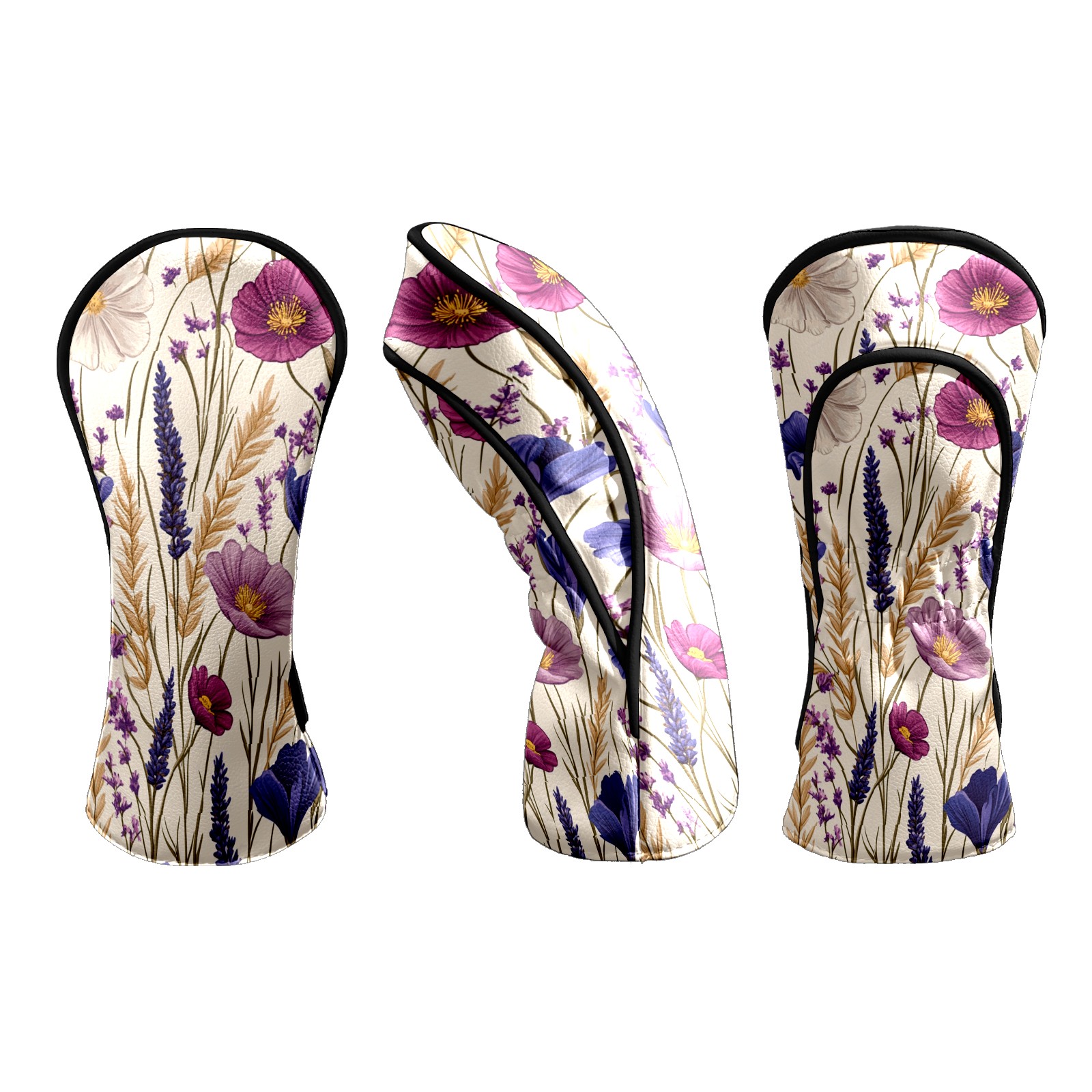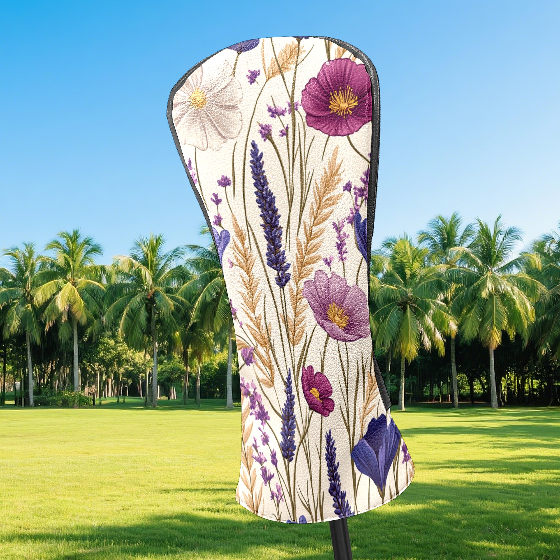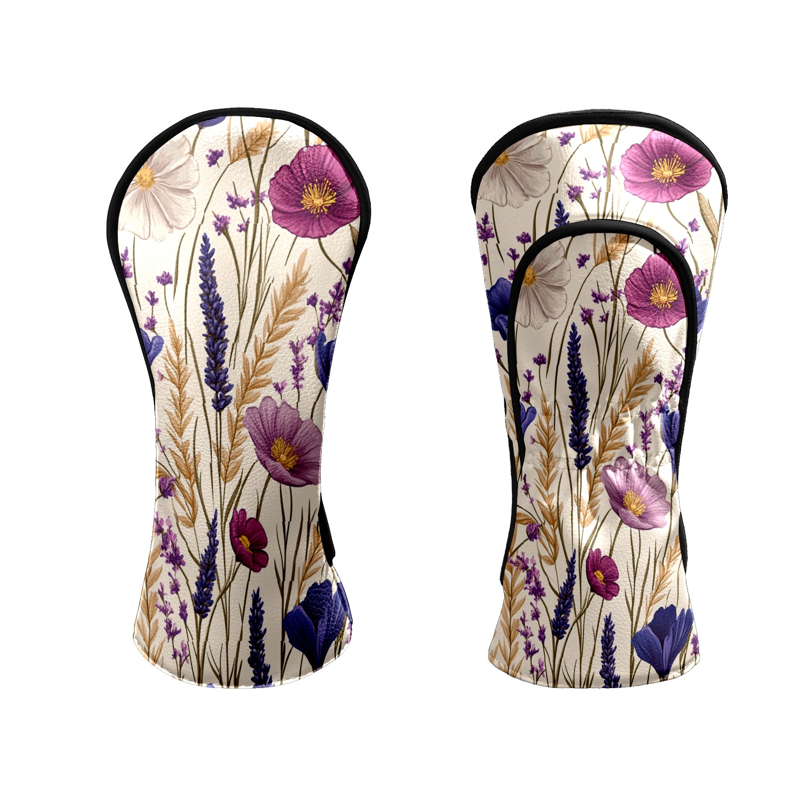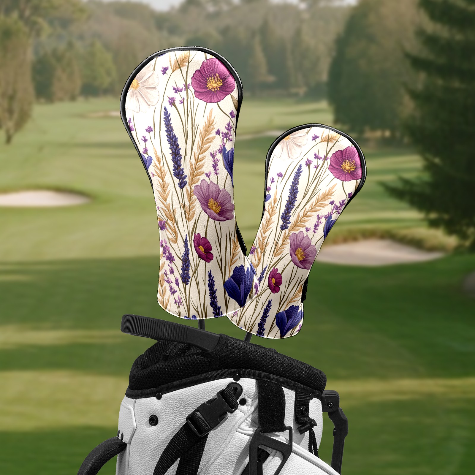 Premium Leather Golf Club Headcovers,Purple Pink Flowers Wheat Ears Fits Driver Hybrid Fairway 3/5 Wood,with Scratch-Resistant Lining, Gift for Men and Women