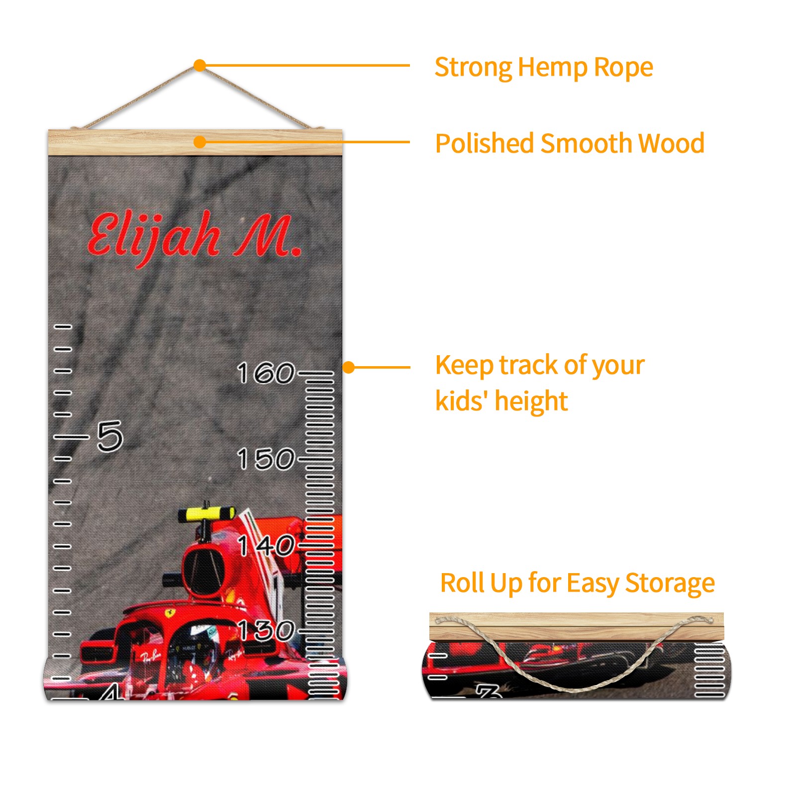 Personalized Kids Name Growth Chart Ruler for Wall Wood Frame Canvas Height Measure Chart 13.4x56 in Hanging Growth Chart RACE CAR11.5 Boys Girls Room Decor