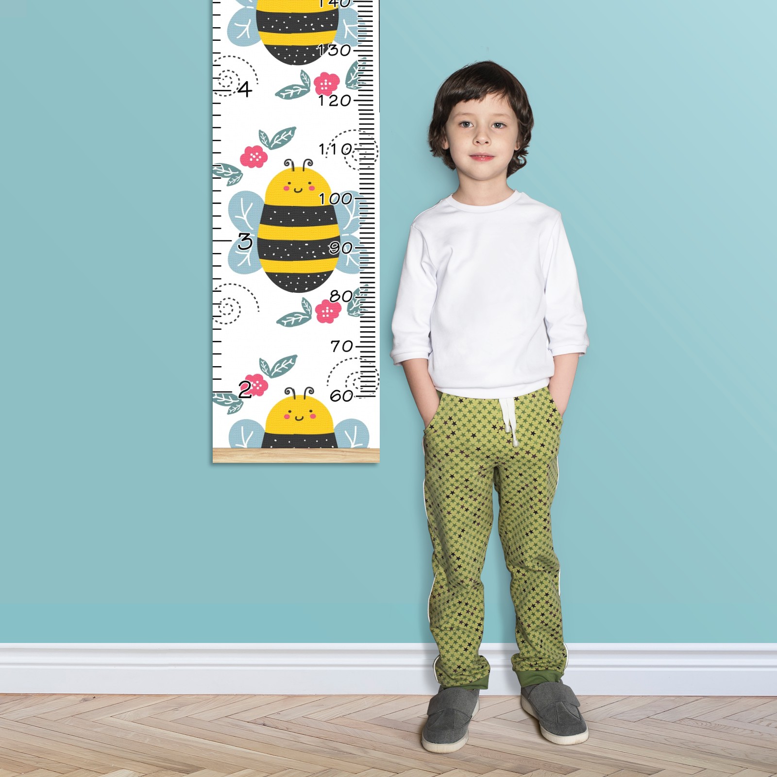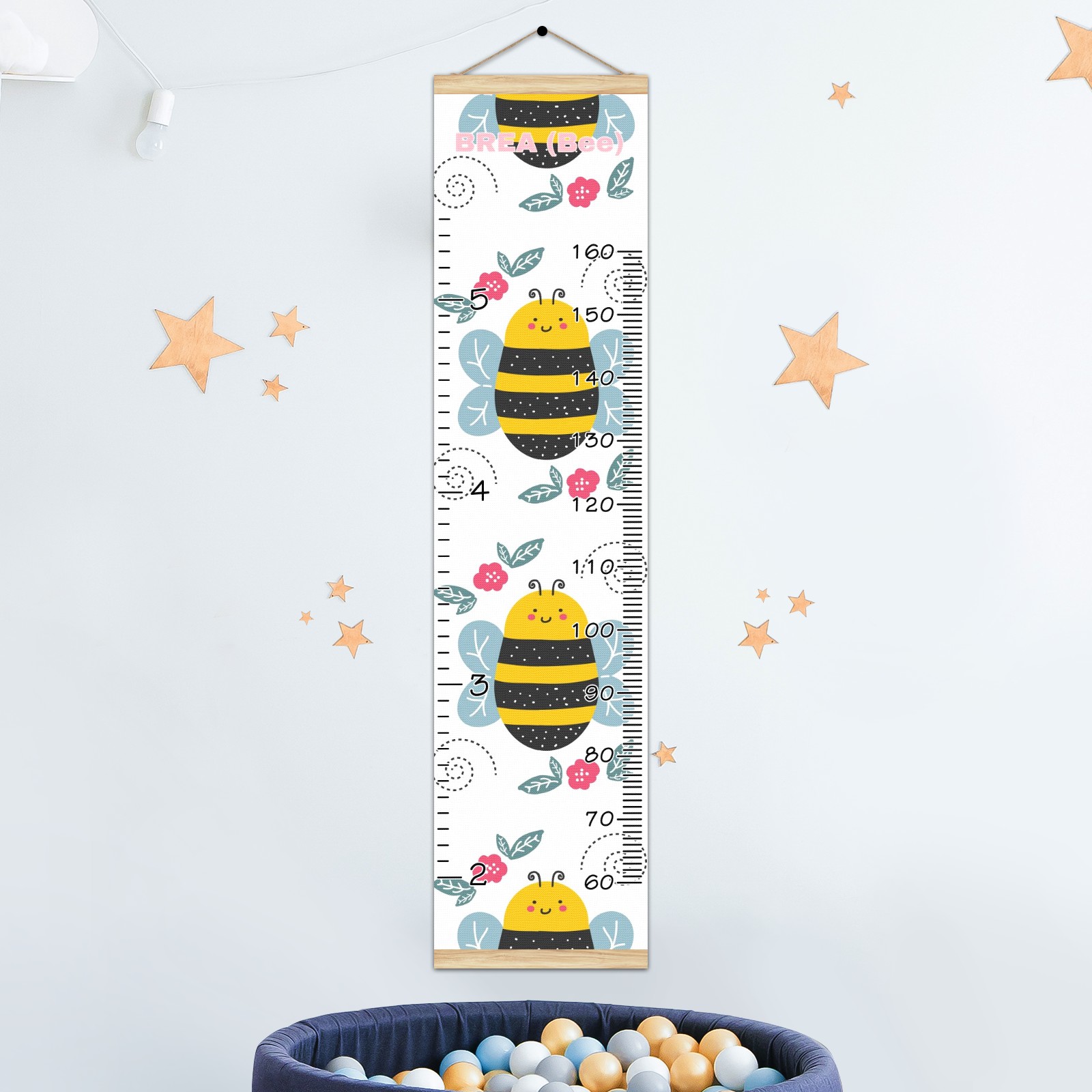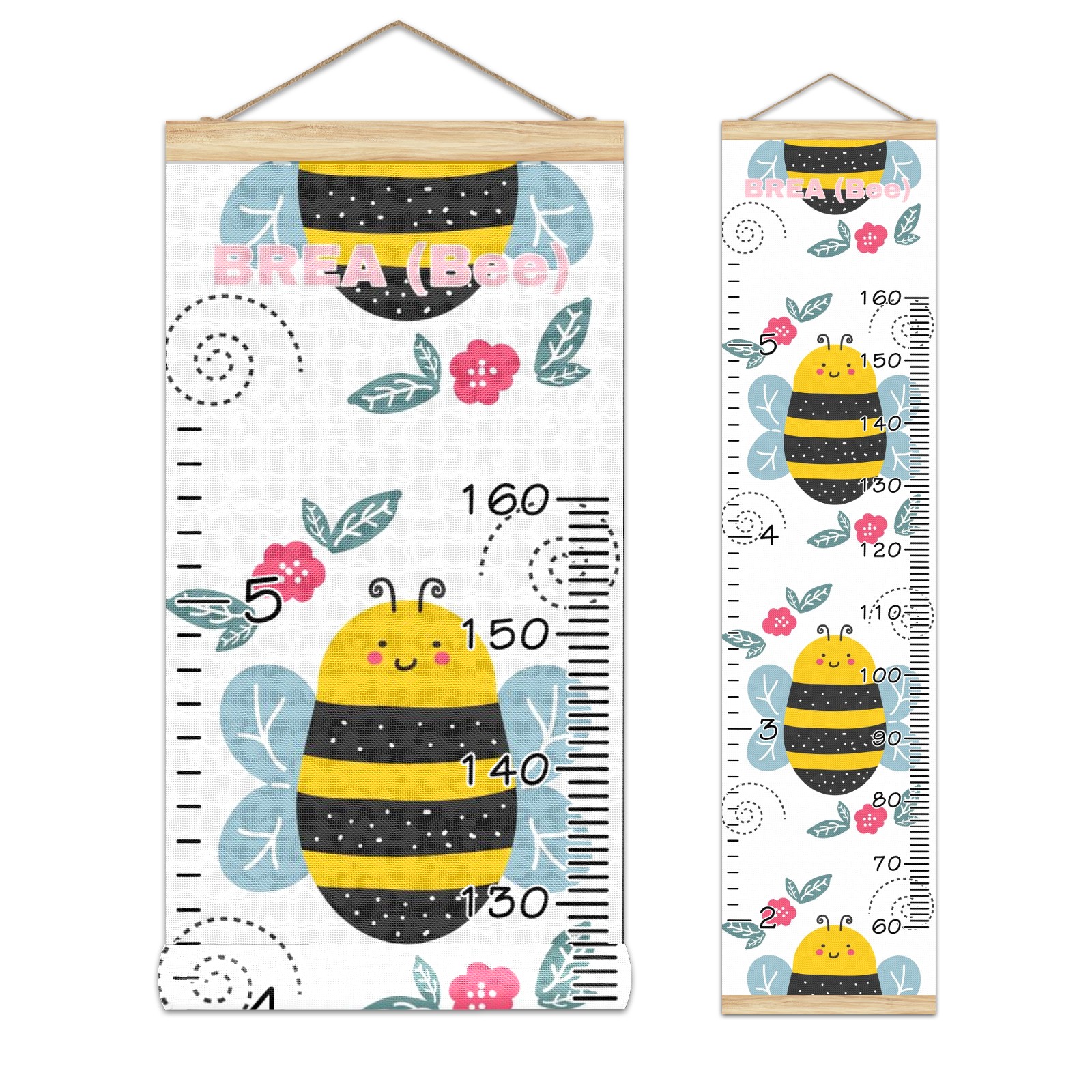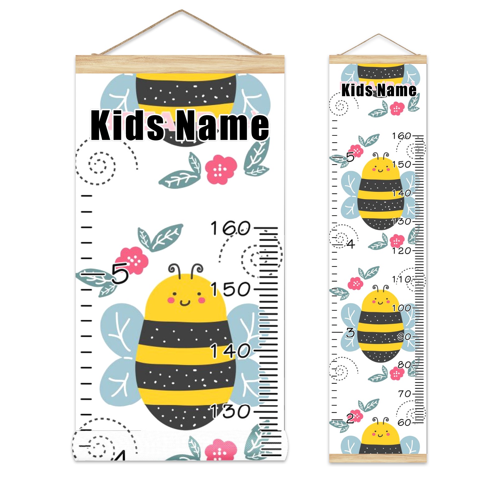 Personalized Kids Name Growth Chart Ruler for Wall Wood Frame Canvas Height Measure Chart 13.4x56 in Hanging Growth Chart Cute Cartoon Bee Red Floral11.5 Boys Girls Room Decor