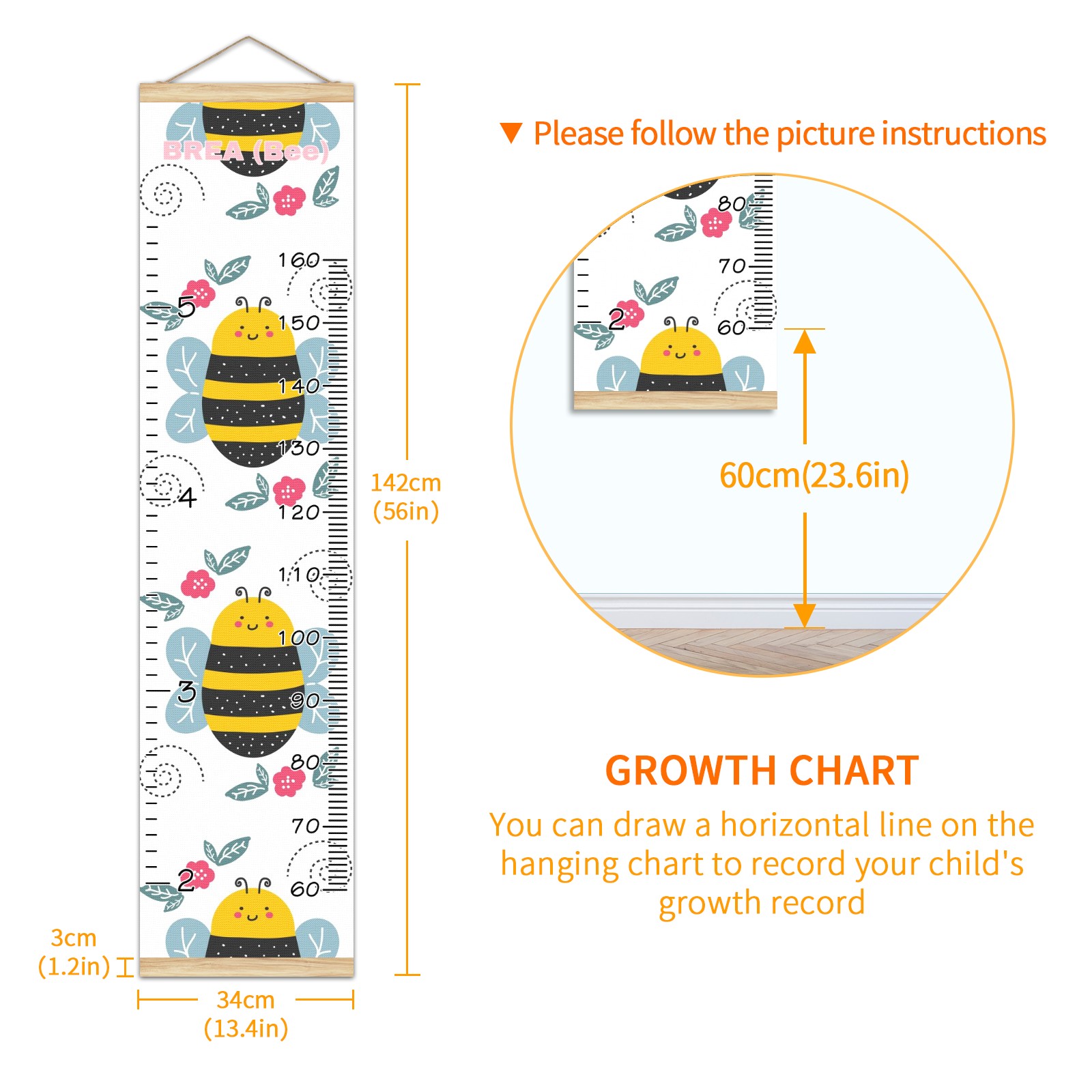 <p><b>Features:</b></p> <p>Rope for Hanging</p> <p>Material: Linen + Wood</p> <p>Dimensions: 13.4x56 inches</p> <p>Package Included: 1 * Baby Growth Chart</p> <p><b>Baby height growth chart can be used anywhere</b></p> <p>Ideal for kids nursery decoration, kids bedroom, interior walls or windows, playroom, living room, homedecoration.Add name and make the growth chart special!</p> <p><b>Easy to fold and carry</b></p> <p>With rope at the top of the growth chart, it is easy to install and remove.You can fold it and unfold any time any where.</p> <p><b>Perfect Gift Idea for Kids</b></p> <p>Environmental and non-toxic for kids use, it must be a perfect gift for baby, kids, girls, and boys.This is a best choice for your friend who have kids or baby as a popular gift.</p> <p><b>Easy to read</b></p> <p>Measurement accrate with 2 scales, Centimeters and feet. The letters are big enough, very easy to read.</p> <p><b>60cm(23.6inch) Over Ground Design</b></p> <p>Not only can protect from dust and other damage, but also will not interfere in floor cleaning.</p>