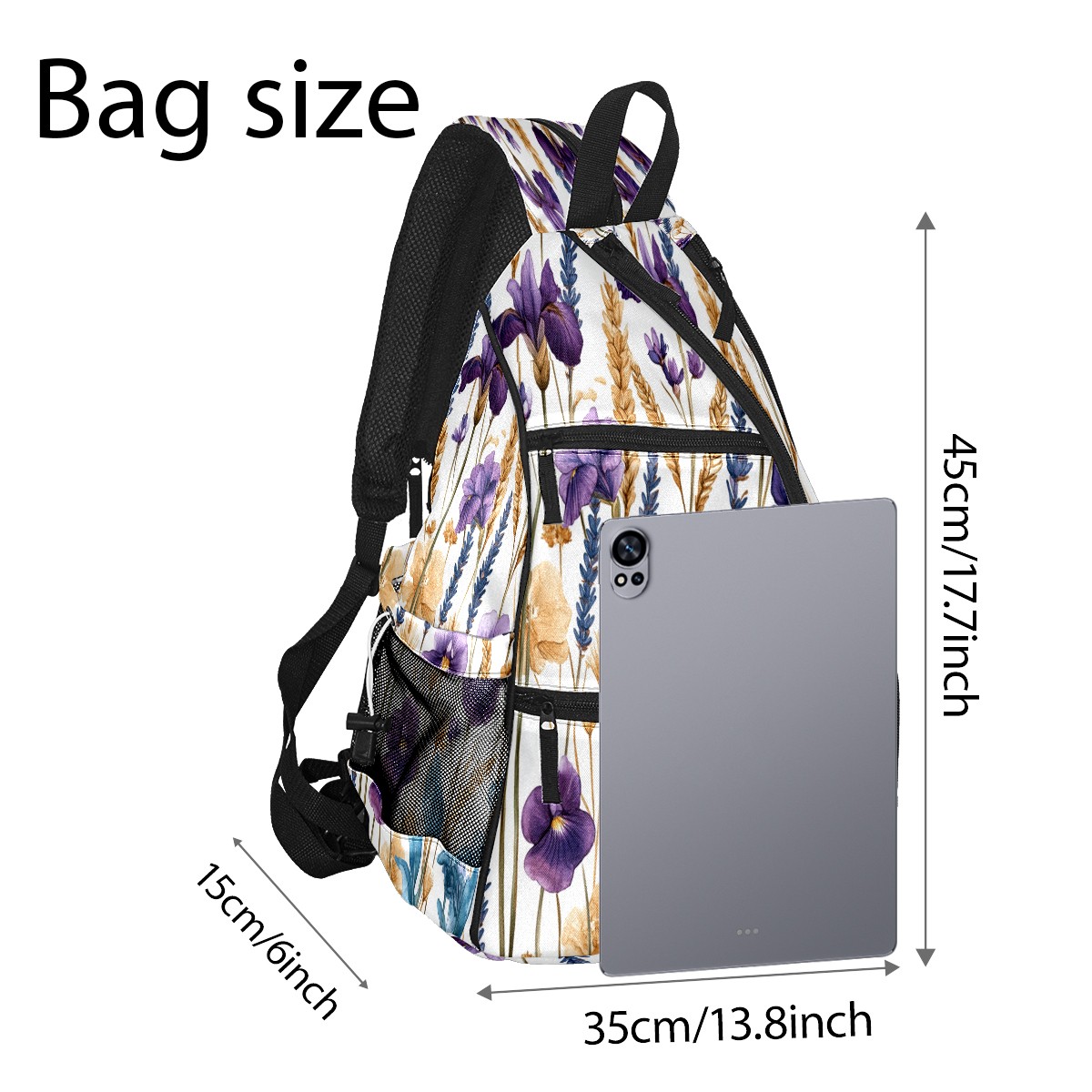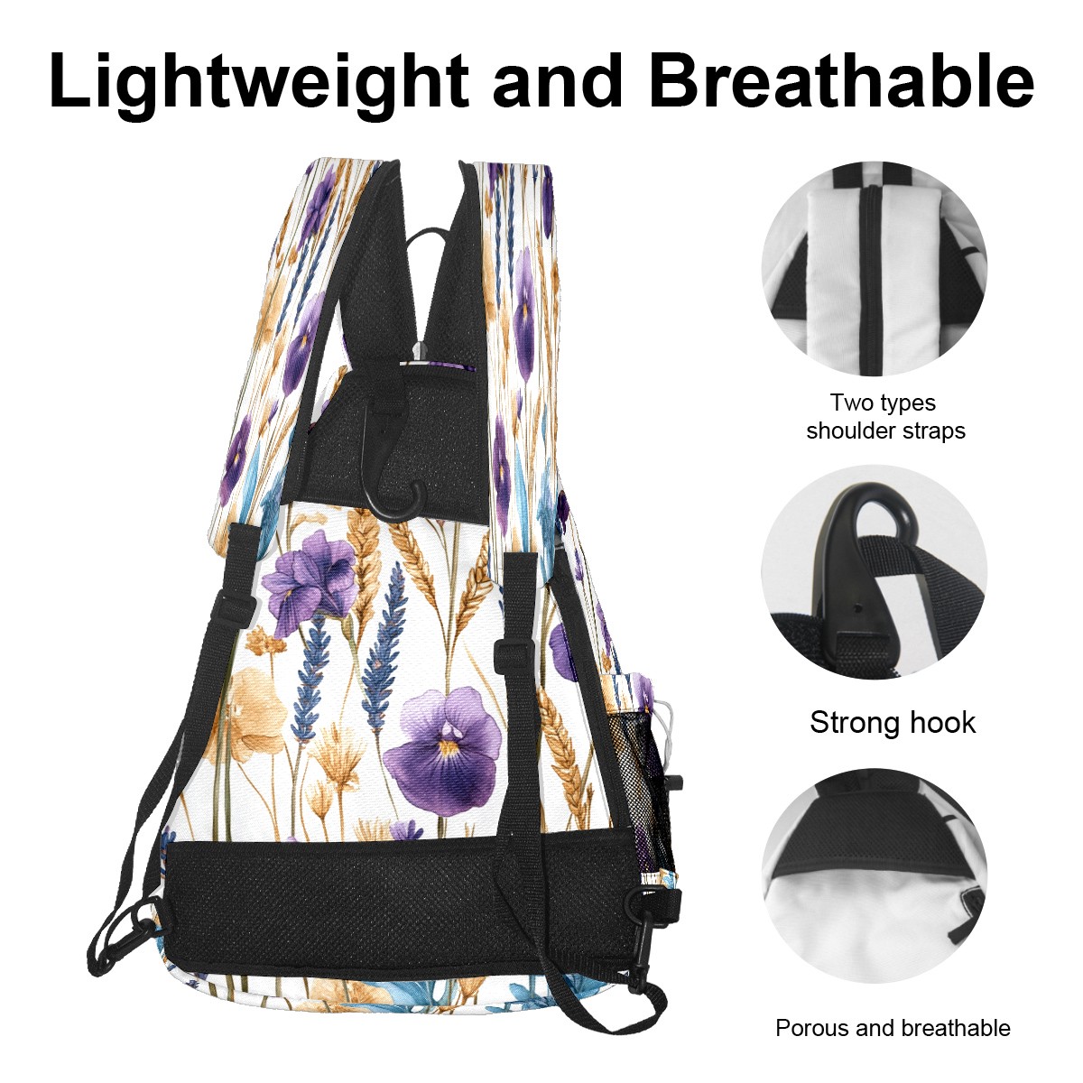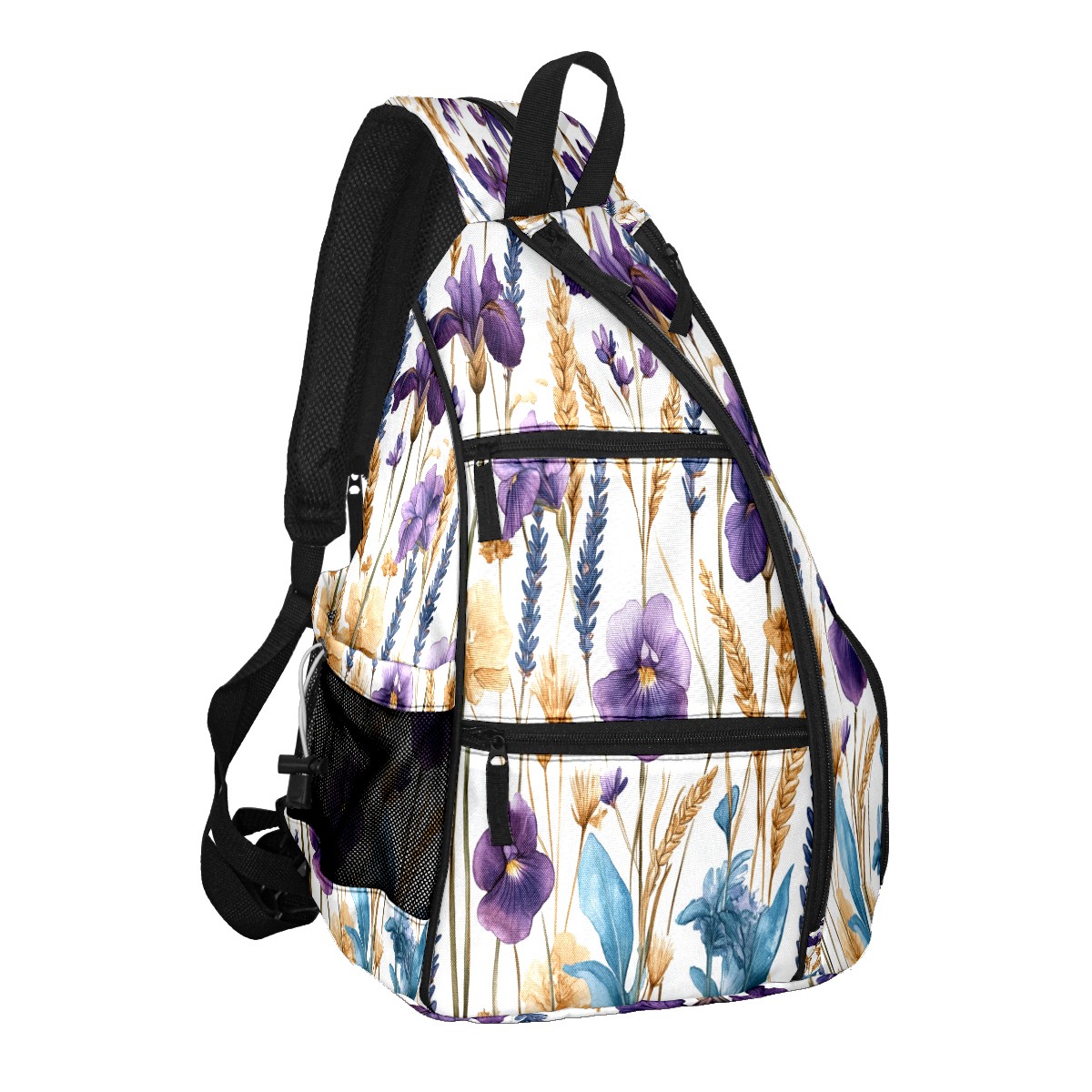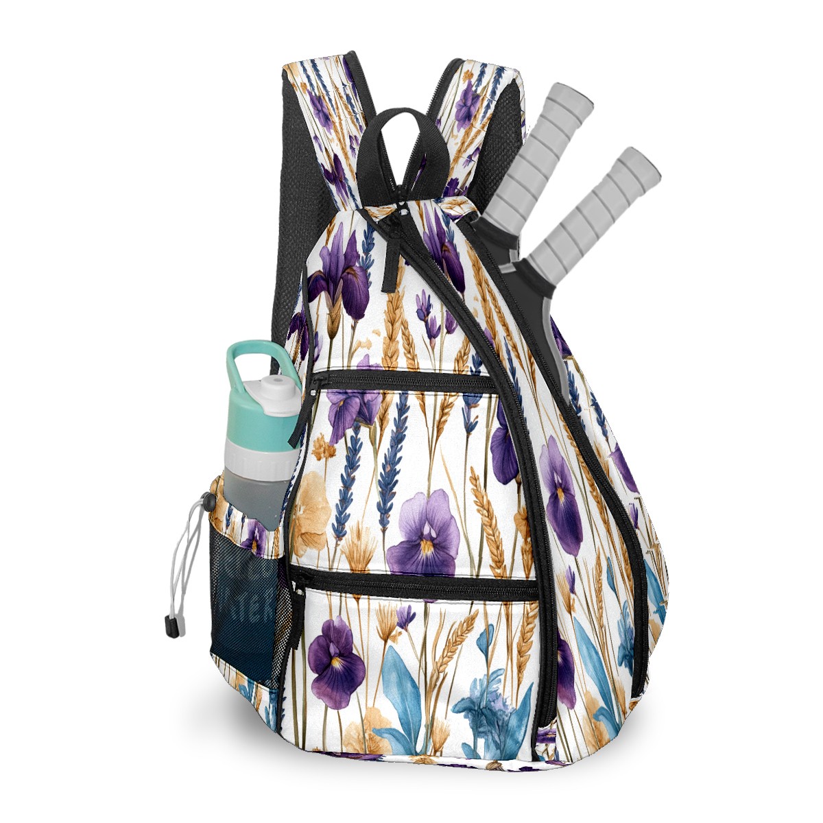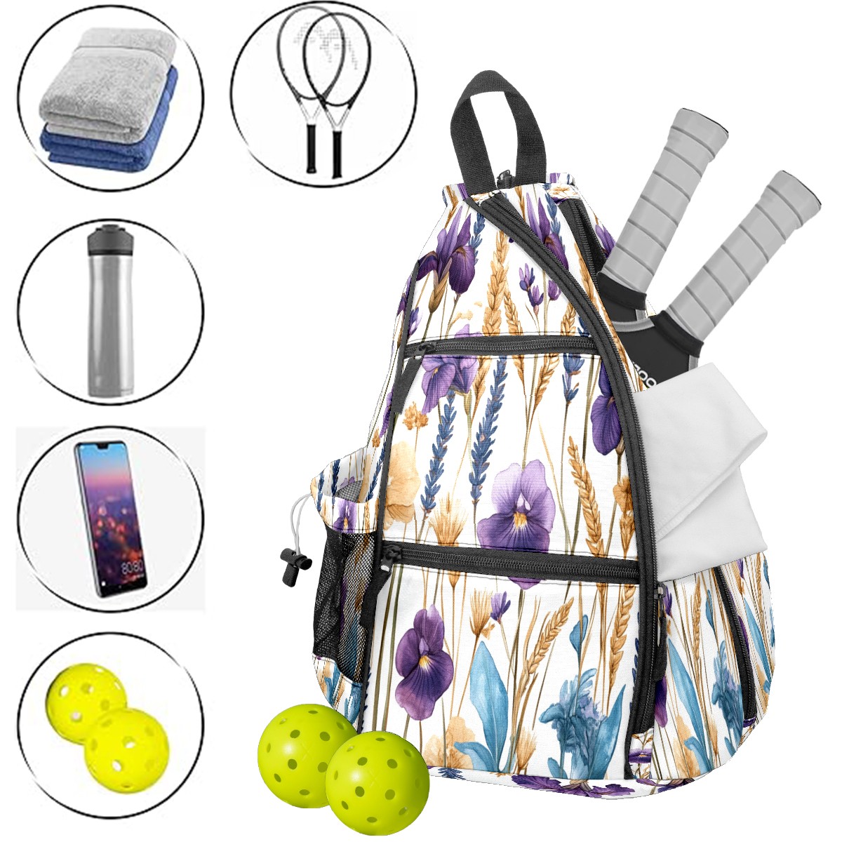 Unisex Pickleball Bag, Waterproof and Large Capacity, with Water Bottle Holder and Adjustable Shoulder Strap,Pickleball Bag Equipment and Gift Purple Blue Flowers