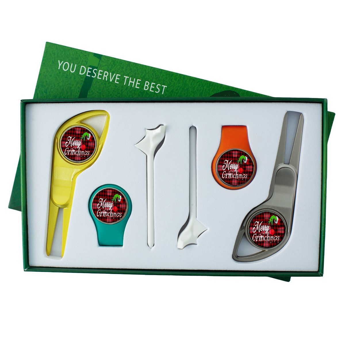 Men's Golf Gift Set 6-Piece: Custom Magnetic Ball Markers, Divot Tools, Hat Clips & Tees – Perfect for Birthdays, Anniversaries, Retirement, Christmas, Father’s Day Merry Christmas Grinchmas Buffalo Plaid (1)