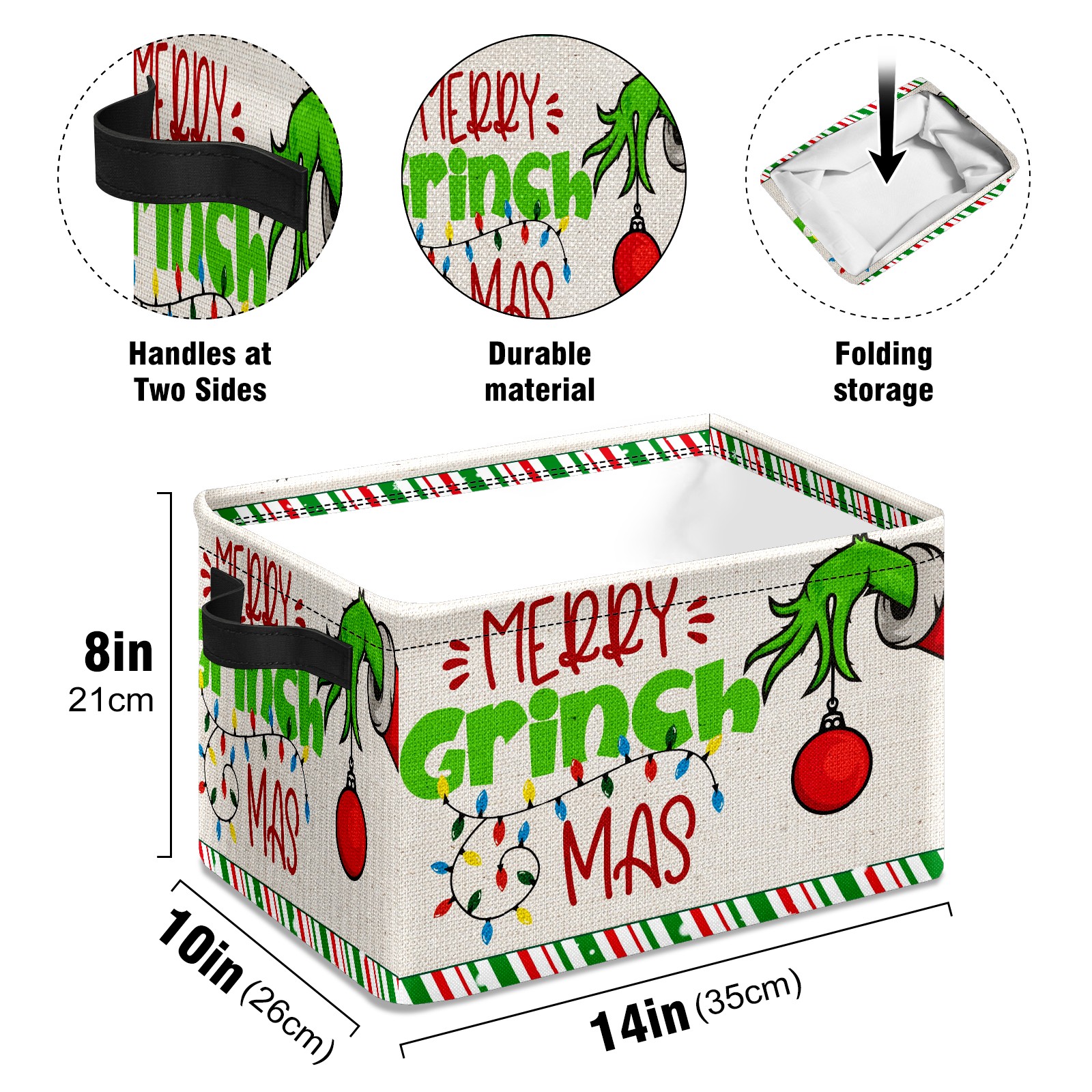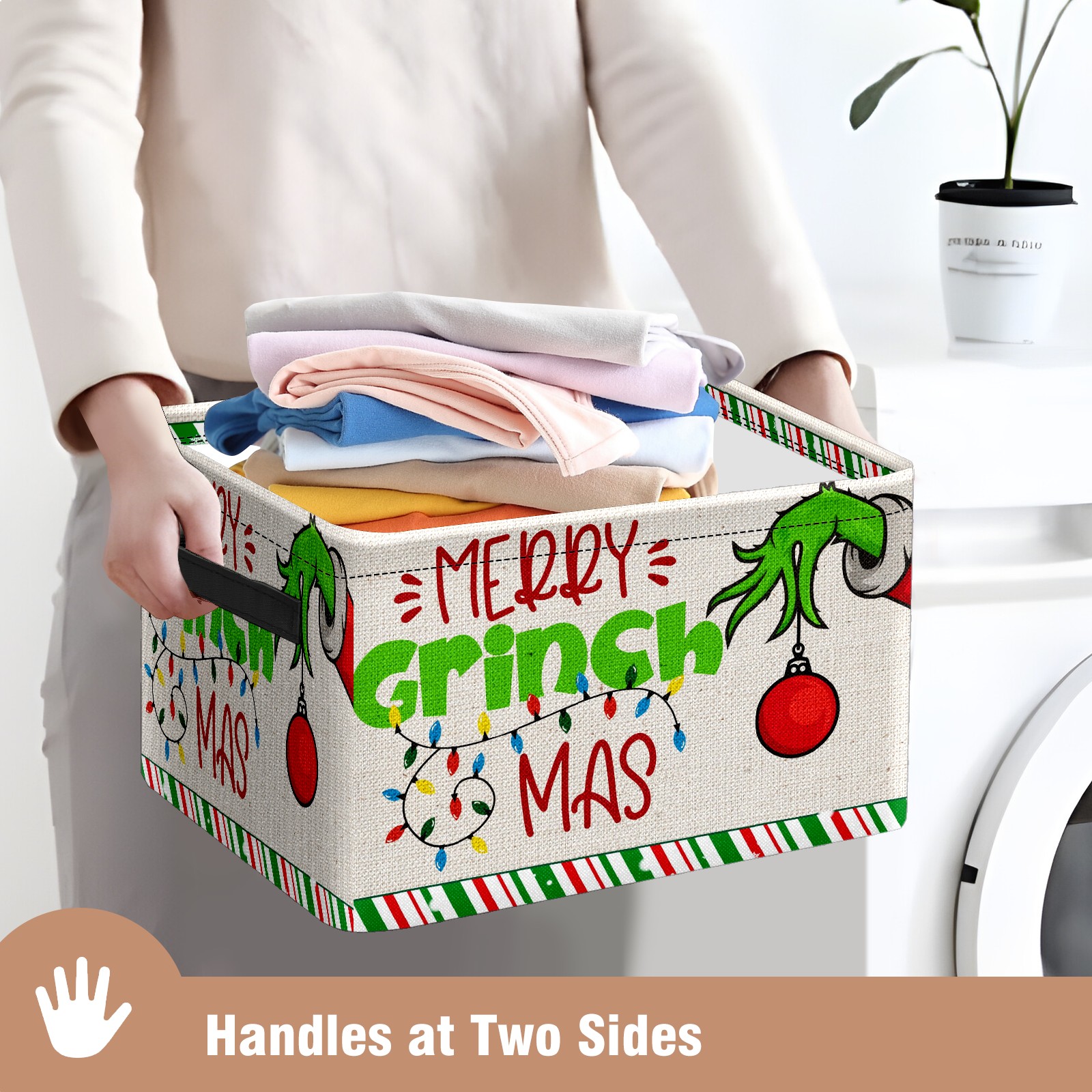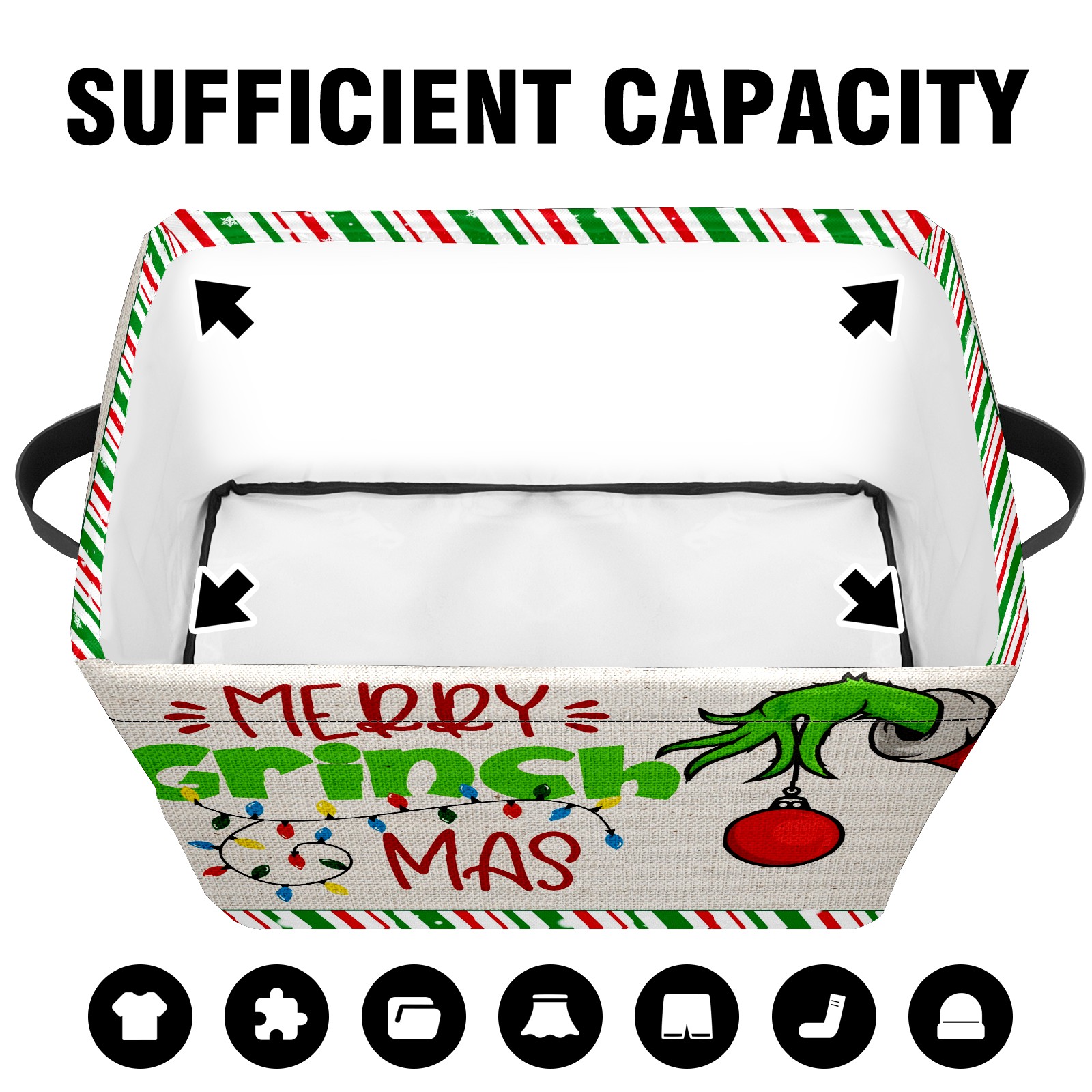 Fabric Storage Basket with Handles, 600D Oxford Cloth Organizer Bin with Metal Frame, Rectangular Storage Basket for Home, Office, School Merry Christmas Grinchmas Stripe