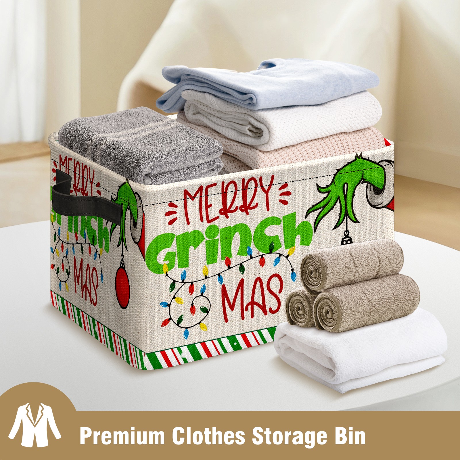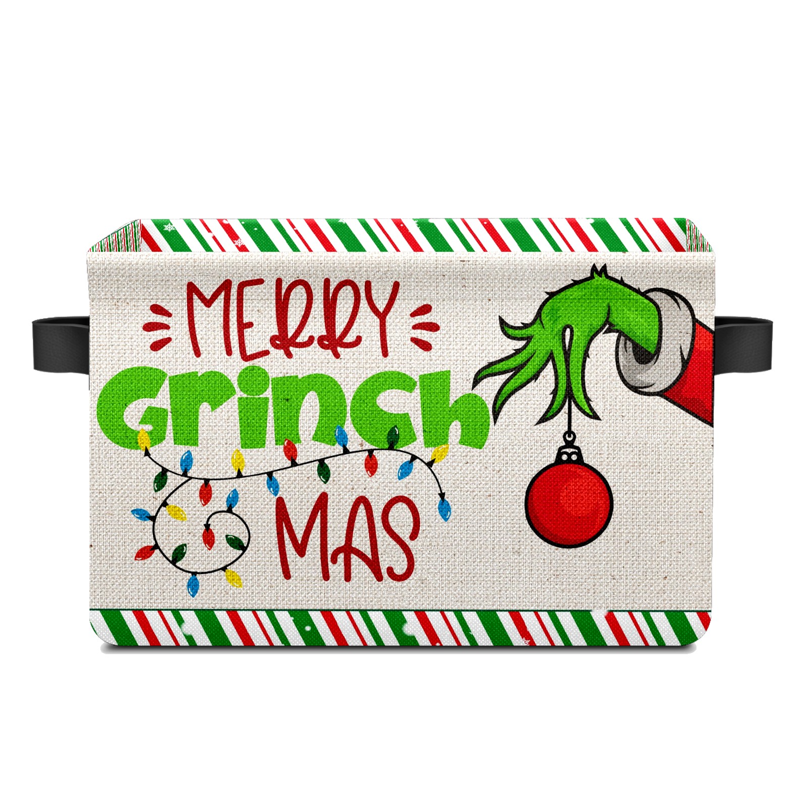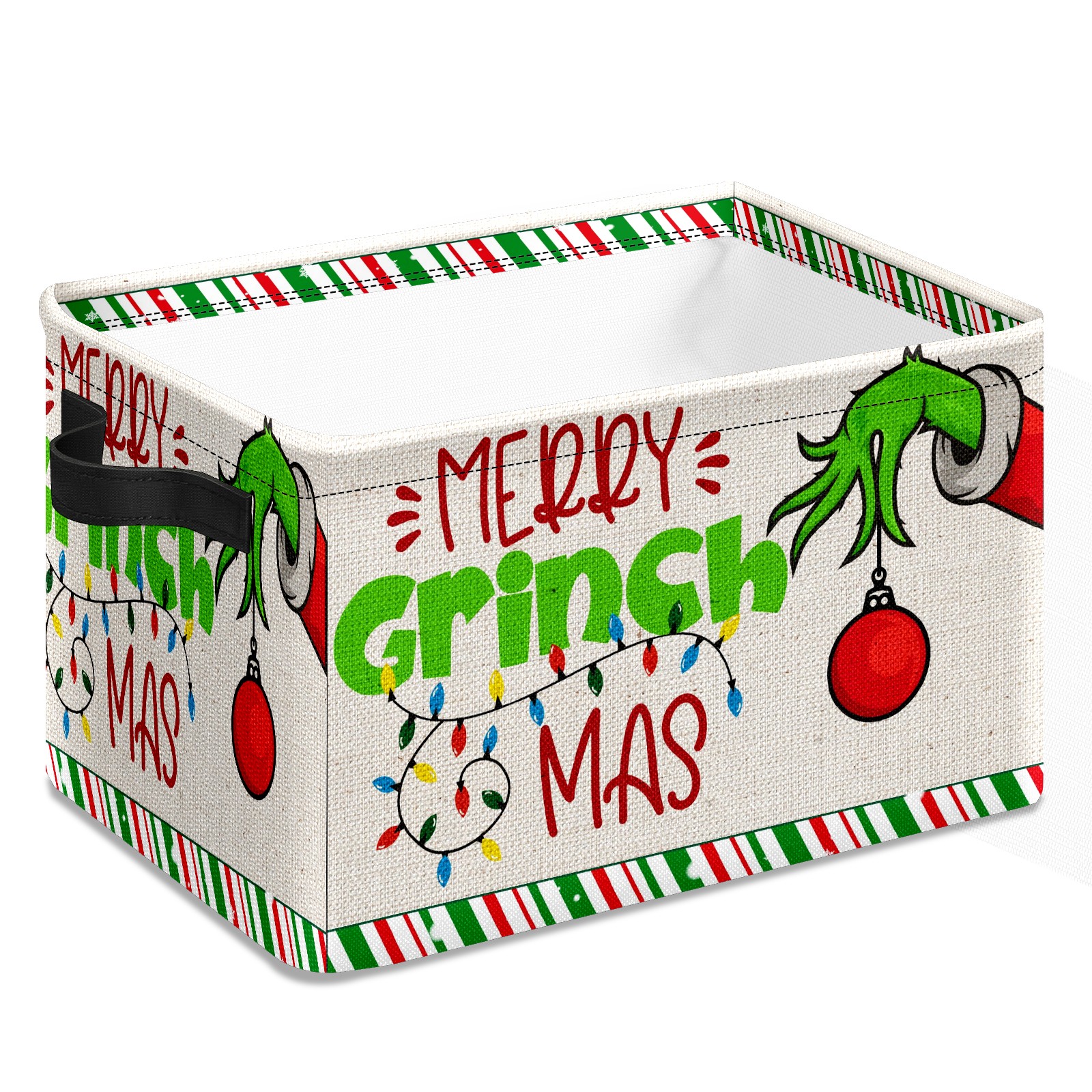 Fabric Storage Basket with Handles, 600D Oxford Cloth Organizer Bin with Metal Frame, Rectangular Storage Basket for Home, Office, School Merry Christmas Grinchmas Stripe