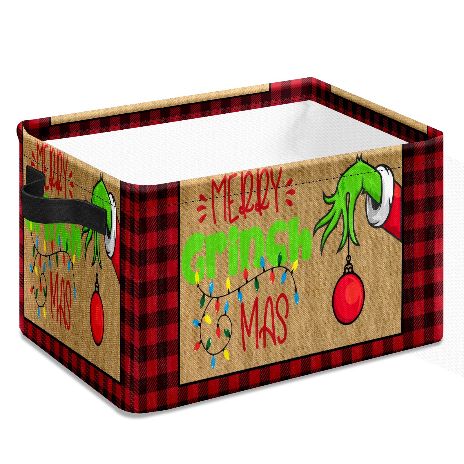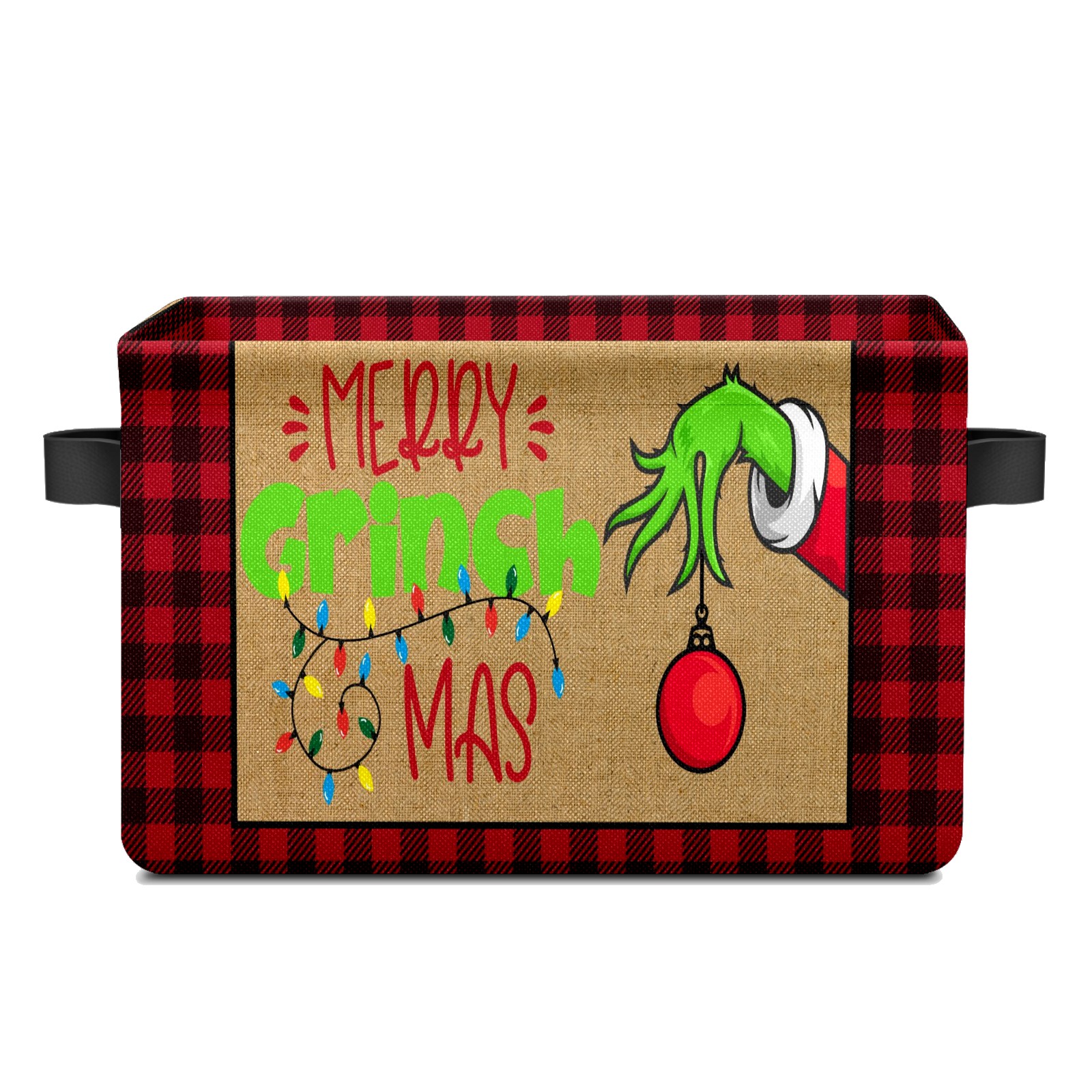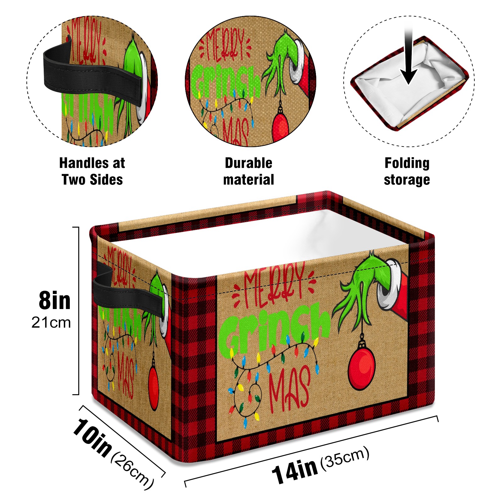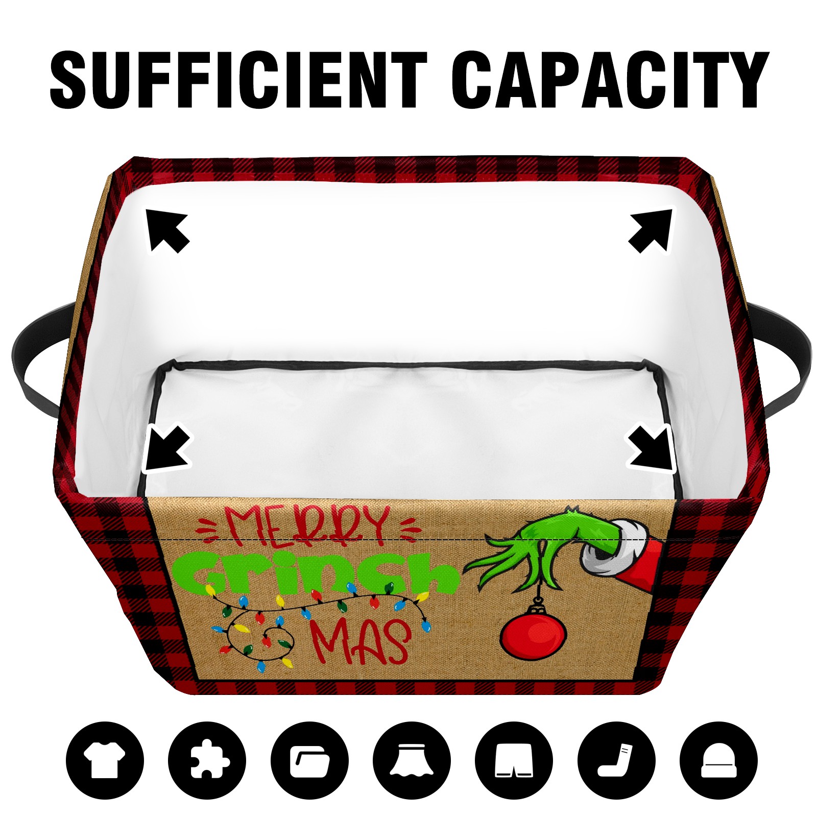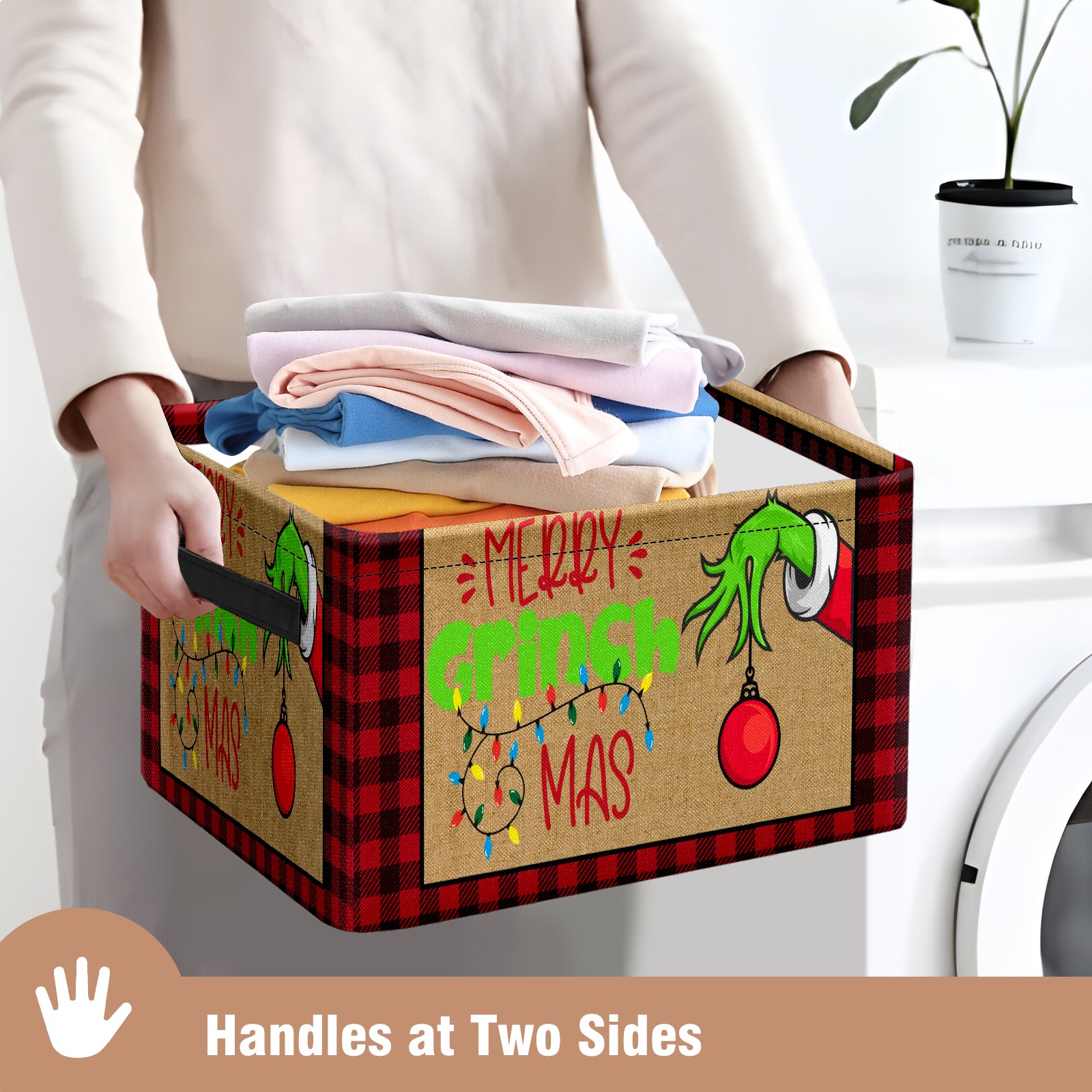 Fabric Storage Basket with Handles, 600D Oxford Cloth Organizer Bin with Metal Frame, Rectangular Storage Basket for Home, Office, School Merry Christmas Grinchmas Buffalo Plaid