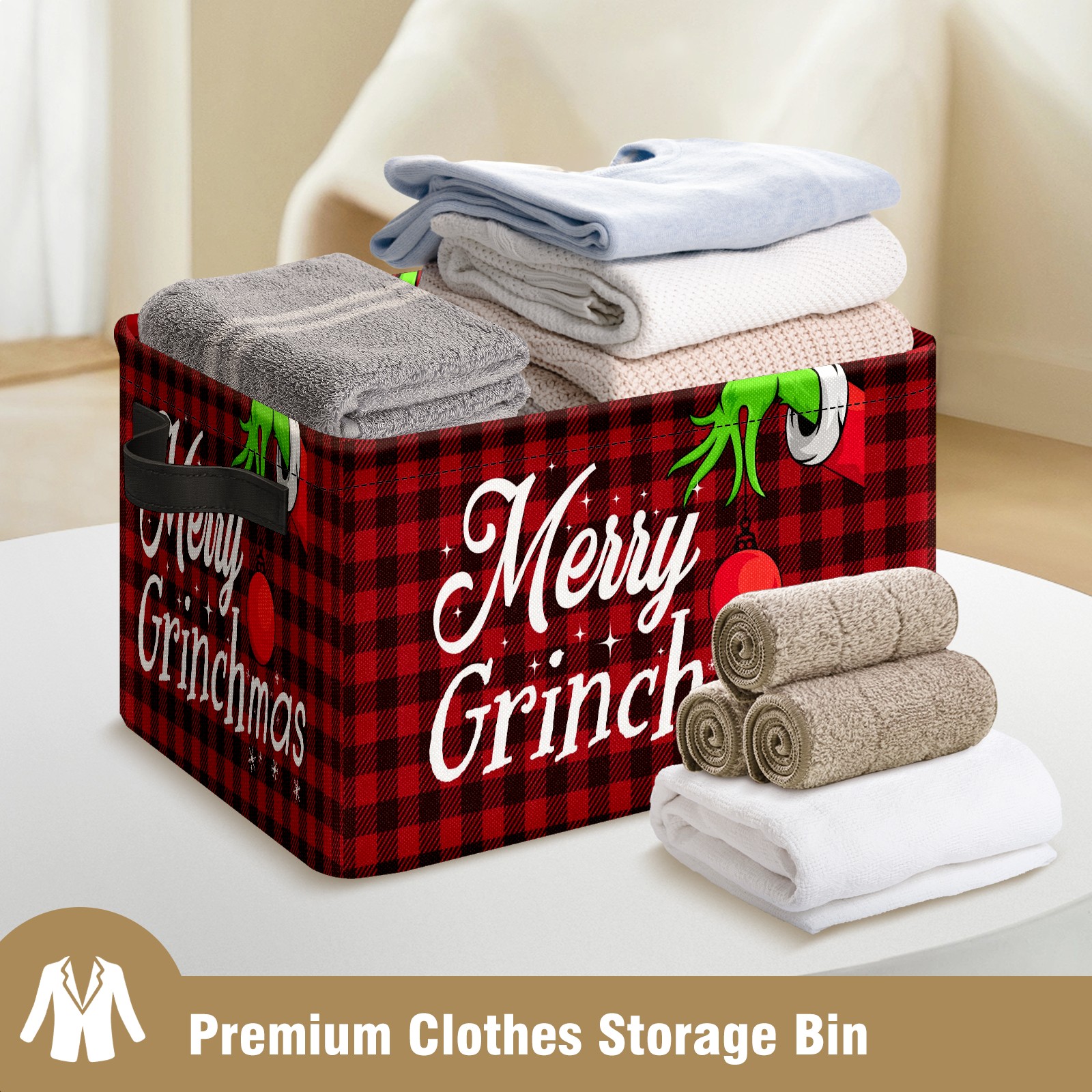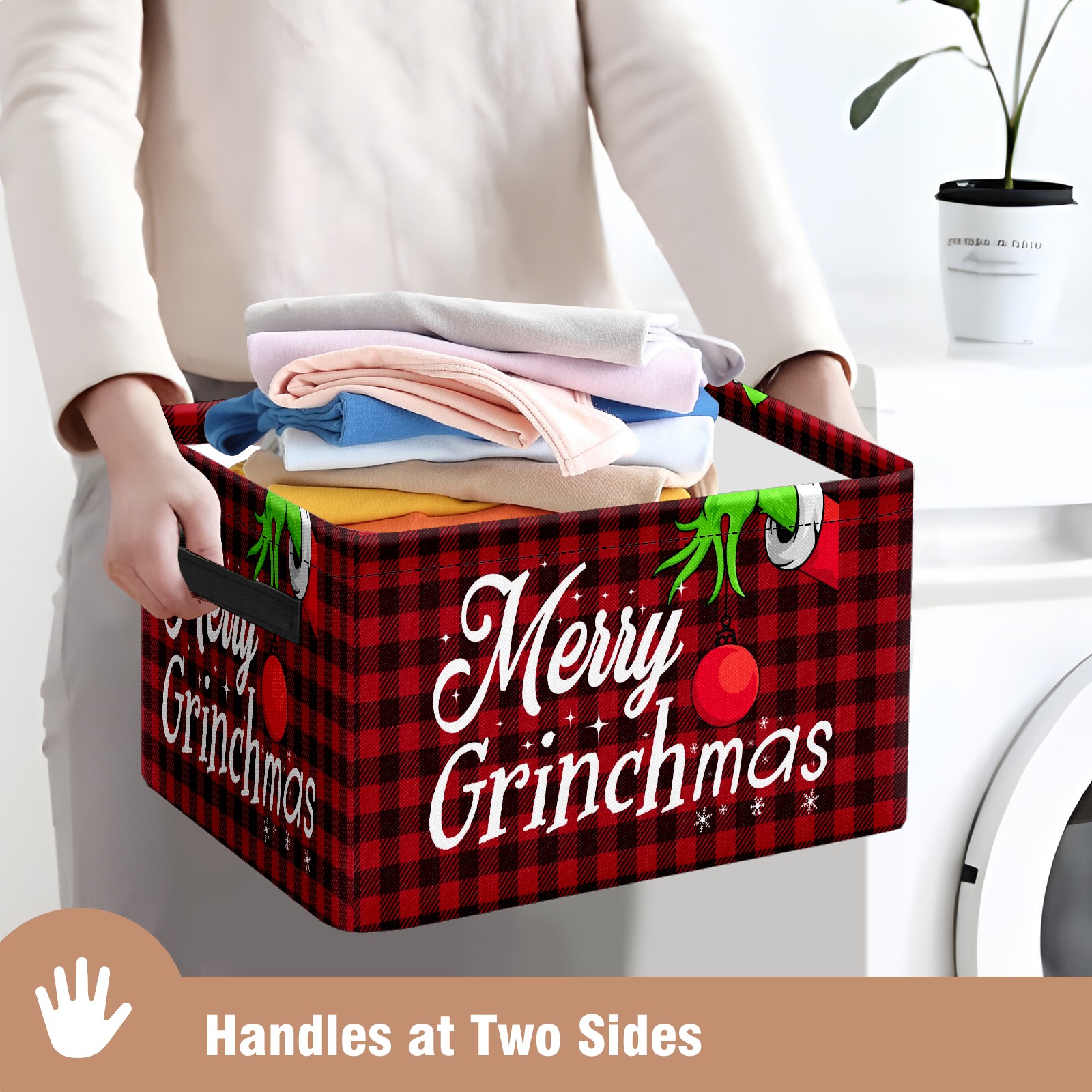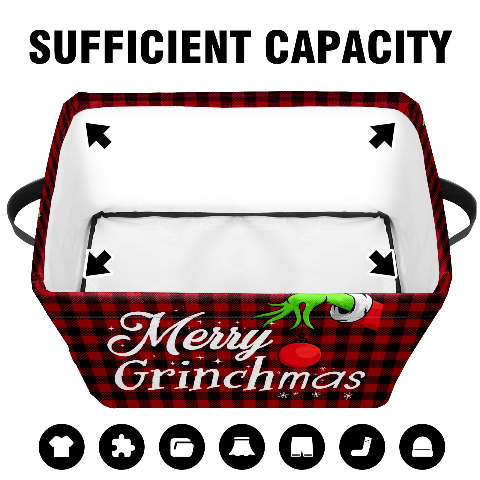 Fabric Storage Basket with Handles, 600D Oxford Cloth Organizer Bin with Metal Frame, Rectangular Storage Basket for Home, Office, School Merry Christmas Grinchmas Buffalo Plaid (1)