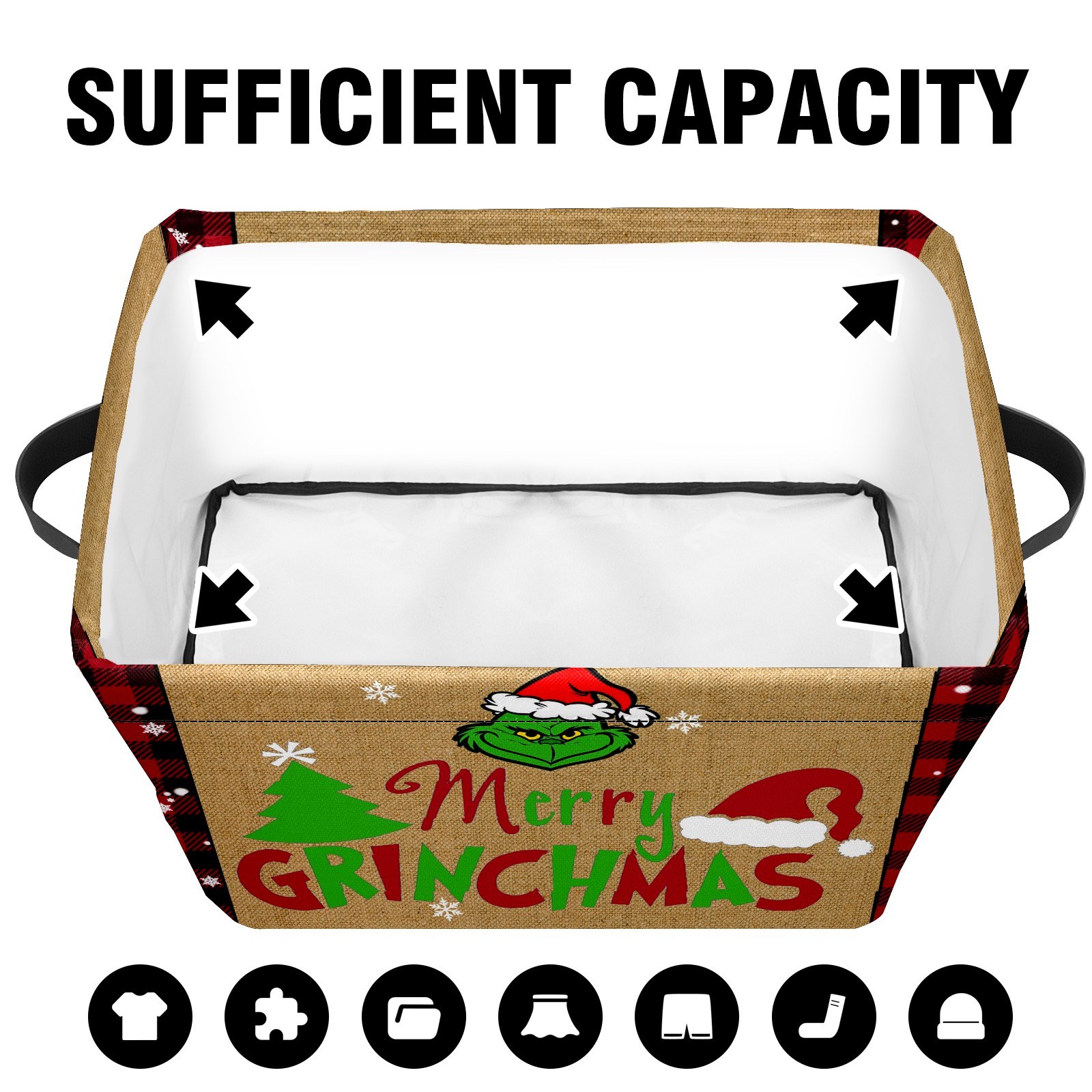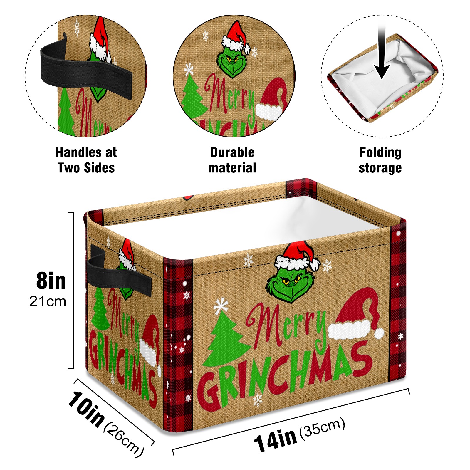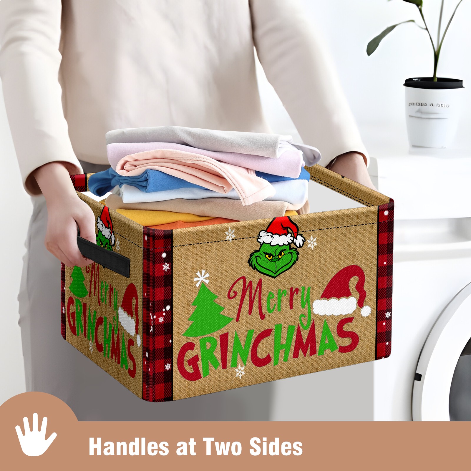 Fabric Storage Basket with Handles, 600D Oxford Cloth Organizer Bin with Metal Frame, Rectangular Storage Basket for Home, Office, School Merry Christmas Grinchmas