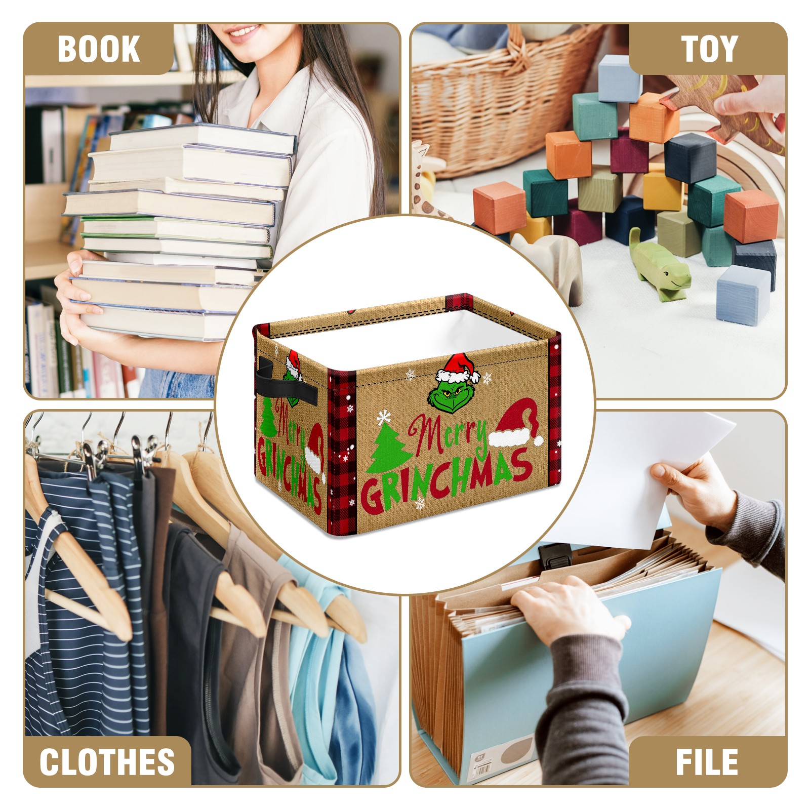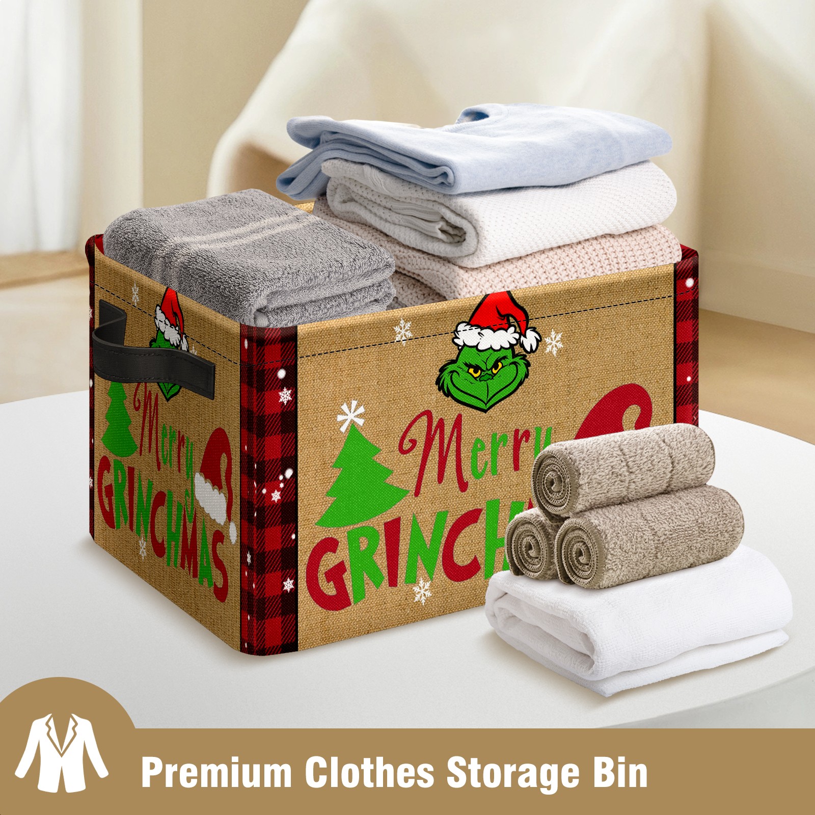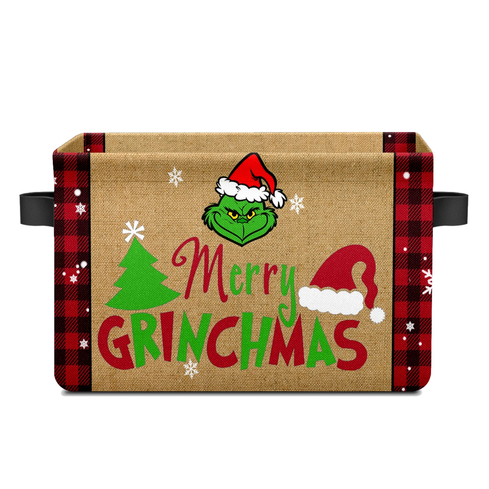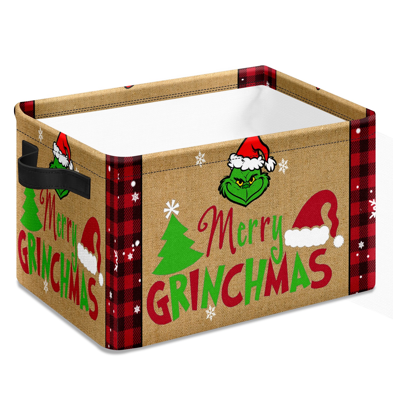 Fabric Storage Basket with Handles, 600D Oxford Cloth Organizer Bin with Metal Frame, Rectangular Storage Basket for Home, Office, School Merry Christmas Grinchmas