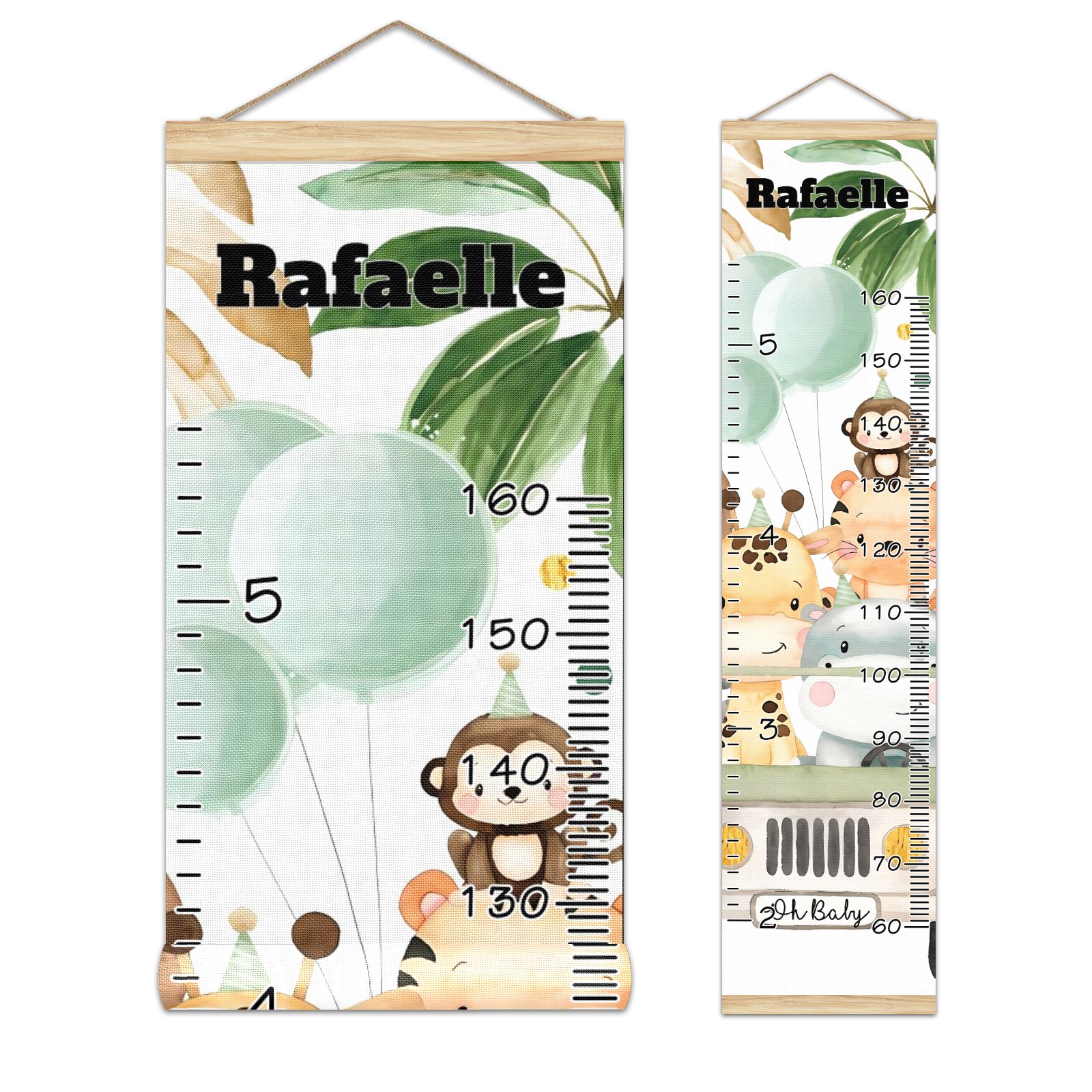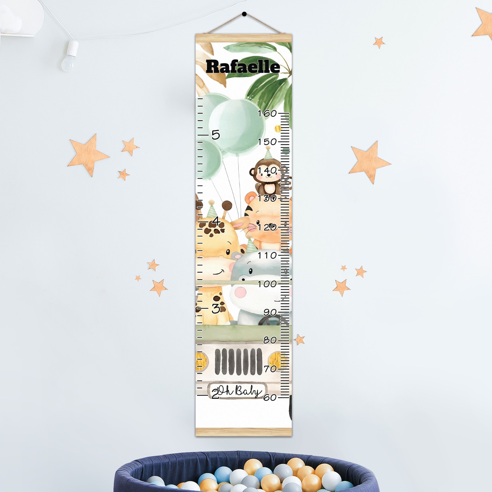 Personalized Kids Name Growth Chart Ruler for Wall Wood Frame Canvas Height Measure Chart 13.4x56 in Hanging Growth Chart Watercolor Safari Animals Jungle Greenery11.7 Boys Girls Room Decor