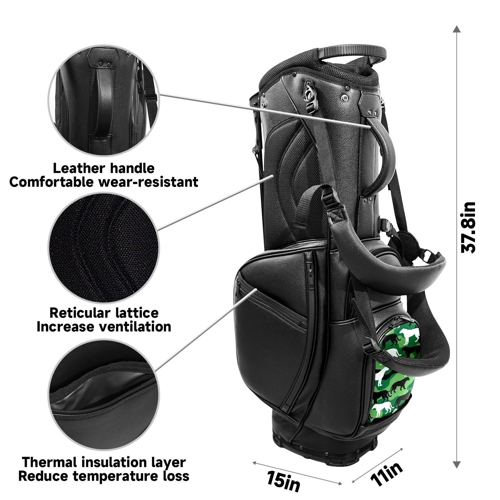 <p>This golf bag combines versatility, durability, and quality, providing comprehensive protection and easy access for your golf clubs. Its precise dimensions of 130 x 37 x 31 cm (with rain cover) and 90 x 31 x 37 cm (without rain cover) strike the perfect balance between portability and storage capacity.The five-way head frame (with five-way top compartments) allows for strategic compartmentalization, allowing you to neatly organize your various clubs and separate them to protect them from bumps, scratches, and scuffs. Its versatile compartmental design features a spacious five-compartment structure, including a separate, full-size club compartment, to fully accommodate your clubs while protecting their integrity.This bag features a versatile storage system with multiple waterproof zippered pockets for securely storing golf accessories, as well as a dedicated insulated cooler pocket with excellent insulation to keep your drinks cold. The built-in rain cover effectively repels moisture, ensuring your clubs remain dry and protected even in wet weather. For enhanced carrying comfort, this bag features ergonomically designed, padded, breathable, adjustable shoulder straps and an adjustable chest strap to distribute shoulder pressure for easier and more comfortable carrying. A portable rear handle makes lifting and carrying easier.Quality is evident in every detail: double-stitched reinforced edges enhance structural stability, smooth and durable zippers ensure long-lasting reliability, and wear-resistant bottom rivets ensure secure placement on all terrains, effectively preventing wear and tear. Crafted from classic pebbled matte PU fabric, it perfectly complements both business and casual occasions. Available in black and white, it exudes understated elegance and sophistication.This golf bag, with its sturdy plastic base, combines premium quality and durability, making it the ideal companion for every golfer, whether heading to the course for a casual round or attending a business golf event.</p>