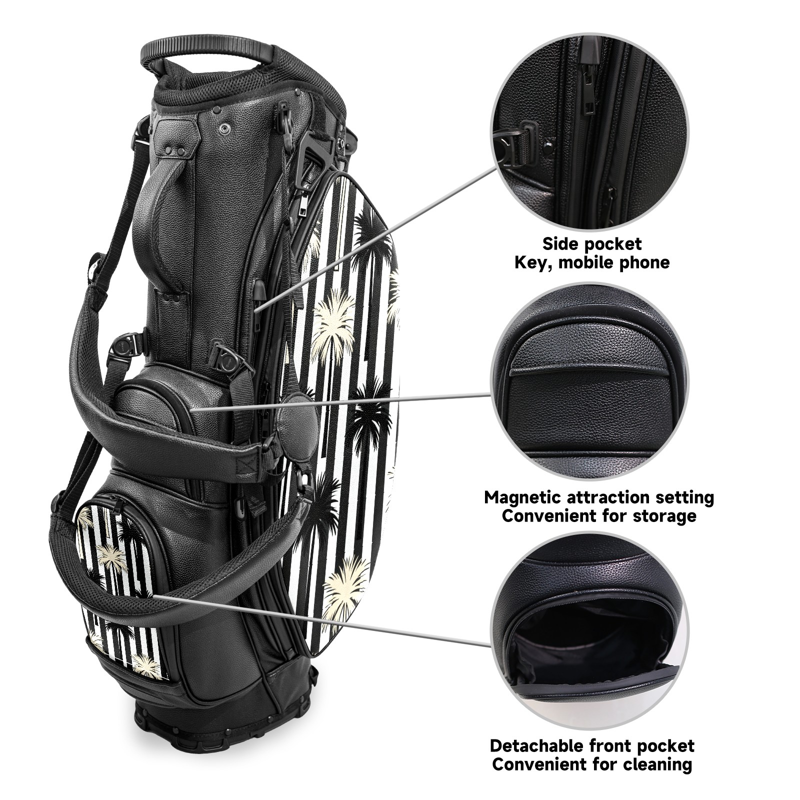 • <p>This golf bag combines versatility, durability, and quality, providing comprehensive protection and easy access for your golf clubs. Its precise dimensions of 130 x 37 x 31 cm (with rain cover) and 90 x 31 x 37 cm (without rain cover) strike the perfect balance between portability and storage capacity.The five-way head frame (with five-way top compartments) allows for strategic compartmentalization, allowing you to neatly organize your various clubs and separate them to protect them from bumps, scratches, and scuffs. Its versatile compartmental design features a spacious five-compartment structure, including a separate, full-size club compartment, to fully accommodate your clubs while protecting their integrity.This bag features a versatile storage system with multiple waterproof zippered pockets for securely storing golf accessories, as well as a dedicated insulated cooler pocket with excellent insulation to keep your drinks cold. The built-in rain cover effectively repels moisture, ensuring your clubs remain dry and protected even in wet weather. For enhanced carrying comfort, this bag features ergonomically designed, padded, breathable, adjustable shoulder straps and an adjustable chest strap to distribute shoulder pressure for easier and more comfortable carrying. A portable rear handle makes lifting and carrying easier.Quality is evident in every detail: double-stitched reinforced edges enhance structural stability, smooth and durable zippers ensure long-lasting reliability, and wear-resistant bottom rivets ensure secure placement on all terrains, effectively preventing wear and tear. Crafted from classic pebbled matte PU fabric, it perfectly complements both business and casual occasions. Available in black and white, it exudes understated elegance and sophistication.This golf bag, with its sturdy plastic base, combines premium quality and durability, making it the ideal companion for every golfer, whether heading to the course for a casual round or attending a business golf event.</p>
