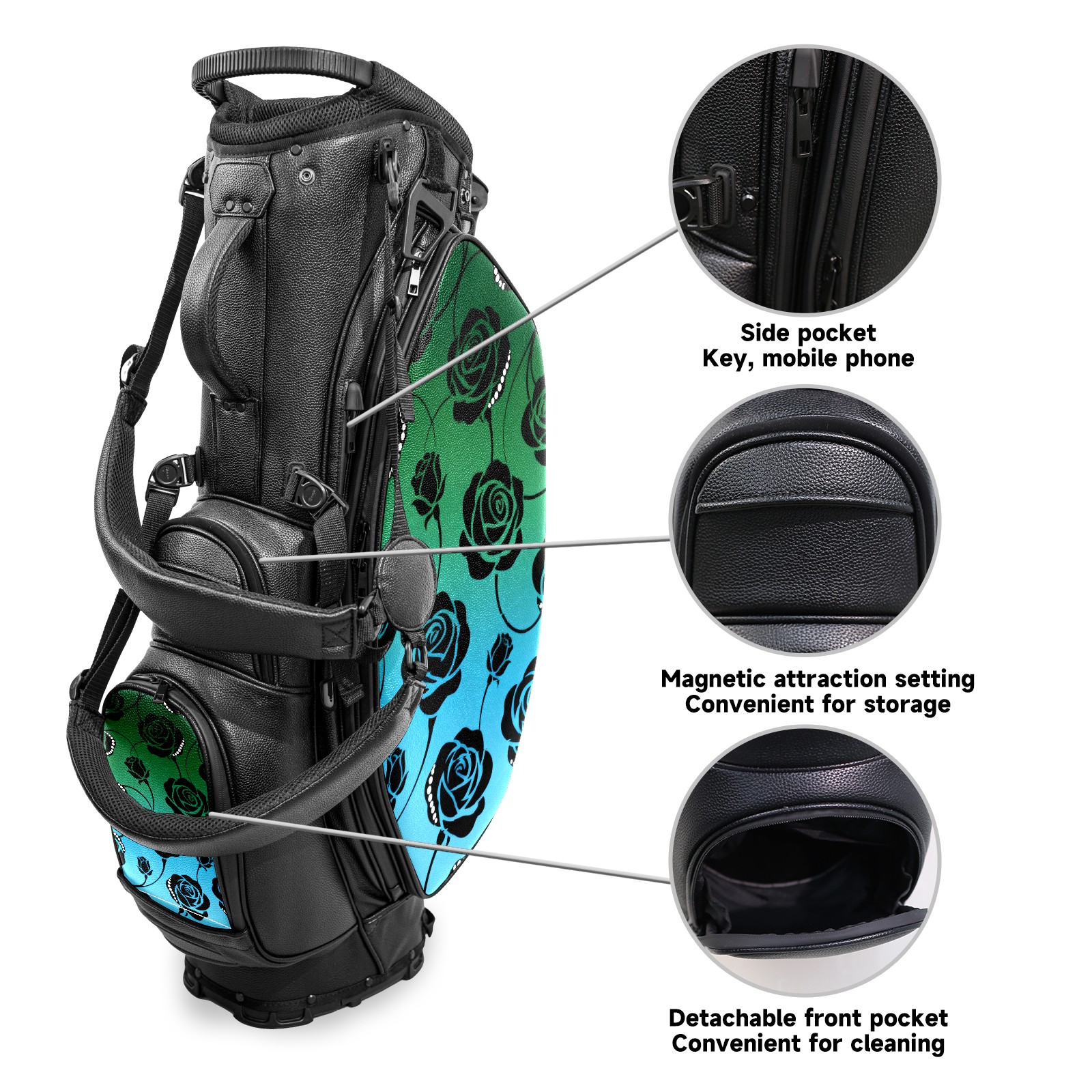 • <p>This golf bag combines versatility, durability, and quality, providing comprehensive protection and easy access for your golf clubs. Its precise dimensions of 130 x 37 x 31 cm (with rain cover) and 90 x 31 x 37 cm (without rain cover) strike the perfect balance between portability and storage capacity.The five-way head frame (with five-way top compartments) allows for strategic compartmentalization, allowing you to neatly organize your various clubs and separate them to protect them from bumps, scratches, and scuffs. Its versatile compartmental design features a spacious five-compartment structure, including a separate, full-size club compartment, to fully accommodate your clubs while protecting their integrity.This bag features a versatile storage system with multiple waterproof zippered pockets for securely storing golf accessories, as well as a dedicated insulated cooler pocket with excellent insulation to keep your drinks cold. The built-in rain cover effectively repels moisture, ensuring your clubs remain dry and protected even in wet weather. For enhanced carrying comfort, this bag features ergonomically designed, padded, breathable, adjustable shoulder straps and an adjustable chest strap to distribute shoulder pressure for easier and more comfortable carrying. A portable rear handle makes lifting and carrying easier.Quality is evident in every detail: double-stitched reinforced edges enhance structural stability, smooth and durable zippers ensure long-lasting reliability, and wear-resistant bottom rivets ensure secure placement on all terrains, effectively preventing wear and tear. Crafted from classic pebbled matte PU fabric, it perfectly complements both business and casual occasions. Available in black and white, it exudes understated elegance and sophistication.This golf bag, with its sturdy plastic base, combines premium quality and durability, making it the ideal companion for every golfer, whether heading to the course for a casual round or attending a business golf event.</p>