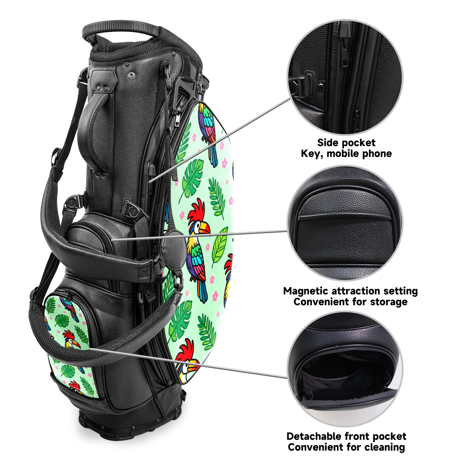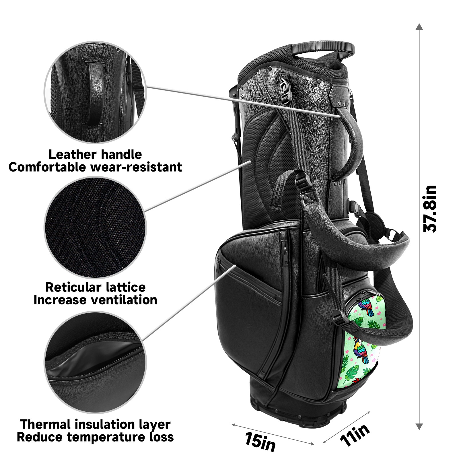 • <p>This golf bag combines versatility, durability, and quality, providing comprehensive protection and easy access for your golf clubs. Its precise dimensions of 130 x 37 x 31 cm (with rain cover) and 90 x 31 x 37 cm (without rain cover) strike the perfect balance between portability and storage capacity.The five-way head frame (with five-way top compartments) allows for strategic compartmentalization, allowing you to neatly organize your various clubs and separate them to protect them from bumps, scratches, and scuffs. Its versatile compartmental design features a spacious five-compartment structure, including a separate, full-size club compartment, to fully accommodate your clubs while protecting their integrity.This bag features a versatile storage system with multiple waterproof zippered pockets for securely storing golf accessories, as well as a dedicated insulated cooler pocket with excellent insulation to keep your drinks cold. The built-in rain cover effectively repels moisture, ensuring your clubs remain dry and protected even in wet weather. For enhanced carrying comfort, this bag features ergonomically designed, padded, breathable, adjustable shoulder straps and an adjustable chest strap to distribute shoulder pressure for easier and more comfortable carrying. A portable rear handle makes lifting and carrying easier.Quality is evident in every detail: double-stitched reinforced edges enhance structural stability, smooth and durable zippers ensure long-lasting reliability, and wear-resistant bottom rivets ensure secure placement on all terrains, effectively preventing wear and tear. Crafted from classic pebbled matte PU fabric, it perfectly complements both business and casual occasions. Available in black and white, it exudes understated elegance and sophistication.This golf bag, with its sturdy plastic base, combines premium quality and durability, making it the ideal companion for every golfer, whether heading to the course for a casual round or attending a business golf event.</p>
