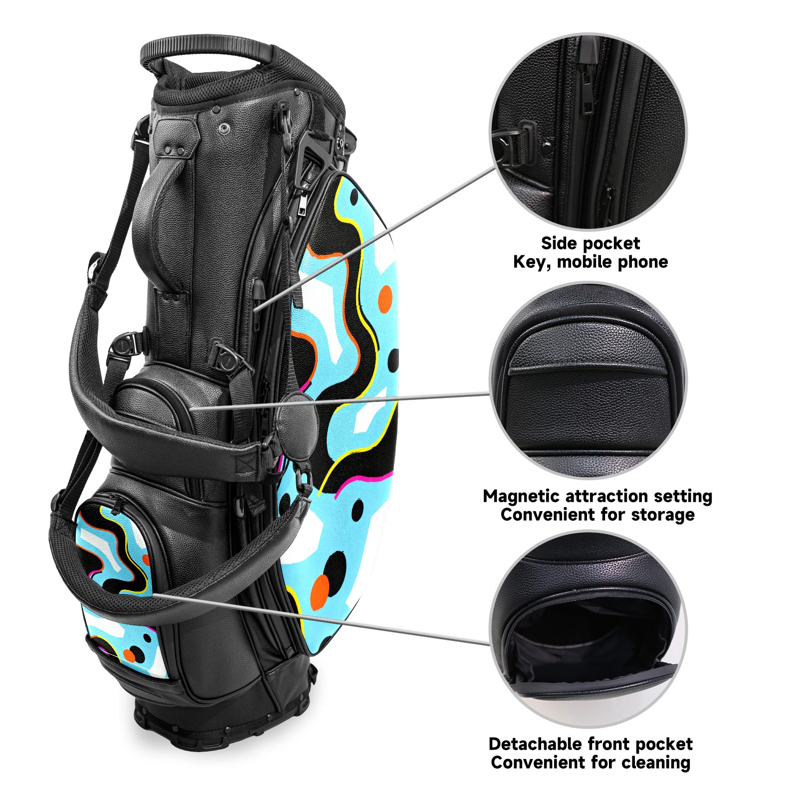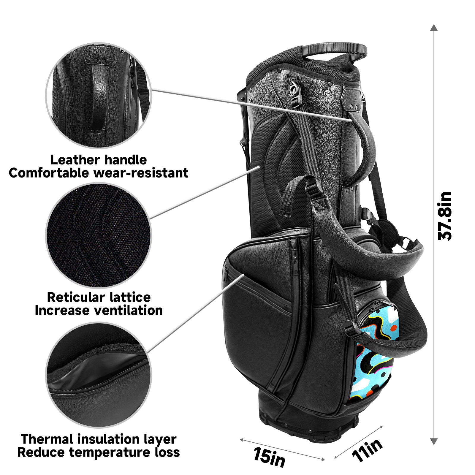 <p>This golf bag combines versatility, durability, and quality, providing comprehensive protection and easy access for your golf clubs. Its precise dimensions of 130 x 37 x 31 cm (with rain cover) and 90 x 31 x 37 cm (without rain cover) strike the perfect balance between portability and storage capacity.The five-way head frame (with five-way top compartments) allows for strategic compartmentalization, allowing you to neatly organize your various clubs and separate them to protect them from bumps, scratches, and scuffs. Its versatile compartmental design features a spacious five-compartment structure, including a separate, full-size club compartment, to fully accommodate your clubs while protecting their integrity.This bag features a versatile storage system with multiple waterproof zippered pockets for securely storing golf accessories, as well as a dedicated insulated cooler pocket with excellent insulation to keep your drinks cold. The built-in rain cover effectively repels moisture, ensuring your clubs remain dry and protected even in wet weather. For enhanced carrying comfort, this bag features ergonomically designed, padded, breathable, adjustable shoulder straps and an adjustable chest strap to distribute shoulder pressure for easier and more comfortable carrying. A portable rear handle makes lifting and carrying easier.Quality is evident in every detail: double-stitched reinforced edges enhance structural stability, smooth and durable zippers ensure long-lasting reliability, and wear-resistant bottom rivets ensure secure placement on all terrains, effectively preventing wear and tear. Crafted from classic pebbled matte PU fabric, it perfectly complements both business and casual occasions. Available in black and white, it exudes understated elegance and sophistication.This golf bag, with its sturdy plastic base, combines premium quality and durability, making it the ideal companion for every golfer, whether heading to the course for a casual round or attending a business golf event.</p>