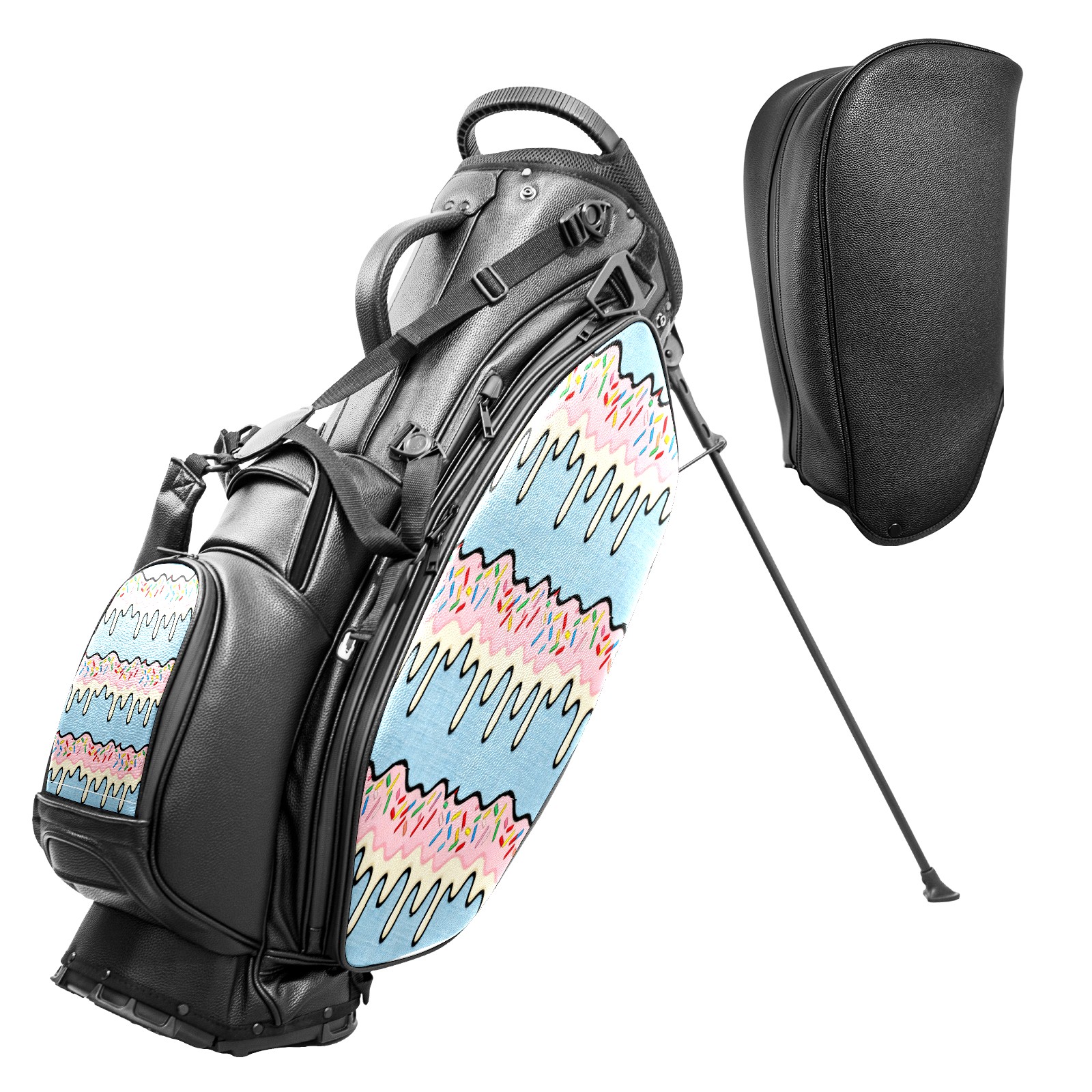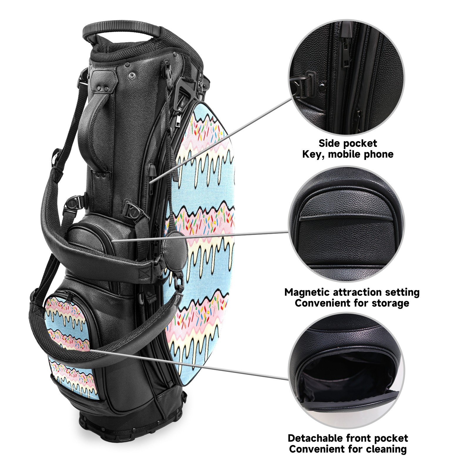 • <p>This golf bag combines versatility, durability, and quality, providing comprehensive protection and easy access for your golf clubs. Its precise dimensions of 130 x 37 x 31 cm (with rain cover) and 90 x 31 x 37 cm (without rain cover) strike the perfect balance between portability and storage capacity.The five-way head frame (with five-way top compartments) allows for strategic compartmentalization, allowing you to neatly organize your various clubs and separate them to protect them from bumps, scratches, and scuffs. Its versatile compartmental design features a spacious five-compartment structure, including a separate, full-size club compartment, to fully accommodate your clubs while protecting their integrity.This bag features a versatile storage system with multiple waterproof zippered pockets for securely storing golf accessories, as well as a dedicated insulated cooler pocket with excellent insulation to keep your drinks cold. The built-in rain cover effectively repels moisture, ensuring your clubs remain dry and protected even in wet weather. For enhanced carrying comfort, this bag features ergonomically designed, padded, breathable, adjustable shoulder straps and an adjustable chest strap to distribute shoulder pressure for easier and more comfortable carrying. A portable rear handle makes lifting and carrying easier.Quality is evident in every detail: double-stitched reinforced edges enhance structural stability, smooth and durable zippers ensure long-lasting reliability, and wear-resistant bottom rivets ensure secure placement on all terrains, effectively preventing wear and tear. Crafted from classic pebbled matte PU fabric, it perfectly complements both business and casual occasions. Available in black and white, it exudes understated elegance and sophistication.This golf bag, with its sturdy plastic base, combines premium quality and durability, making it the ideal companion for every golfer, whether heading to the course for a casual round or attending a business golf event.</p>