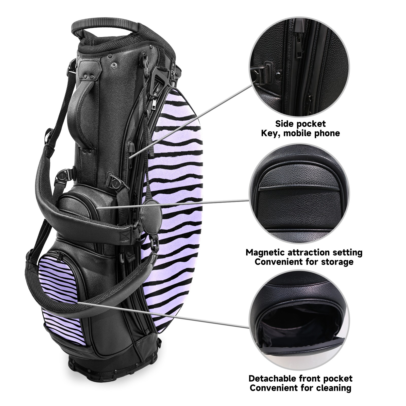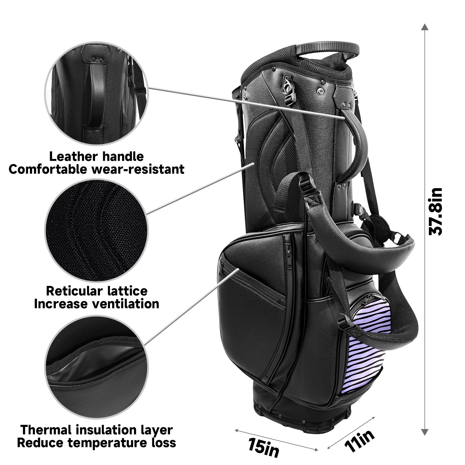 • <p>This golf bag combines versatility, durability, and quality, providing comprehensive protection and easy access for your golf clubs. Its precise dimensions of 130 x 37 x 31 cm (with rain cover) and 90 x 31 x 37 cm (without rain cover) strike the perfect balance between portability and storage capacity.The five-way head frame (with five-way top compartments) allows for strategic compartmentalization, allowing you to neatly organize your various clubs and separate them to protect them from bumps, scratches, and scuffs. Its versatile compartmental design features a spacious five-compartment structure, including a separate, full-size club compartment, to fully accommodate your clubs while protecting their integrity.This bag features a versatile storage system with multiple waterproof zippered pockets for securely storing golf accessories, as well as a dedicated insulated cooler pocket with excellent insulation to keep your drinks cold. The built-in rain cover effectively repels moisture, ensuring your clubs remain dry and protected even in wet weather. For enhanced carrying comfort, this bag features ergonomically designed, padded, breathable, adjustable shoulder straps and an adjustable chest strap to distribute shoulder pressure for easier and more comfortable carrying. A portable rear handle makes lifting and carrying easier.Quality is evident in every detail: double-stitched reinforced edges enhance structural stability, smooth and durable zippers ensure long-lasting reliability, and wear-resistant bottom rivets ensure secure placement on all terrains, effectively preventing wear and tear. Crafted from classic pebbled matte PU fabric, it perfectly complements both business and casual occasions. Available in black and white, it exudes understated elegance and sophistication.This golf bag, with its sturdy plastic base, combines premium quality and durability, making it the ideal companion for every golfer, whether heading to the course for a casual round or attending a business golf event.</p>