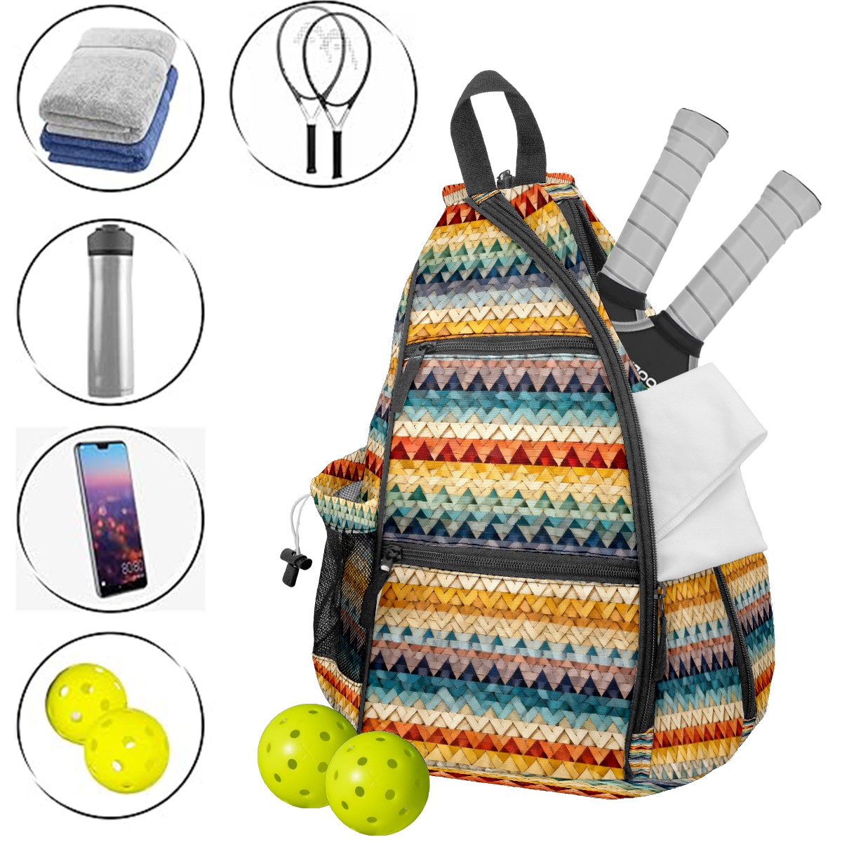 Pickleball Sling Bag for Women and Men - Backpack with Nylon Fabric/Woven Strap/Mesh Pocket/Fence Hook/Large Capacity/Adjustable Sling Bag Triangle Weave