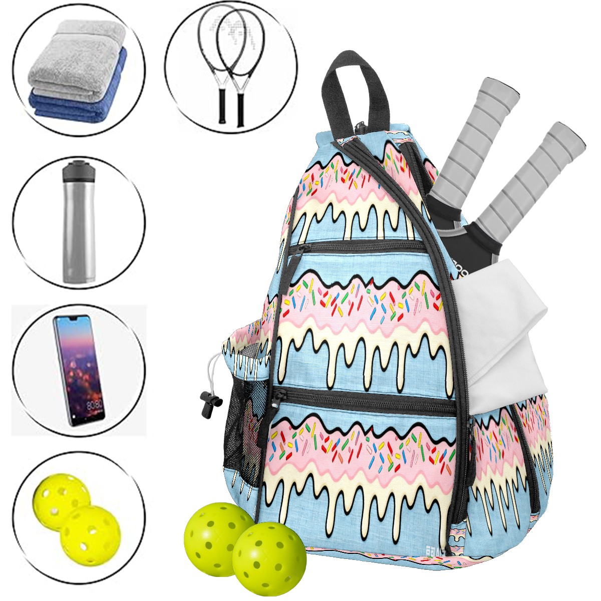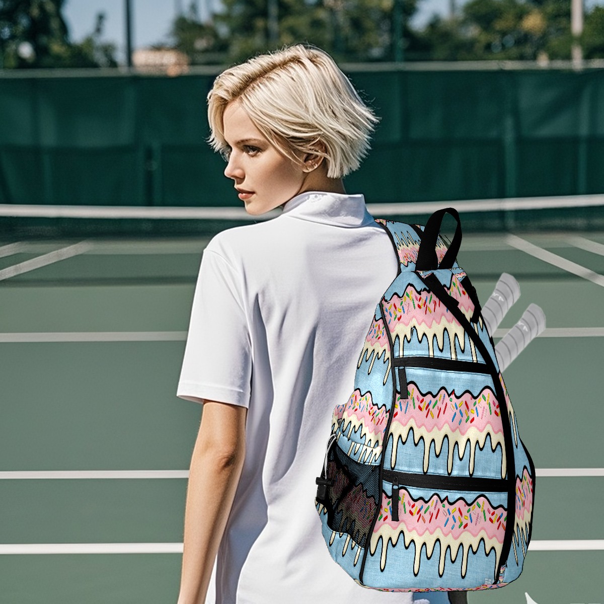 • <p>Pickleball Bag | From “Equipment Chaos” to “One Bag to Rule Them All” — A Revolution on the Court</p> <p>The Origin: Every time we bent down to pick up scattered rackets, balls, and water bottles, we silently vowed — we had to create a pickleball bag that could “cure laziness”!</p> <p>✨ 5 Core Features, Designed for Pickleball Players</p> <p>✅ Durable Construction: Wear-resistant nylon + reinforced woven straps + breathable mesh pockets withstand the “brutal tests” of dropping rackets and dragging on the ground; the mesh pockets also allow wet towels to “breathe”;</p> <p>✅ Spacious storage: 15×35×45cm golden dimensions, easily accommodating 2 racquets + 10 balls + water bottle + spare clothes, saying goodbye to the awkwardness of “left hand holding the racquet, right hand chasing the ball”;</p> <p>✅ Cloud-like carrying experience: Padded back panel + air mesh shoulder straps, feel like you're being carried by a cloud while swinging your racket, no sweating even after prolonged use, no soreness after playing, keep your energy for what you love;</p> <p>✅ Transformable magic: Shoulder straps hide a “zipper mechanism,” unzip to instantly transform into a daily crossbody bag — take it straight to the mall after work, seamless transition from commuting to playing;</p> <p>✅ Bag Recognition Tool: Exclusive contrasting patterns act like a “signal flare” on the court, making your bag stand out in a crowd. No more worries about grabbing the wrong one!</p> <p>Starting with solving your own problems, we hope this bag will accompany you in swinging your racket with abandon, leaving all your energy for what you love!</p>