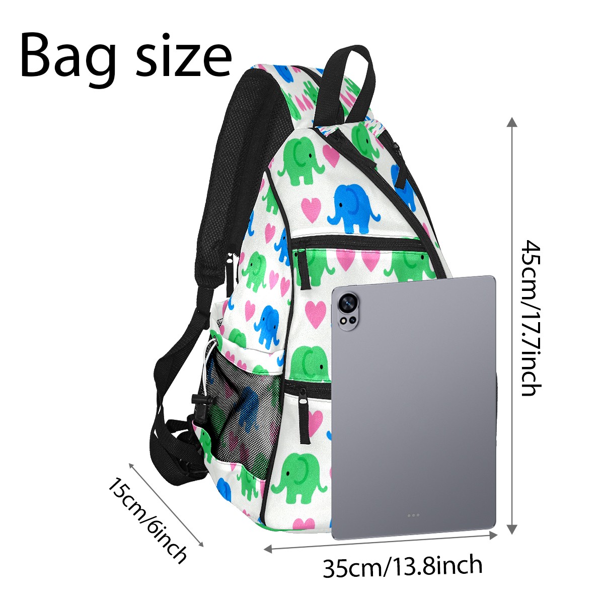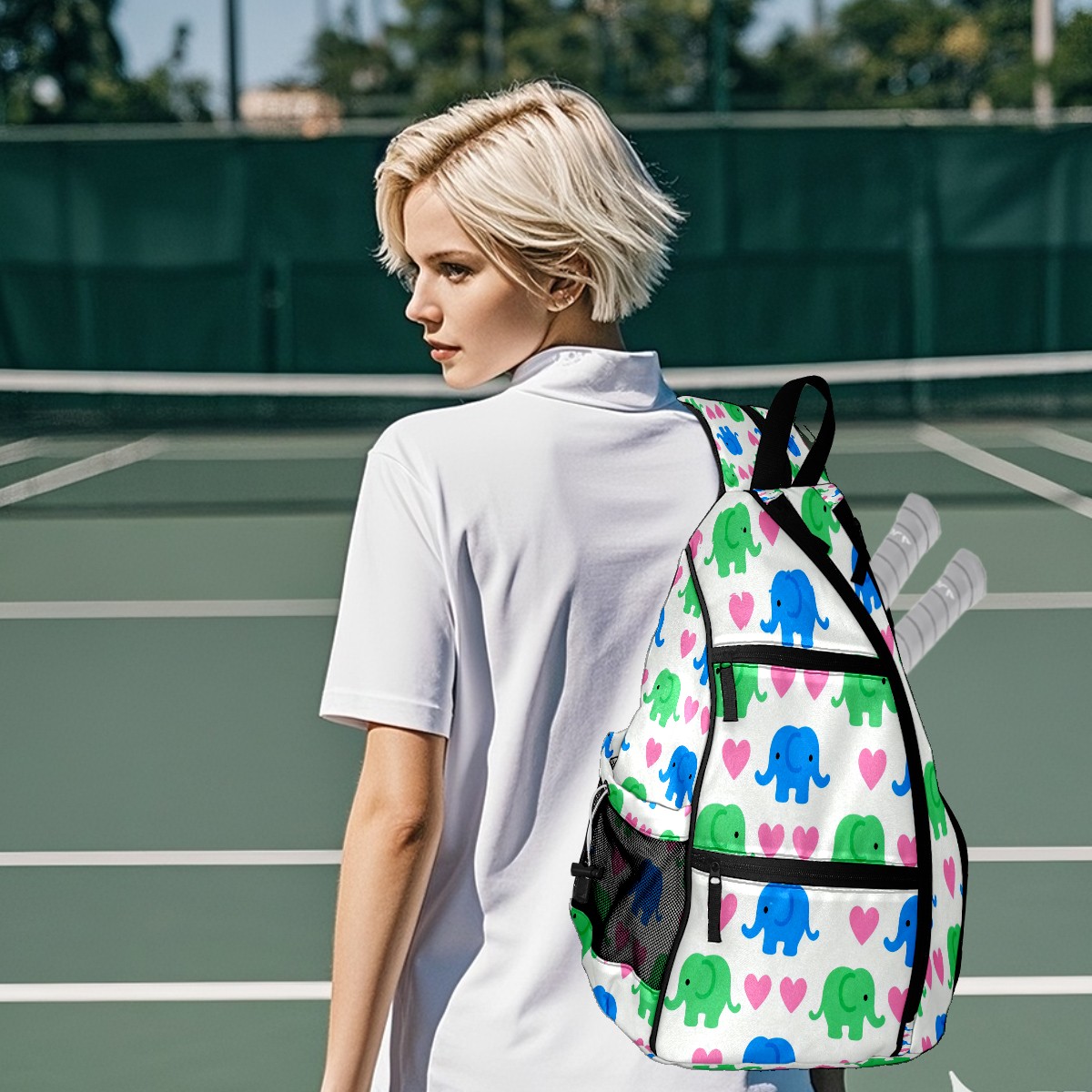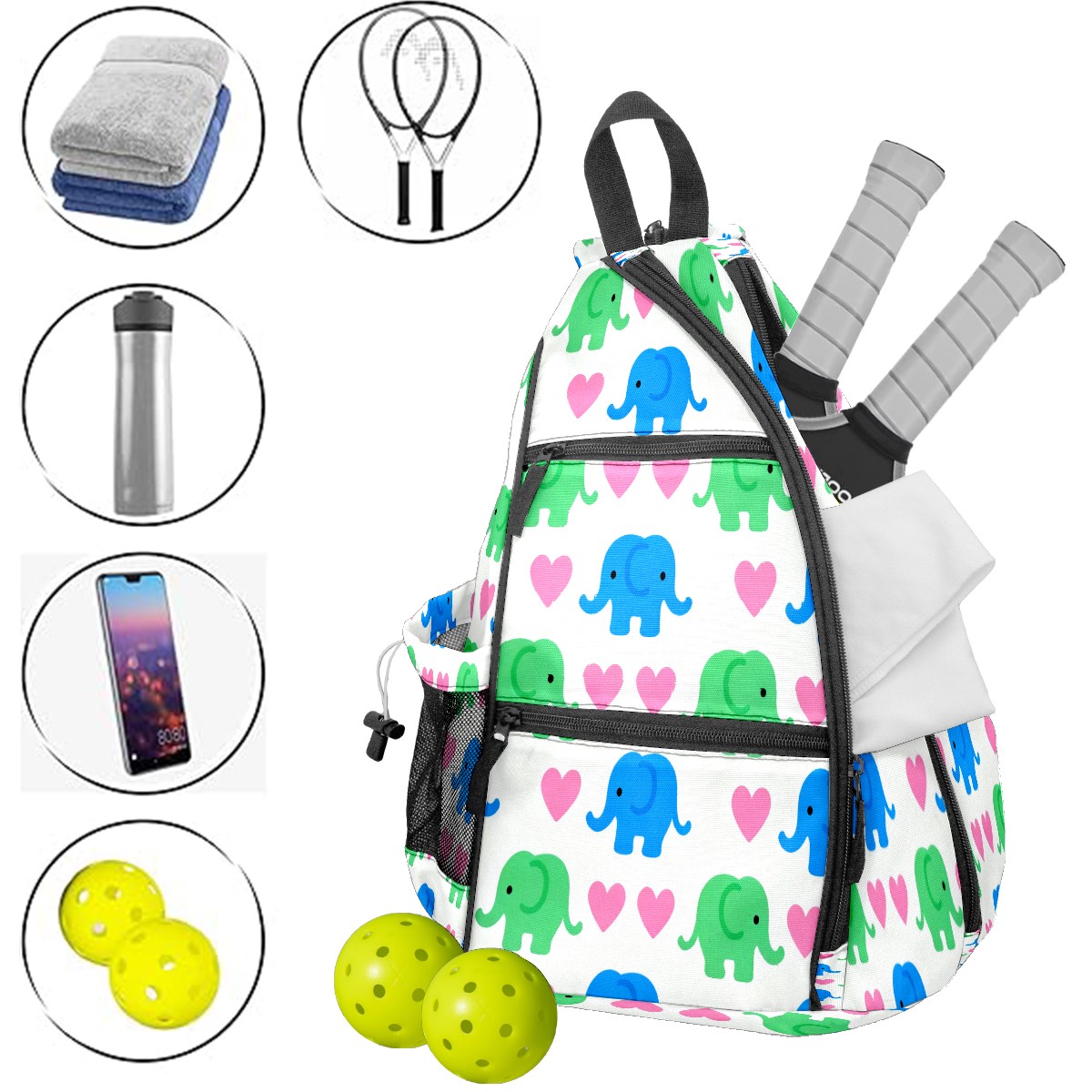Pickleball Sling Bag for Women and Men - Backpack with Nylon Fabric/Woven Strap/Mesh Pocket/Fence Hook/Large Capacity/Adjustable Sling Bag Elephant Heart Pattern