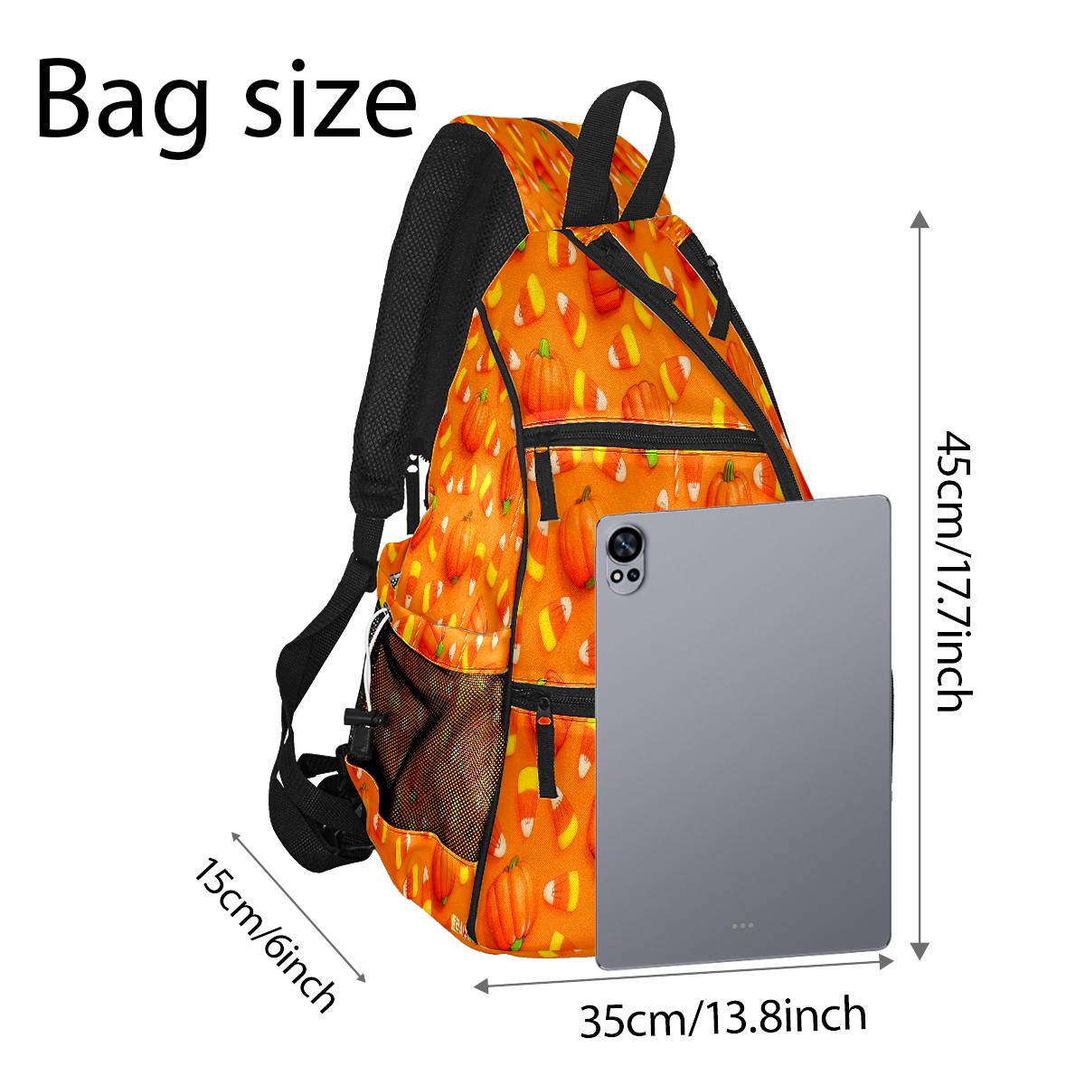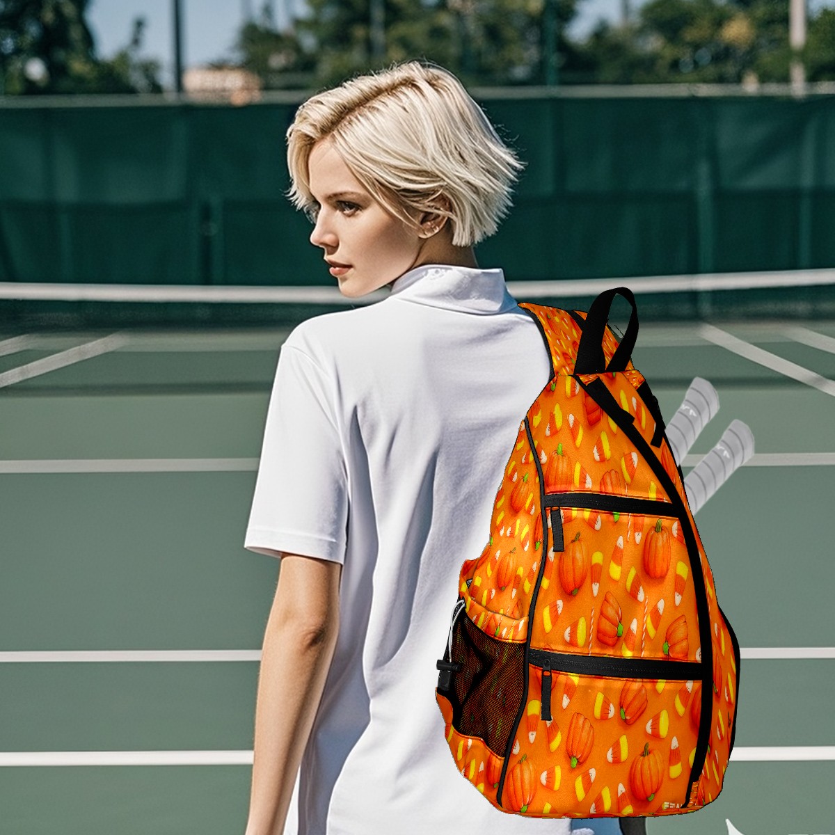 Pickleball Sling Bag for Women and Men - Backpack with Nylon Fabric/Woven Strap/Mesh Pocket/Fence Hook/Large Capacity/Adjustable Sling Bag Pumpkin Candy