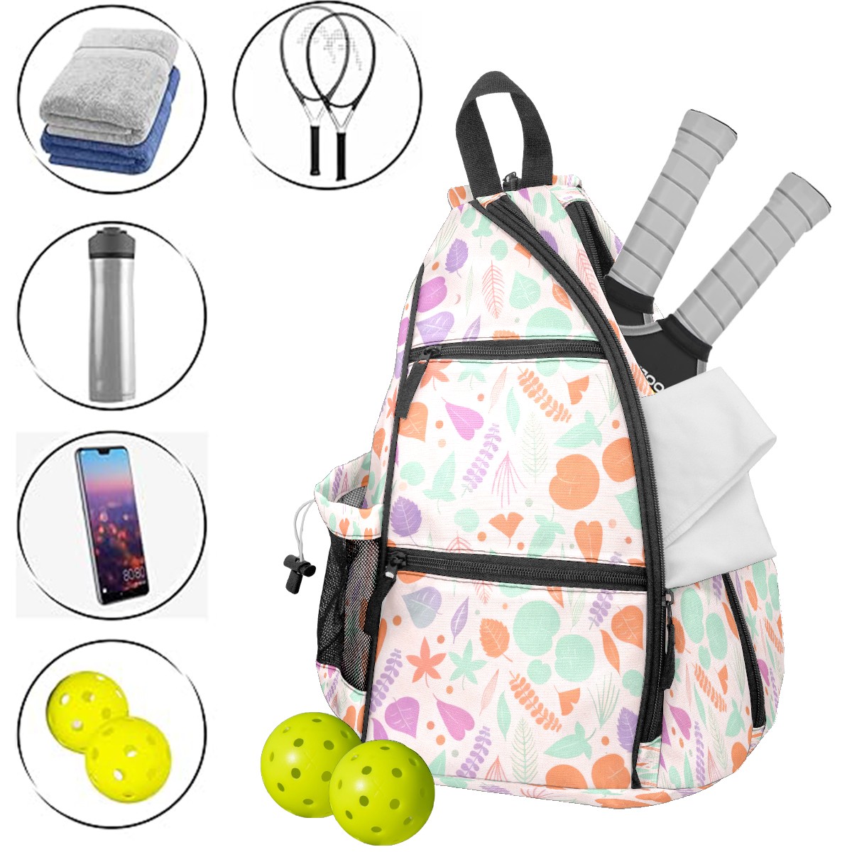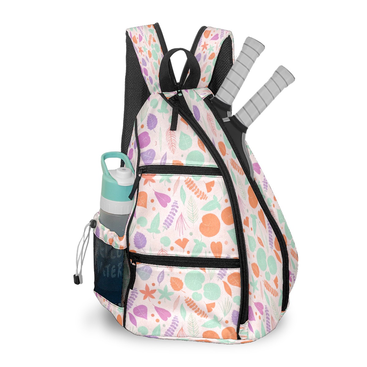 Pickleball Sling Bag for Women and Men - Backpack with Nylon Fabric/Woven Strap/Mesh Pocket/Fence Hook/Large Capacity/Adjustable Sling Bag Colorful Leaf