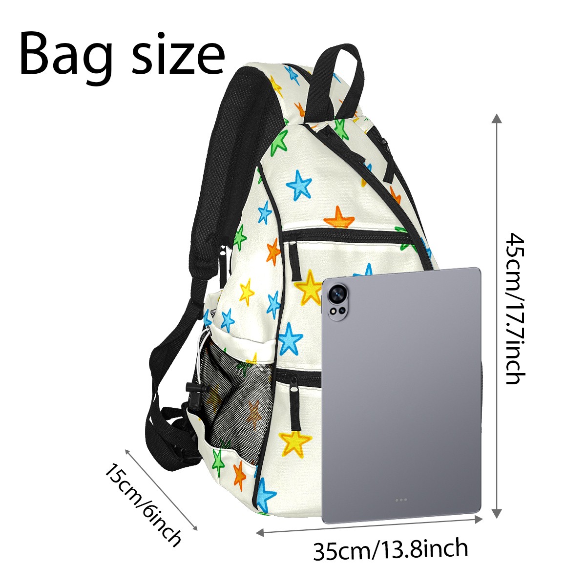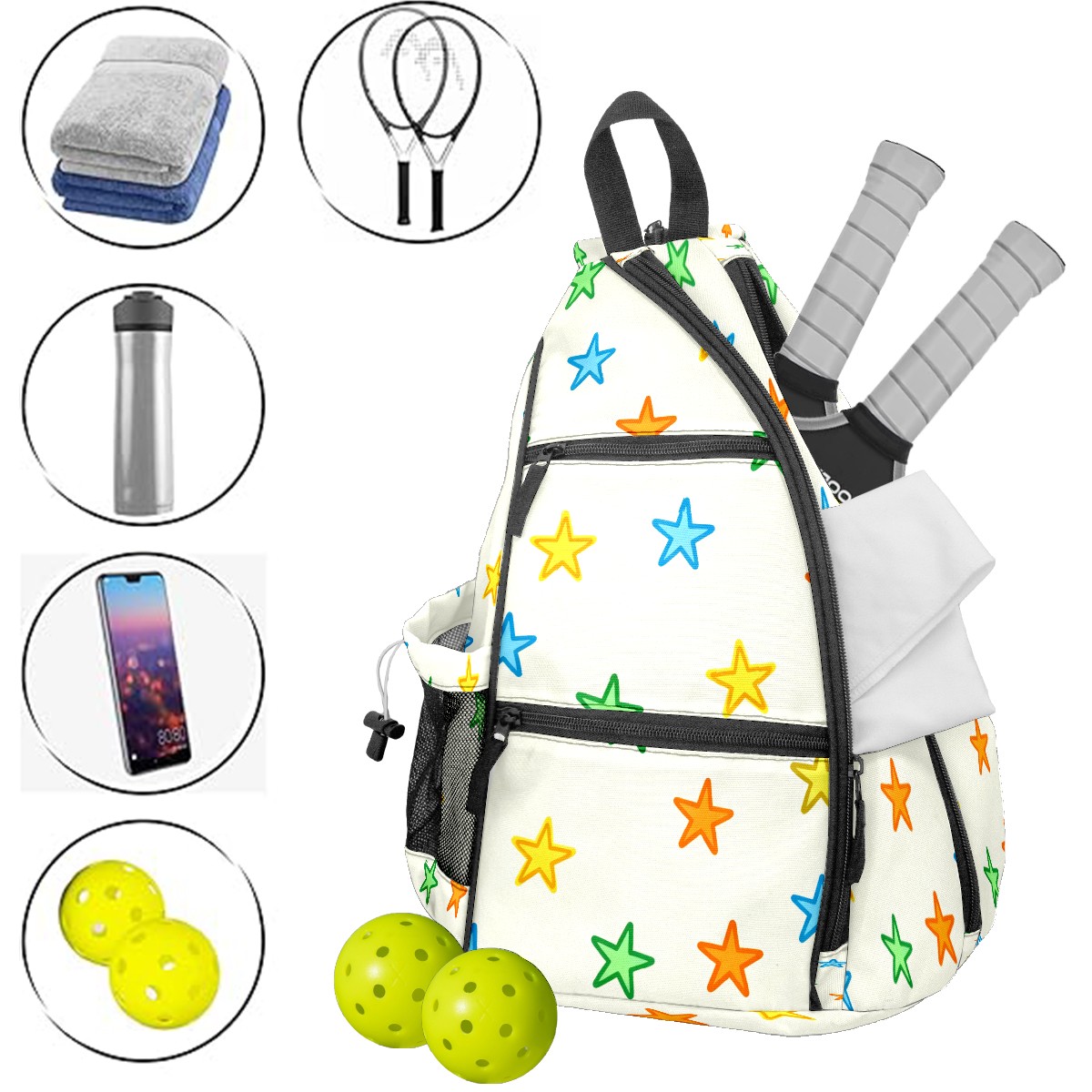 Pickleball Sling Bag for Women and Men - Backpack with Nylon Fabric/Woven Strap/Mesh Pocket/Fence Hook/Large Capacity/Adjustable Sling Bag Colorful Star