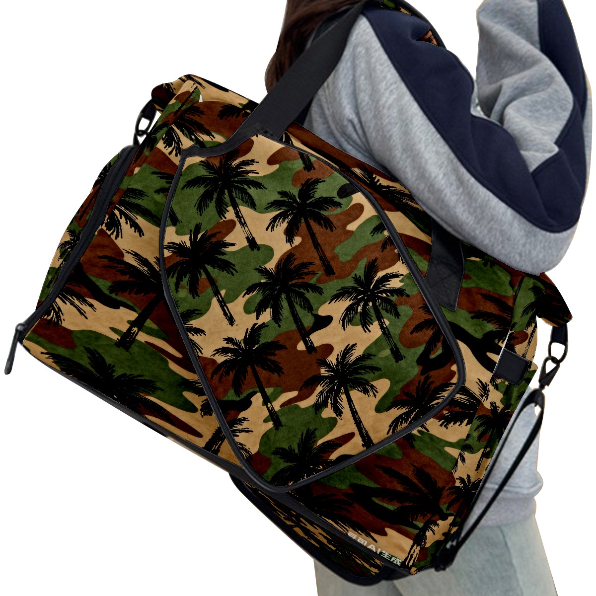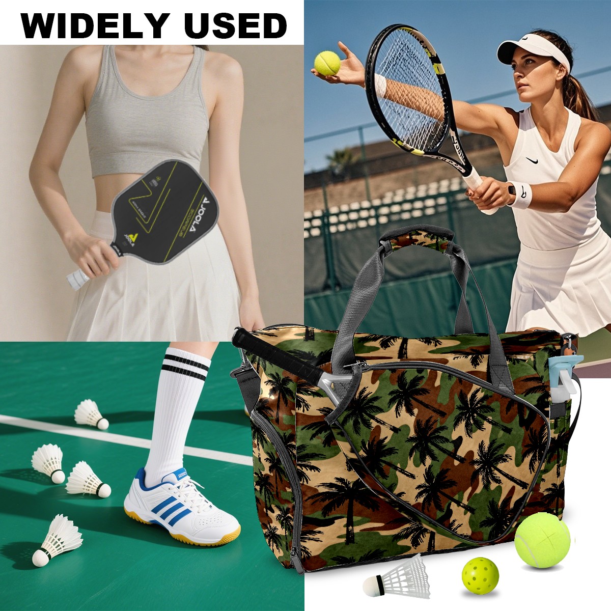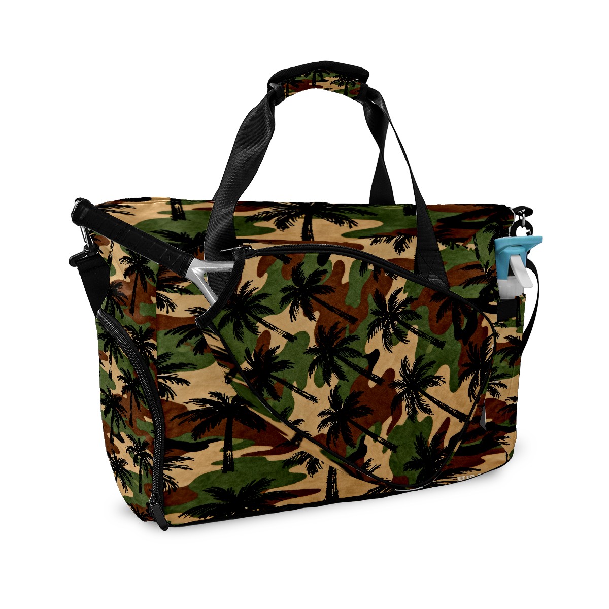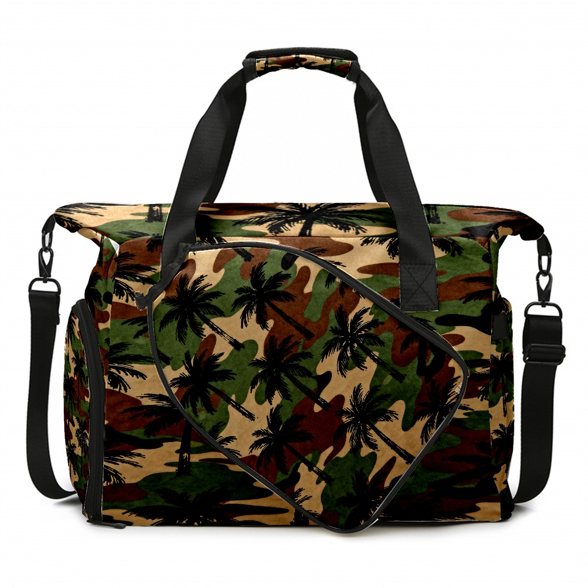 Lightweight Pickleball Tote Bag with Large Capacity, Shoe Compartment, Large Paddle Storage, Water Bottle Holder & Fence Hook for Women & Men Camouflage Palm Tree Pattern
