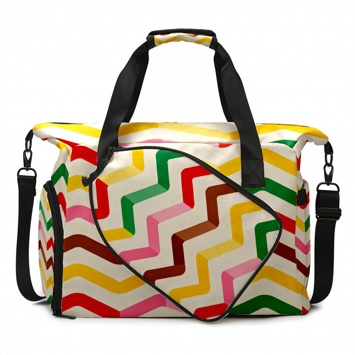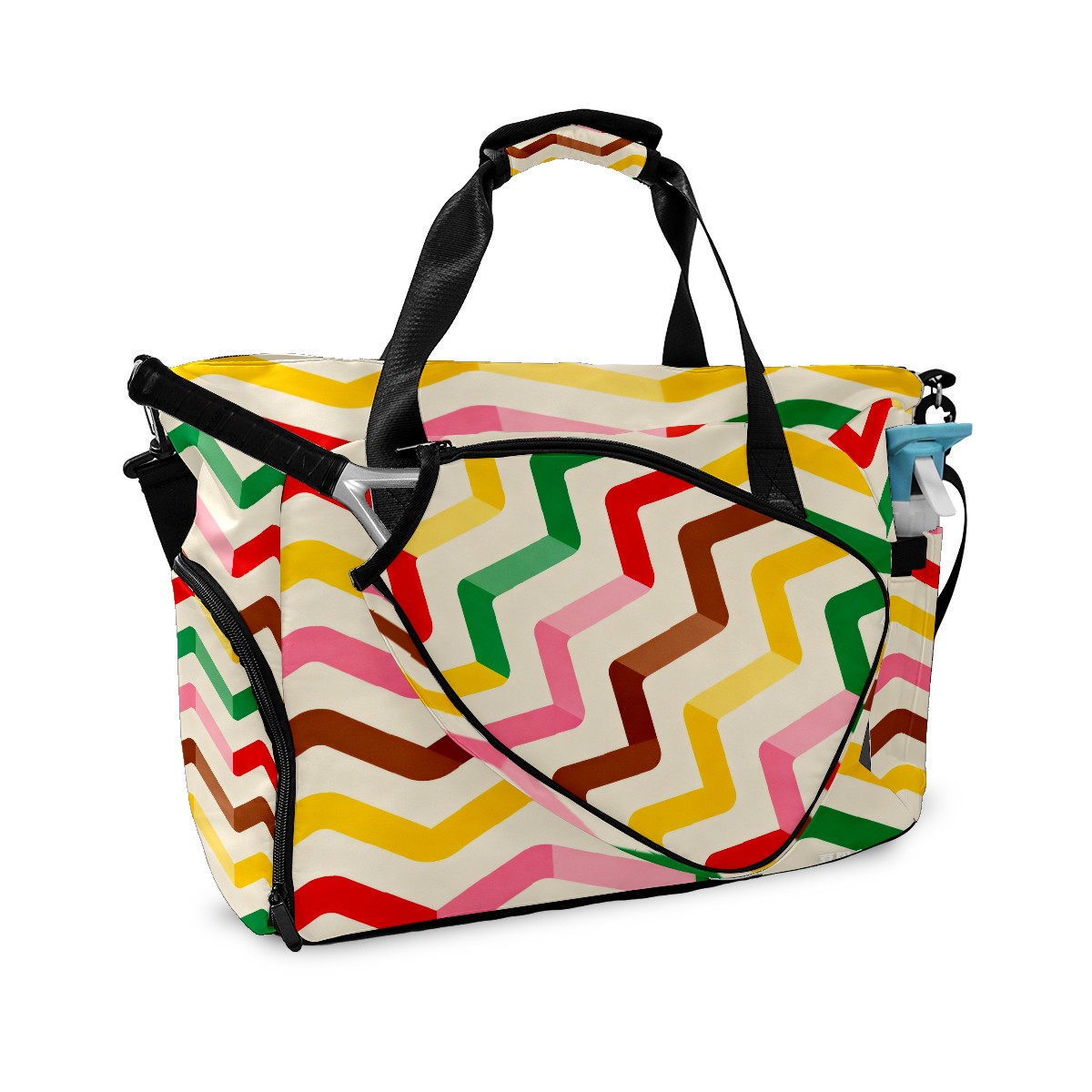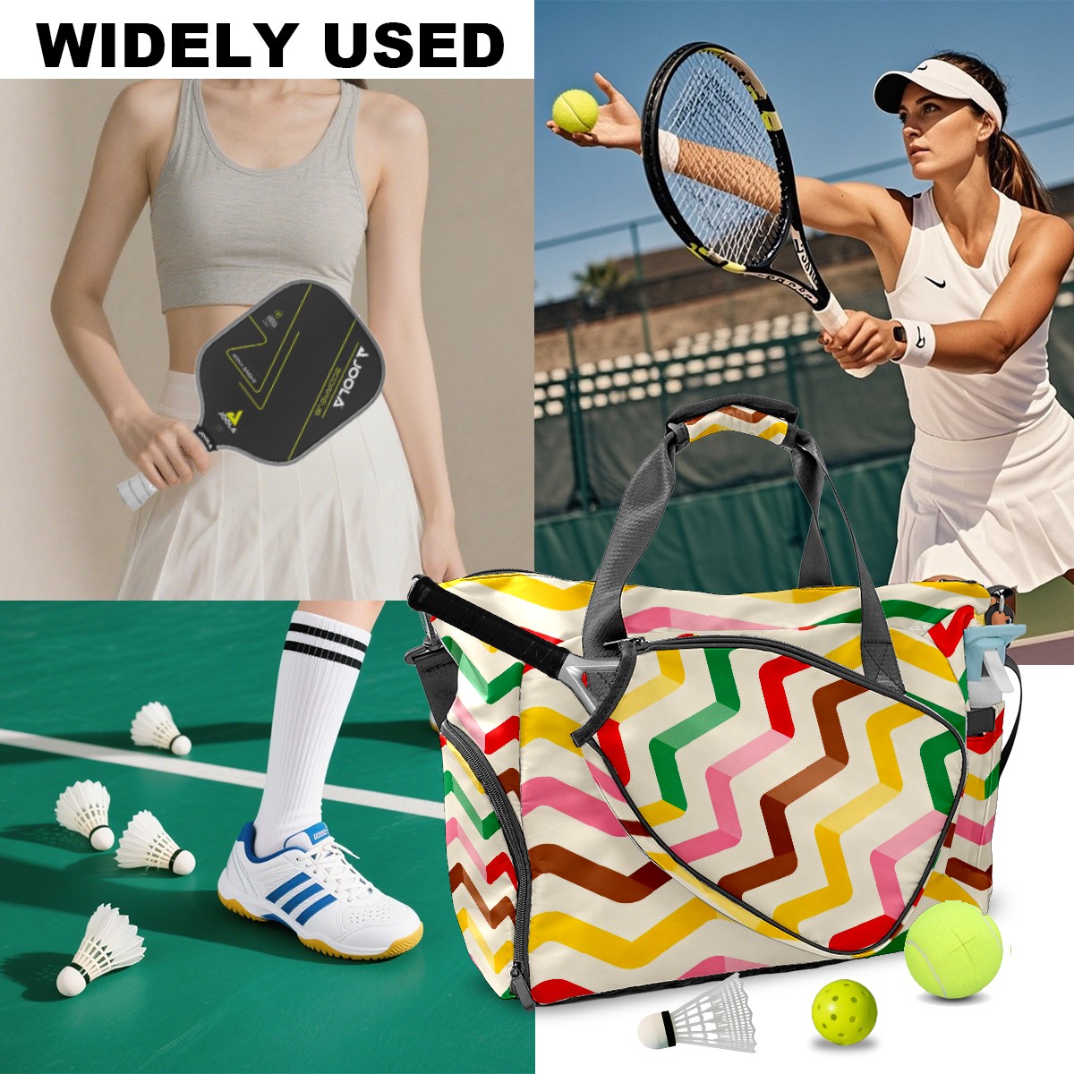 Lightweight Pickleball Tote Bag with Large Capacity, Shoe Compartment, Large Paddle Storage, Water Bottle Holder & Fence Hook for Women & Men Colorful Zigzag Pattern