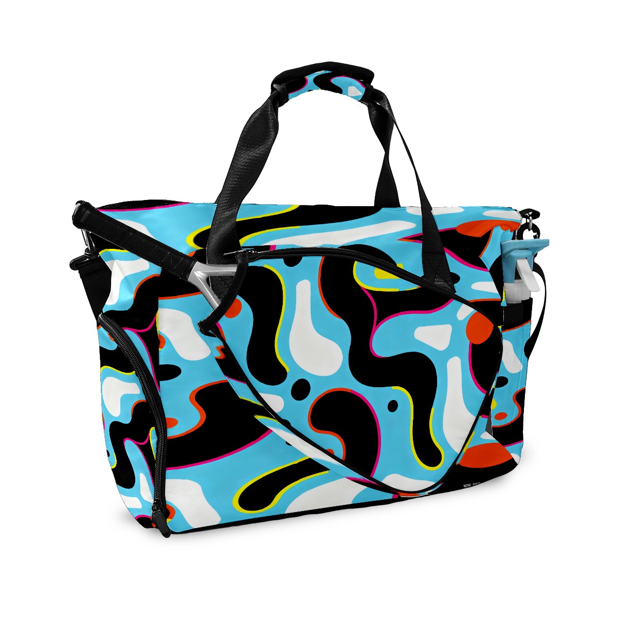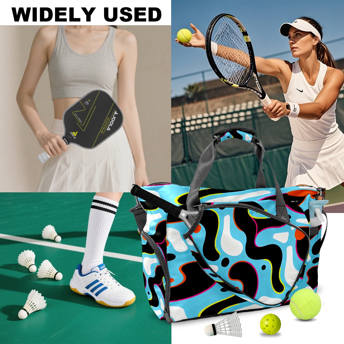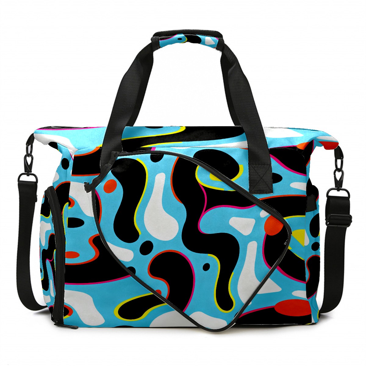 Lightweight Pickleball Tote Bag with Large Capacity, Shoe Compartment, Large Paddle Storage, Water Bottle Holder & Fence Hook for Women & Men Light Blue Colorful Curves