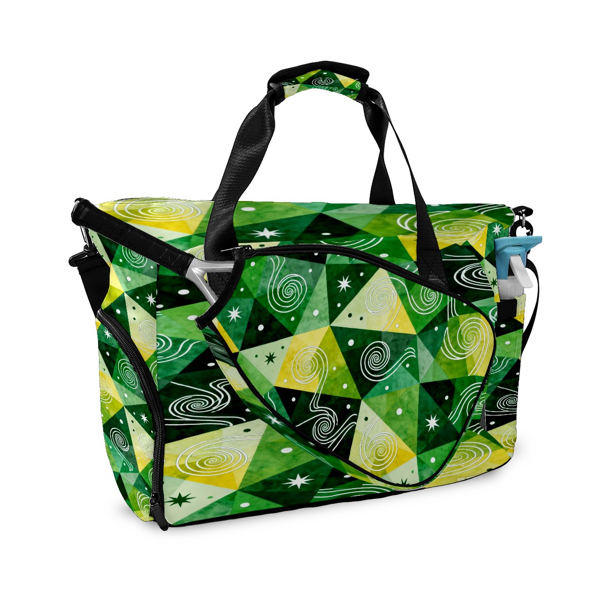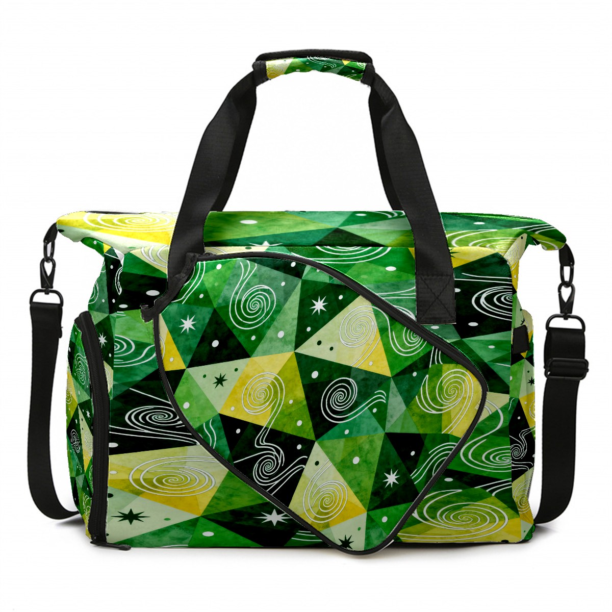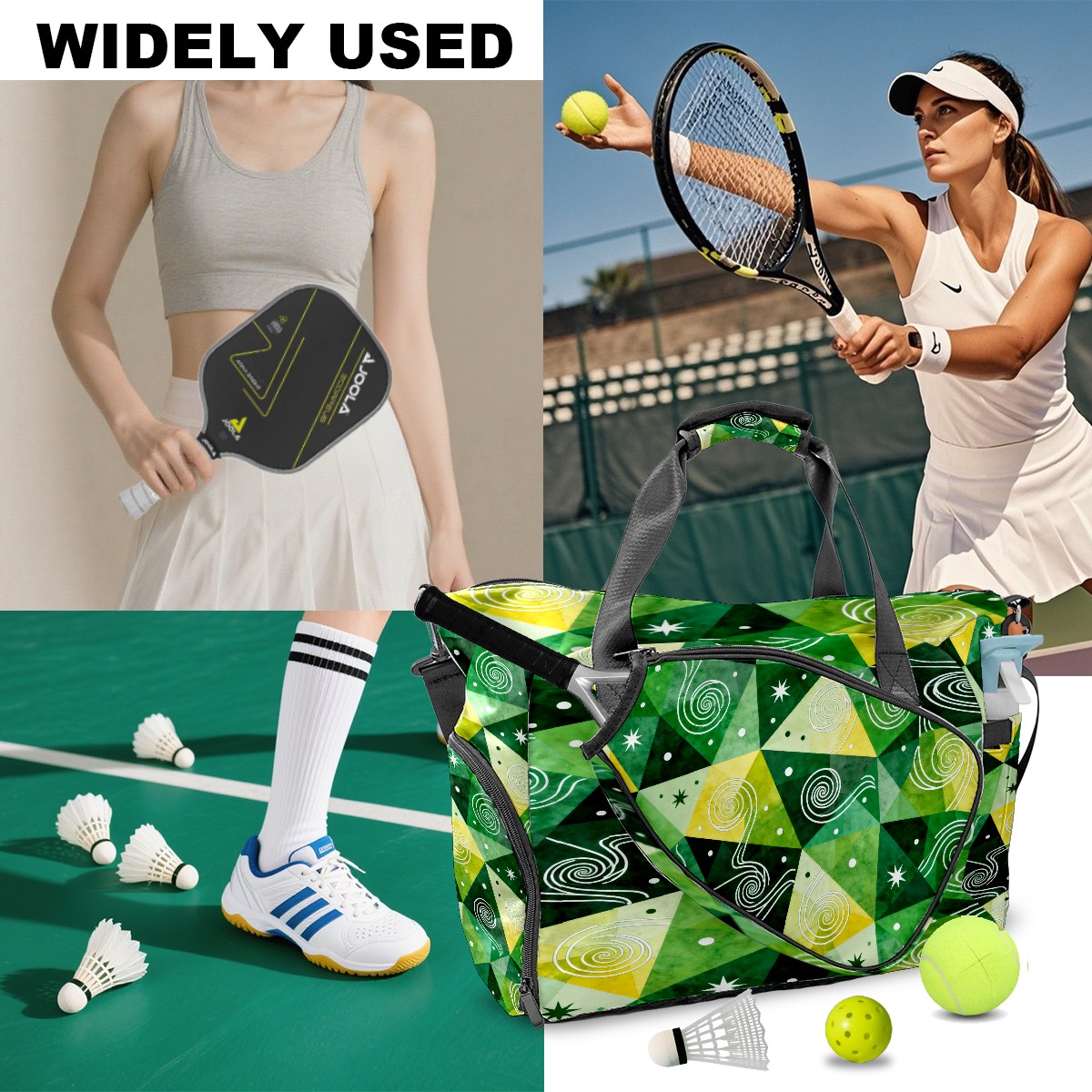 Lightweight Pickleball Tote Bag with Large Capacity, Shoe Compartment, Large Paddle Storage, Water Bottle Holder & Fence Hook for Women & Men Green Geometric Swirling Pattern