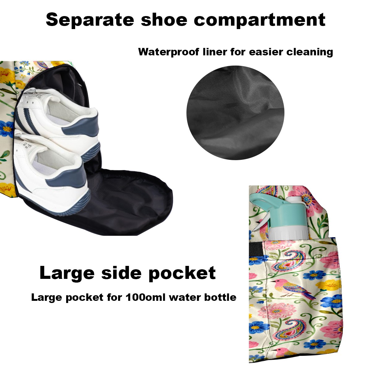 • <p>Multifunctional Gym Travel Bag Made of Twill Fabric 22cm x 48cm x 35cm (8.7in x 18.9in x 13.8in) Made of lightweight and durable twill fabric, this bag is perfect for an active lifestyle. The spacious main compartment easily holds clothing, towels, and a full set of gym gear. A smart pocket precisely stores your phone, earphones, and gym membership card. A ventilated shoe compartment can hold size 10 athletic shoes, and a waterproof wet bag isolates swimwear or sweaty clothing, effectively preventing odors and clutter. It's a professional gym bag suitable for spinning and strength training, a stylish everyday handbag, and can also meet diverse needs such as pickleball, weekend trips, and overnight stays. Combining functionality and style, it seamlessly integrates into various scenarios.<br></p>