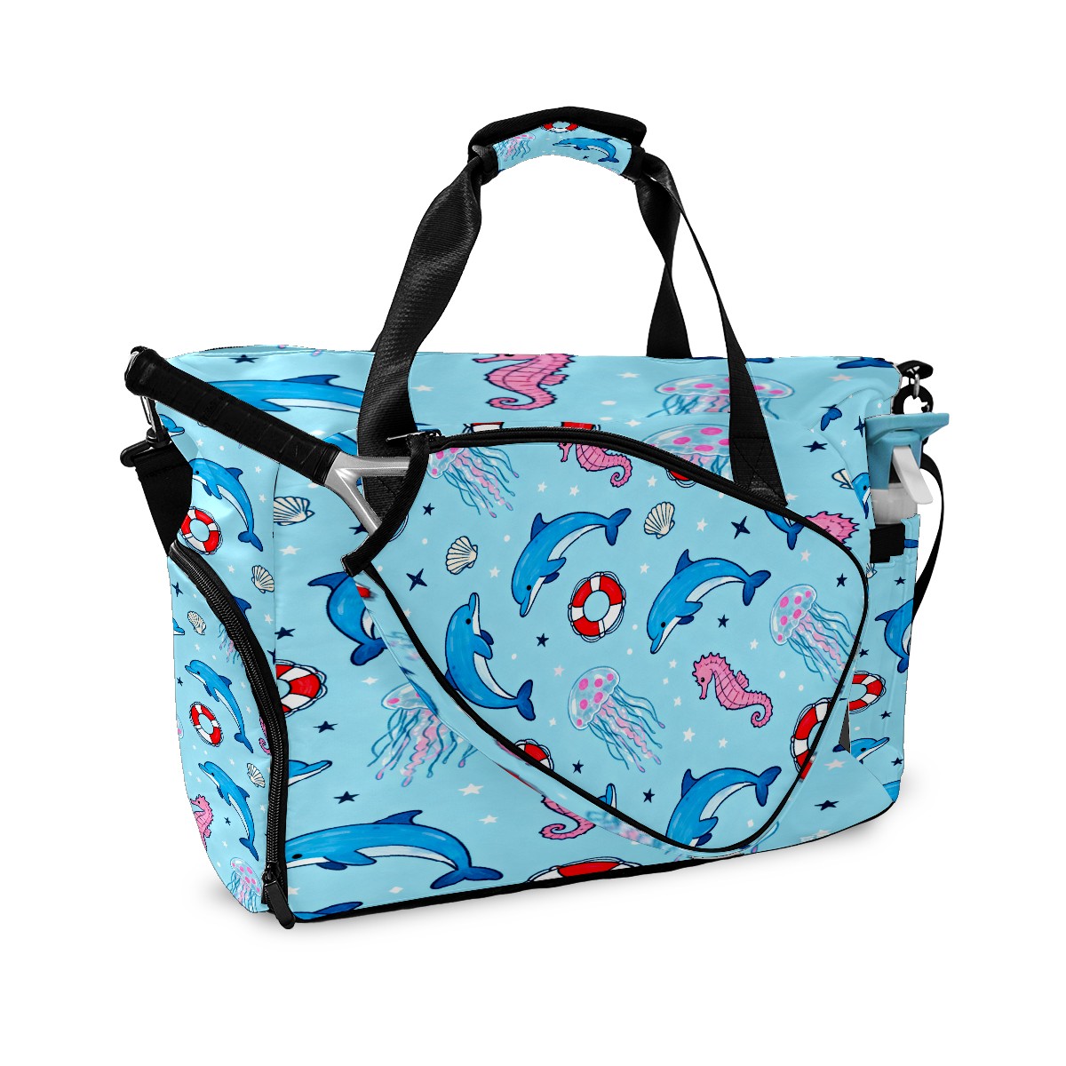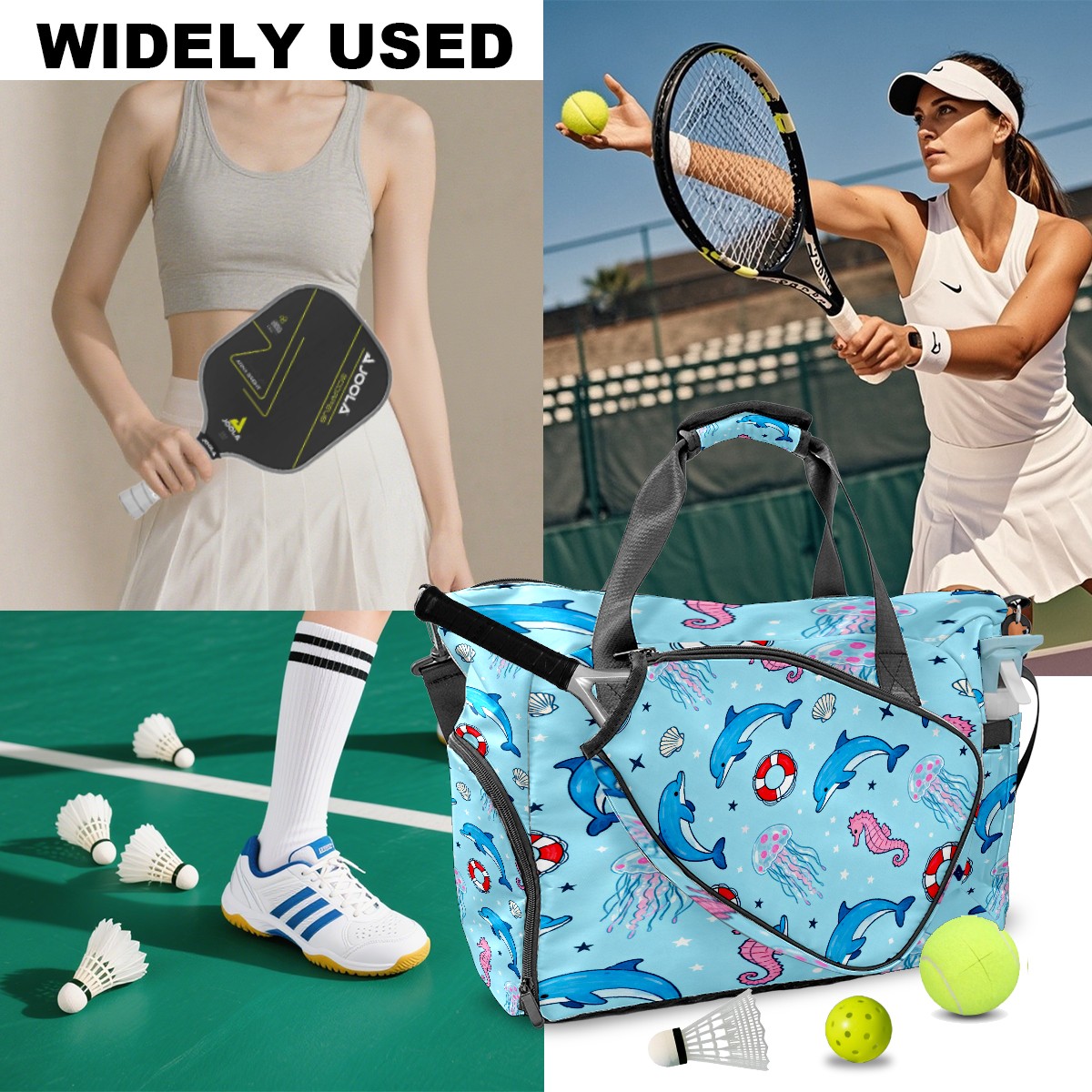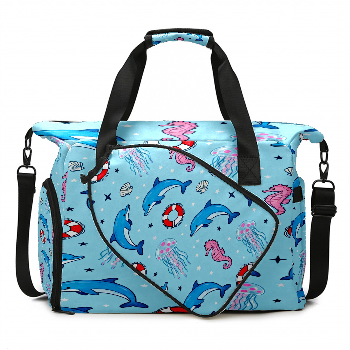 Lightweight Pickleball Tote Bag with Large Capacity, Shoe Compartment, Large Paddle Storage, Water Bottle Holder & Fence Hook for Women & Men Light Blue Ocean Pattern