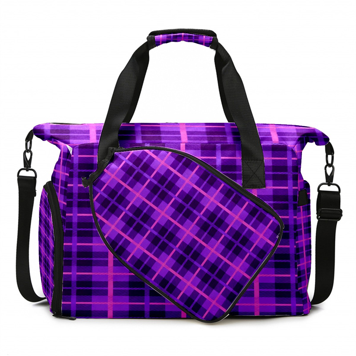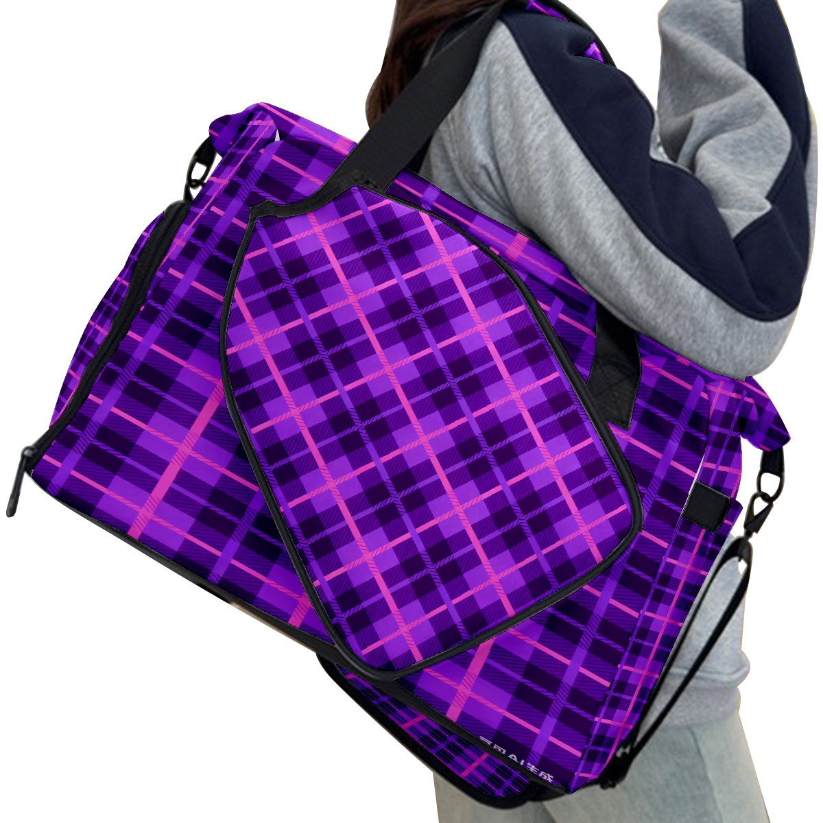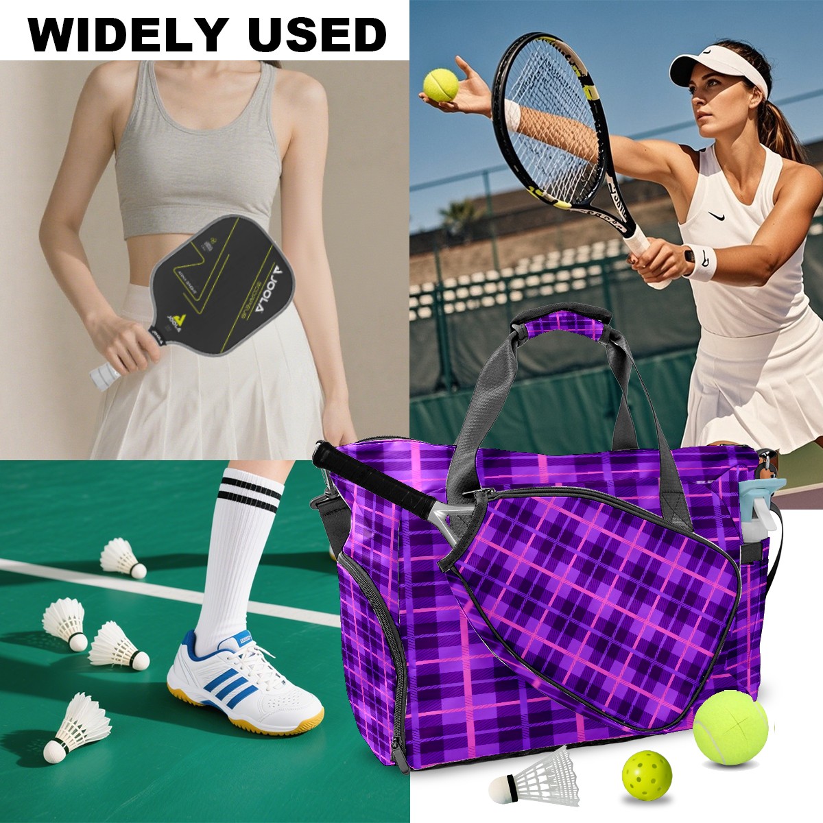 Lightweight Pickleball Tote Bag with Large Capacity, Shoe Compartment, Large Paddle Storage, Water Bottle Holder & Fence Hook for Women & Men Purple Plaid