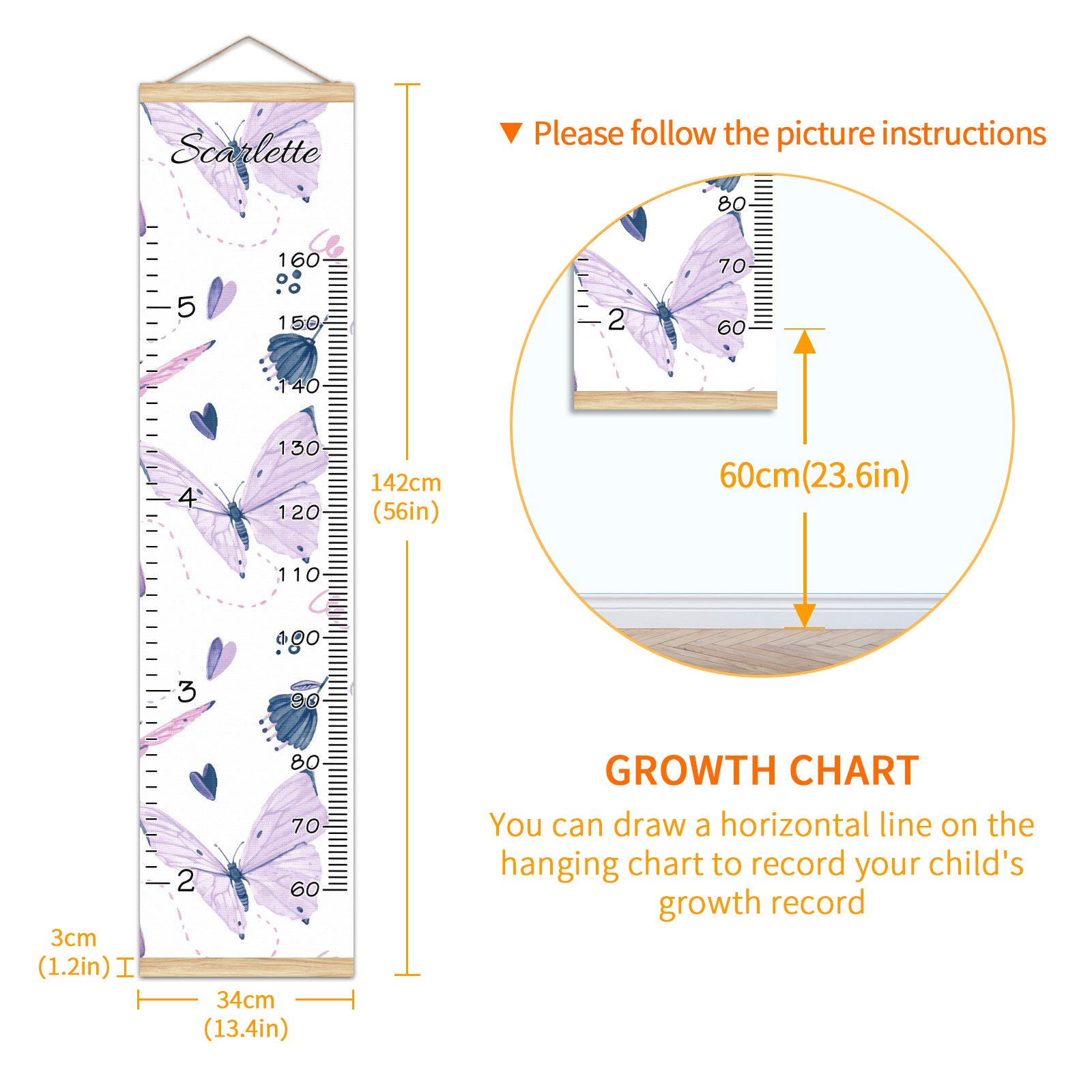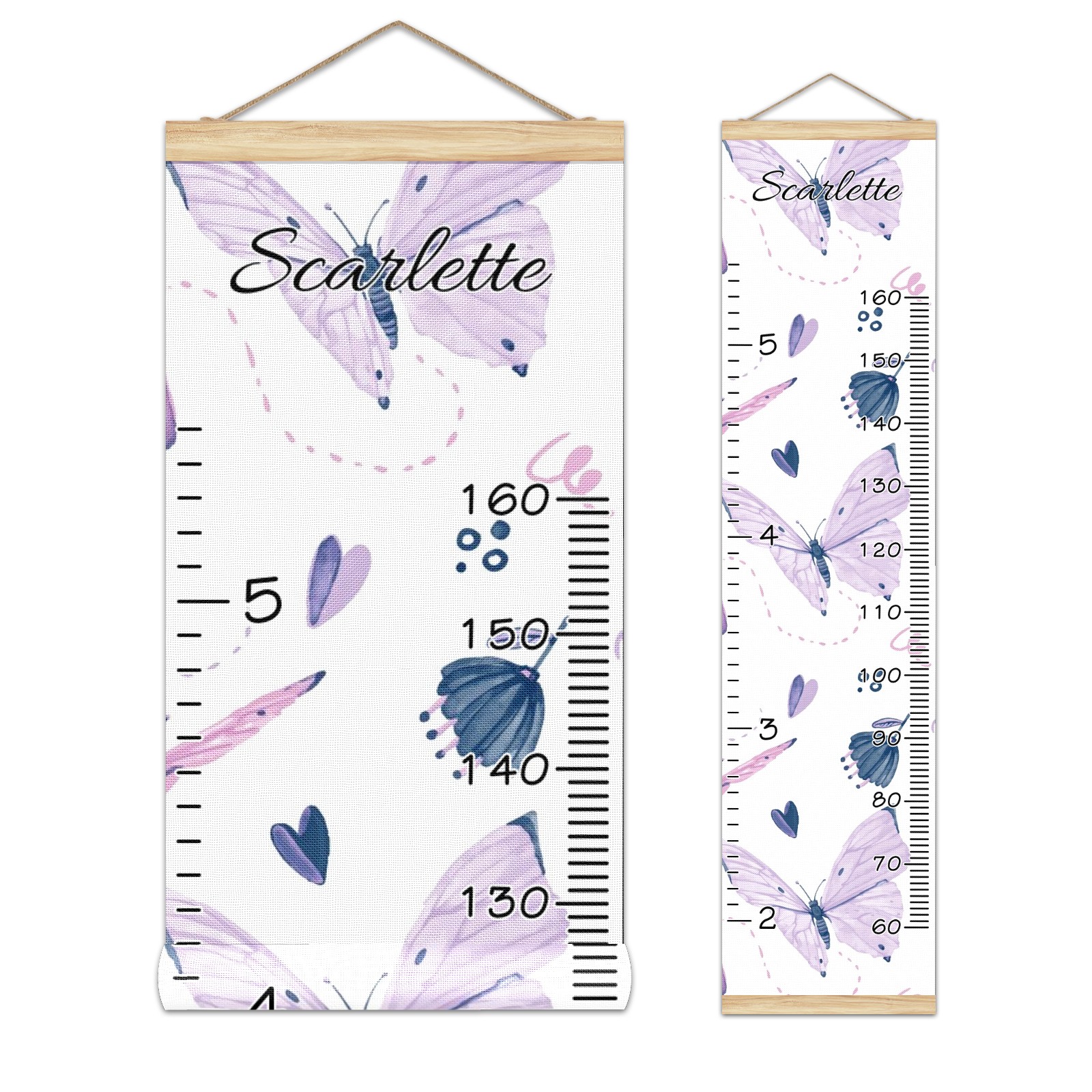 Personalized Kids Name Growth Chart Ruler for Wall Wood Frame Canvas Height Measure Chart 13.4x56 in Hanging Growth Chart Butterflies Purple11.10 Boys Girls Room Decor